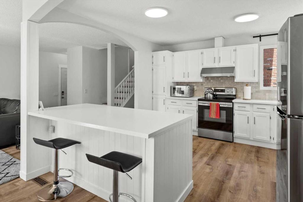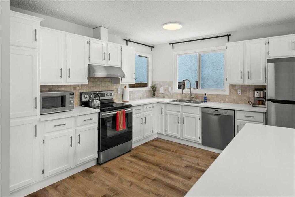 Hey Y'all! Welcome to 40 Bergen! Tucked away on a quiet cul-de-sac and backing onto lush green space, this fantastic 4-level split is ideally located in the heart of Beddington. As you enter the home you’ll immediately notice the many thoughtful upgrades throughout. The kitchen has been fully renovated, now featuring modern cabinetry, stainless steel appliances, tile flooring, and a stylish bright and functional layout. New vinyl plank flooring has been installed throughout both the main and lower levels. The main level also features a spacious and bright living room with south facing windows that seamlessly flows into the kitchen and dining area, perfect for entertaining or relaxing. Upstairs, you’ll find three generously sized bedrooms and two full bathrooms complete with vanities, tiled floors and showers, and medicine cabinets offering additional storage. The third level includes a large rec room with a floor-to-ceiling brick fireplace, a side entrance to the backyard, a renovated 2-piece bathroom, and a fourth bedroom, offering a fresh, updated space for guests or family members. There’s also a large laundry and storage room for added functionality. And the very lower level basement is ready for your finishing touches, an in-home gym or provides additional storage for your Christmas decorations and such. Additional updates from the previous owners include replaced windows, an updated roof, and an oversized double detached garage, ideal for extra vehicles or workshop space. Just 1.5 blocks from the off-leash dog park, 5 blocks to local schools, and only a few minutes’ walk to the amenities on Centre Street, the location offers unbeatable accessibility and low maintenance landscape. With easy routes to both Centre Street and Deerfoot Trail, commuting across the city is quick and convenient. This is a move-in ready home in an incredible location—don’t miss your chance to own a beautifully upgraded property with room to grow in Beddington! Book your showing today!