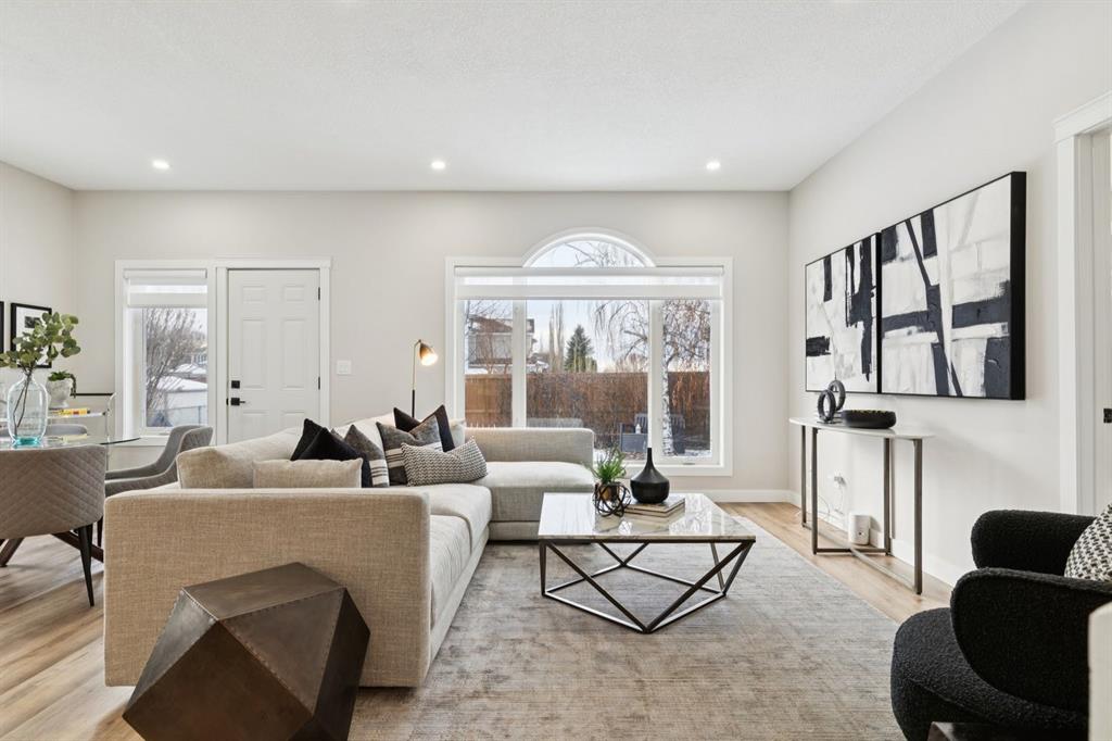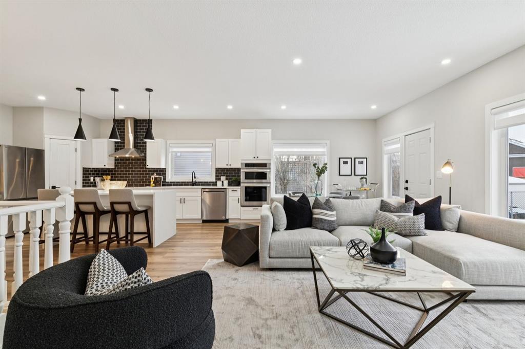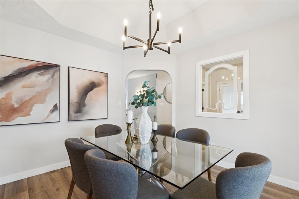 Discover unparalleled elegance in this exquisitely renovated bungalow, perfectly situated at the end of a cul-de-sac within the sought-after community of Lake Chaparral. From the moment you step inside, you are welcomed into a world of refined design and expansive living. Offering over 3,000 SqFt of meticulously developed space, this residence impresses instantly with soaring ceilings and beautiful wide-plank LVP flooring that flows throughout the open-concept main floor. The kitchen is a true showpiece, featuring an abundance of cabinetry, a corner pantry, and a striking quartz waterfall island that offers generous seating. A suite of premium stainless steel appliances, including a built-in oven and a versatile convection oven/microwave, is complemented by stylish black subway tile and designer lighting, creating a sophisticated and functional space for both everyday living and entertaining. The main floor also hosts a large, bright formal dining room with charming bay windows overlooking the front porch, and a large private office/den that captures tranquil views of the adjacent green space. The owner's retreat overlooks the backyard, complete with a walk-through closet leading to a luxurious en-suite bathroom. This spa-like space features a large soaker tub with a custom tile surround, a dual vanity, a separate shower, and the added comfort of heated flooring and a heated/LED vanity mirror. The main level is thoughtfully completed with a half bathroom, a laundry room with garage access, and ample closet space. Descend to the fully finished basement to find a vast living and recreation area, centered around a cozy gas fireplace. This level also includes three large (sound proofed) bedrooms with generous closet space and a full bathroom, providing ample room for family and guests. The home’s infrastructure has been meticulously updated, including new attic insulation, a new electrical panel, AC, a HE furnace, and a newer water tank, along with a precautionary radon fan reduction system for ultimate peace of mind. Step outside into the professionally landscaped, west-facing backyard, completed in the summer of 2025. A private gate provides direct access to a large green space, offering an idyllic setting for a walk while soaking in breathtaking views of the Rocky Mountains. This exceptional property offers a lifestyle of convenience and leisure, with four seasons of activities at the lake and easy access to Stoney Trail and the premier amenities at The Gates of Walden. This is more than a home, it's an opportunity for a life of quiet luxury and natural beauty.