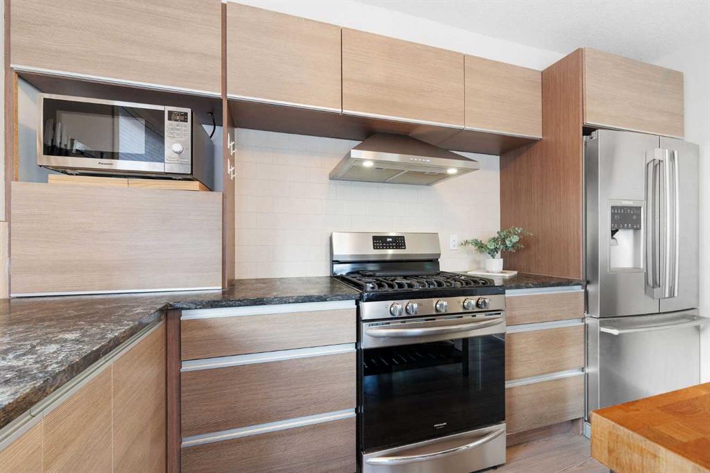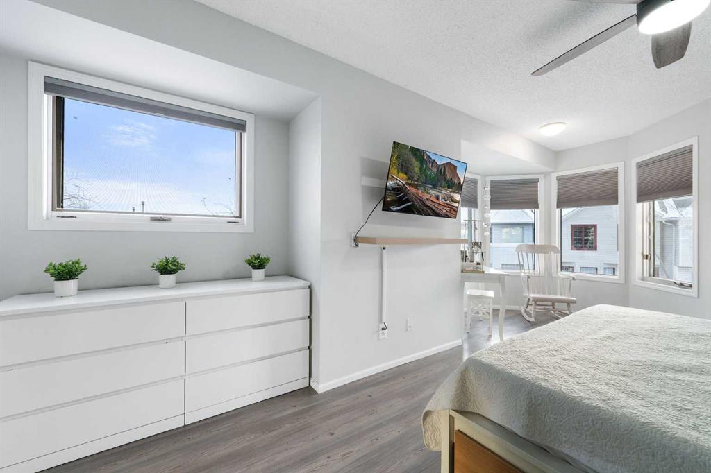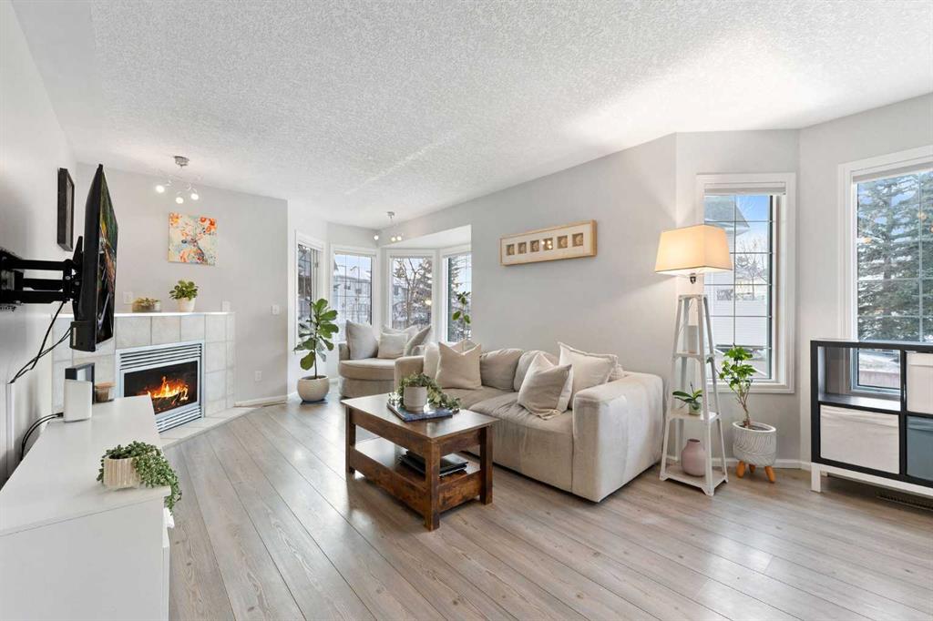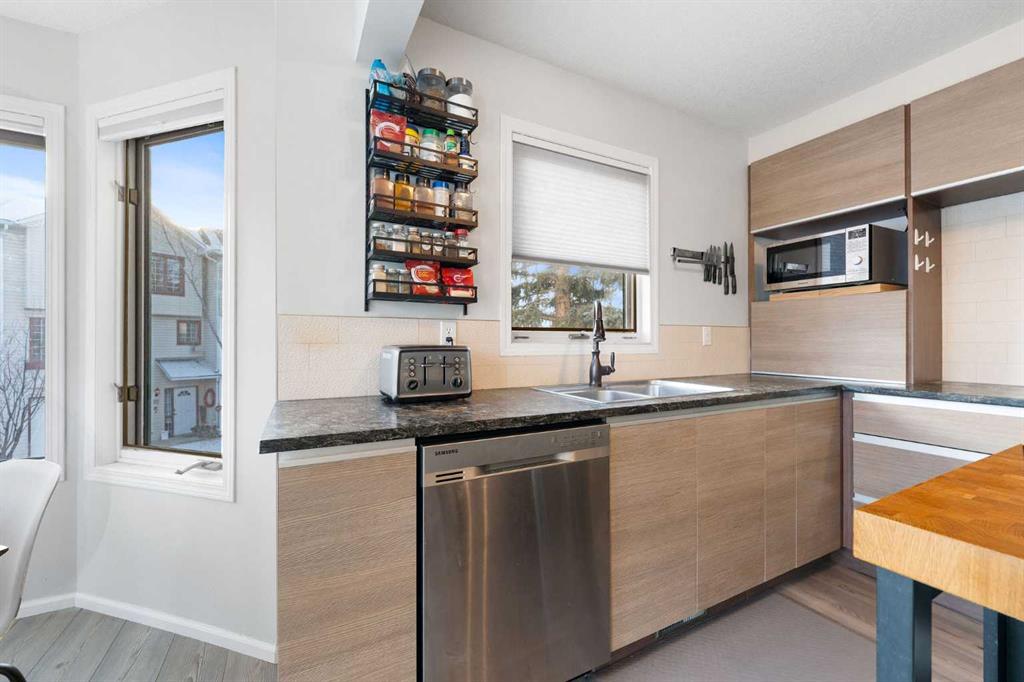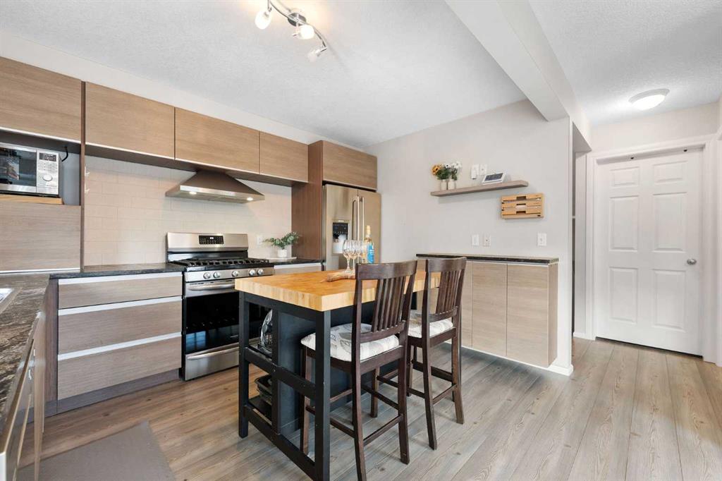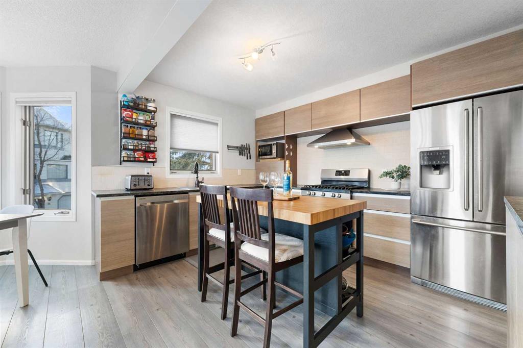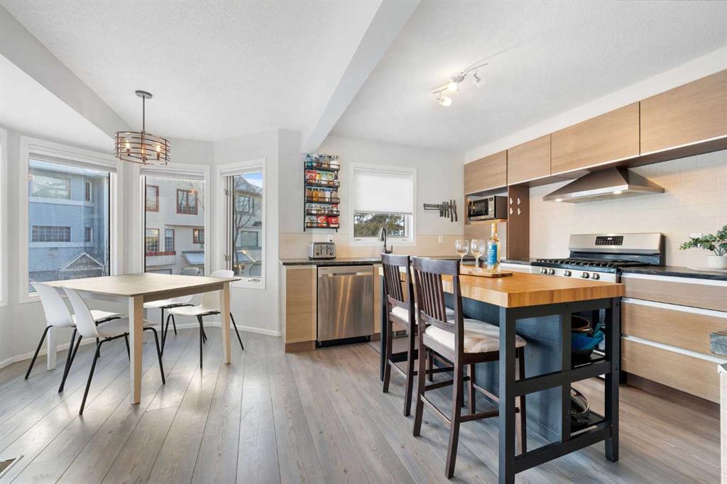 **open House Sunday Feb 1st 12:00-4:00** 2 bedroom corner unit townhome in sought after Patterson, highly updated and well maintained. End unit with large bay windows allowing tons of natural light throughout. Vinyl plank flooring runs through all levels. The fully renovated kitchen includes modern cabinetry, a full built in coffee bar, and newer stainless steel appliances. The dining area sits in a bayed turret and opens onto the rear balcony with a gas line. The living room features a gas fireplace and functional layout for everyday living. A 2 piece powder room and main floor laundry complete this level. Upstairs offers two spacious bedrooms. The primary bedroom includes a walk in closet and direct access to the 4 piece bathroom with soaker tub and separate shower. The second bedroom comfortably fits a bedroom setup with additional space for an office. Ground level access leads to a double garage with side by side parking, a rare feature in the complex. The garage includes a heater sold as is, a workstation, and access to a large heated storage and mechanical room. Capilano Gardens is a well managed complex with low condo fees. Recent updates include a new roof in 2018, refreshed decks, and repainted garage door trims. Parks, pathways, schools, Winsport, and Calgary Farmers Market West are all nearby, with easy access to downtown and the mountains.
