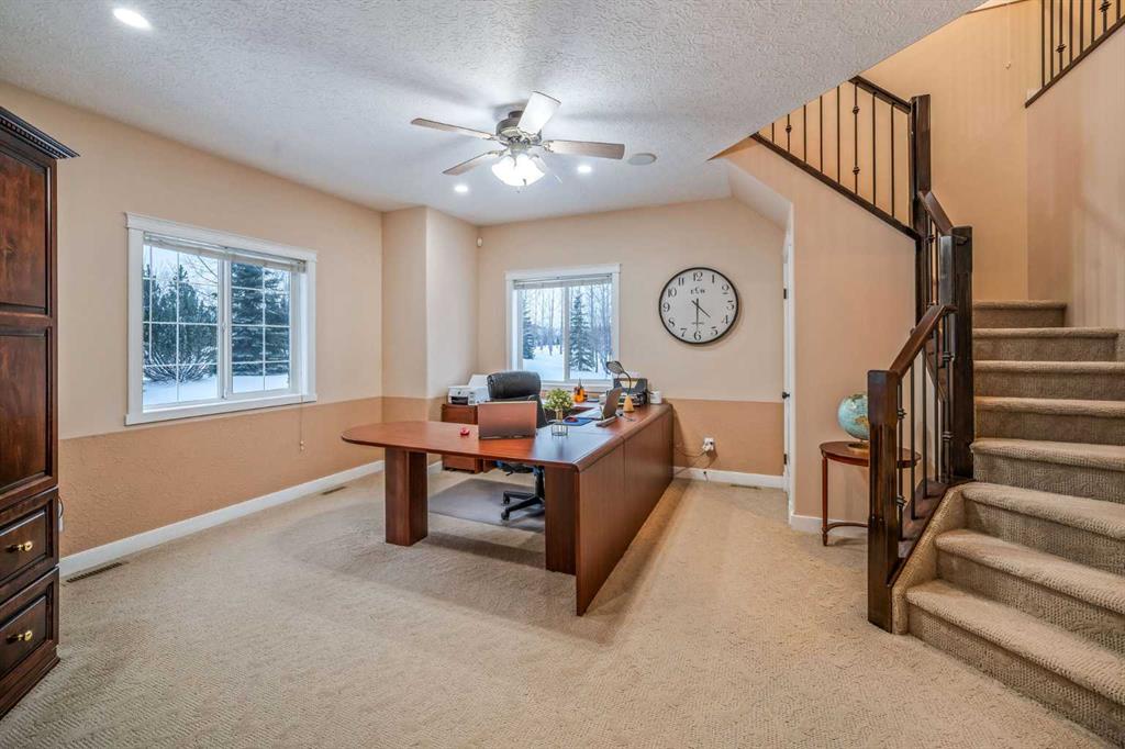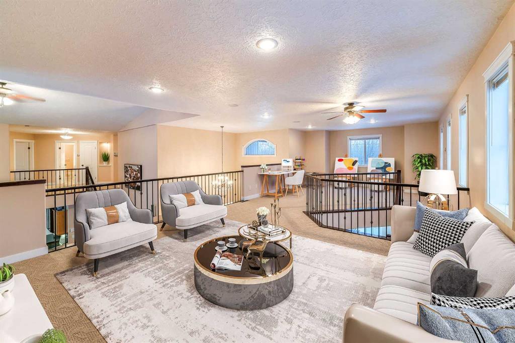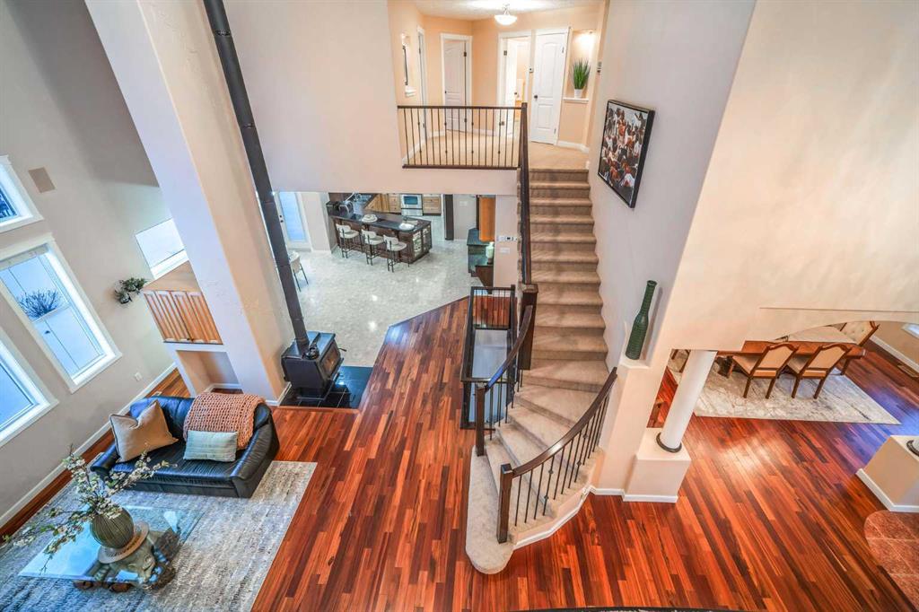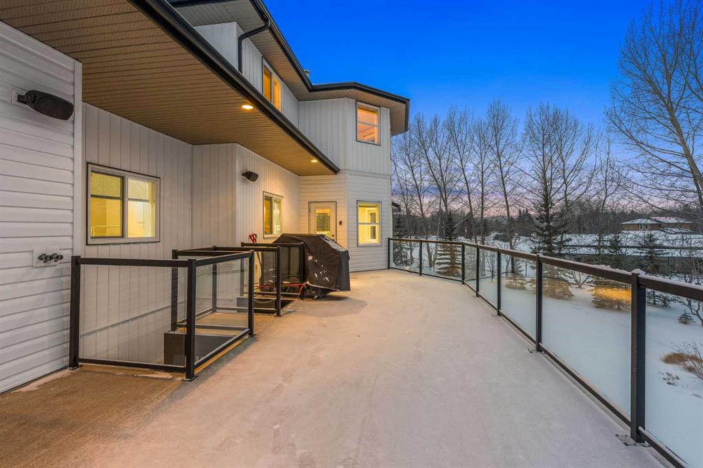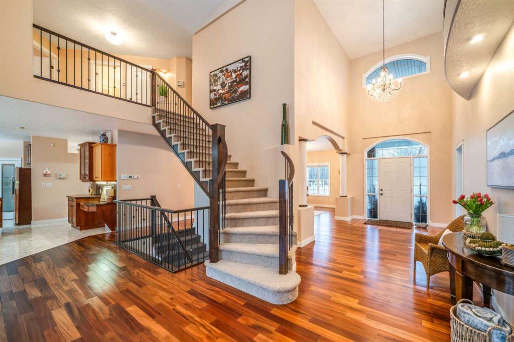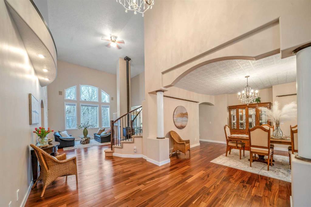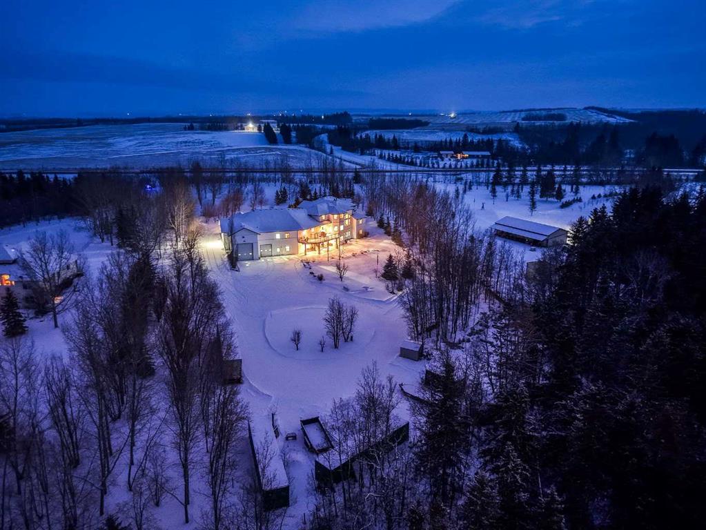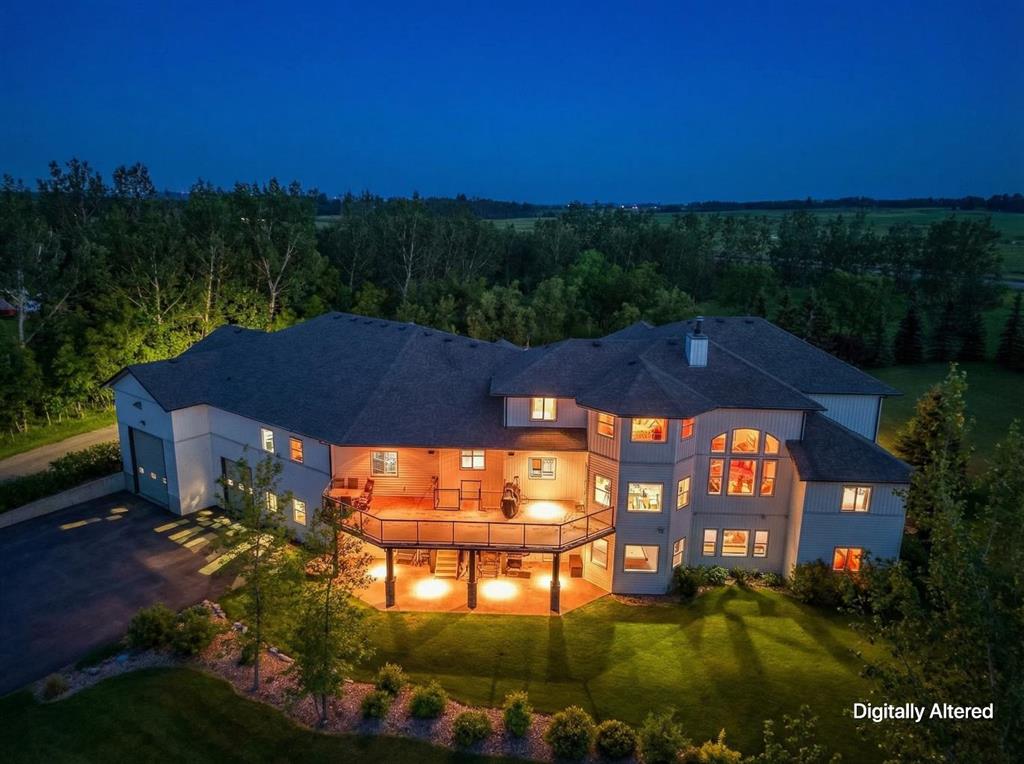 Perched high above the Red Deer River in the prestigious enclave of Olinda Meadows, this remarkable estate acreage offers a lifestyle rooted in space, privacy, and everyday ease - just ten minutes from Red Deer shopping, dining, and services, with Canyon Ski Lodge and Parkland Nurseries only moments away for year-round outdoor enjoyment. Set on 3.01 beautifully treed acres, the property is introduced by a gated, meandering driveway that winds through mature trees and opens to a home that feels both commanding and welcoming. Elevated topography delivers sweeping views, dramatic skies and constant connection to nature, with birdlife and wildlife as part of the daily rhythm. With over 10,000 square feet of developed living space, this residence was purpose built for families who value room to gather, entertain and grow. Soaring ceilings, beautiful hardwood flooring and expansive windows create an open and airy feel throughout. A formal dining room sets the stage for special occasions, while the bright dining nook offers a relaxed space for everyday meals and opens directly onto a sprawling deck that spans the width of the home, perfect for summer gatherings, dining al fresco or enjoying a quiet morning coffee surrounded by treetops. The kitchen is designed for function and flow with a walk in corner pantry, generous cabinetry and seamless connection to the main living areas. A main floor home office, dedicated laundry and sewing room, and thoughtfully designed storage including multiple storage rooms add to the home’s exceptional livability. The flex loft overlooking the main level provides additional space for work, play or retreat. Two wood burning stoves anchor the home with warmth and comfort, creating cozy gathering spaces year round. The walkout lower level mirrors the lifestyle above with expansive recreation areas, custom bar and theatre room, while offering shaded outdoor enjoyment on warm days, allowing you to choose how and where you take in the surrounding beauty. A gym area in the mezzanine of the impressive shop adds yet another layer of versatility. A true standout, the massive attached shop with soaring ceilings accommodates a motorhome, multiple vehicles, workshops, storage and hobbies with ease, ideal for enthusiasts and business owners alike. RV parking and services further enhance the lifestyle. Built with pride and exceptional care, upgrades include newer exterior siding, shingles, 2x8 wall construction with staggered studs, forced air and hot water heating with dual boilers and fan coils, two air conditioning units, paved circular drive, security gate and camera system. Unique artistic wall engravings reflect the craftsmanship and character found throughout, reinforcing that this is a home meant to be experienced in person. Lovingly maintained by the original owners who built it from the ground up, this is a rare opportunity to secure a legacy acreage that blends privacy, quality construction and convenience into one extraordinary forever home.