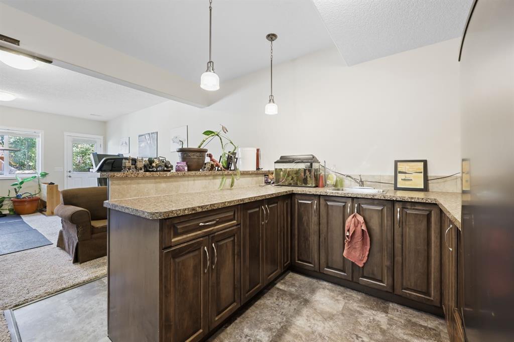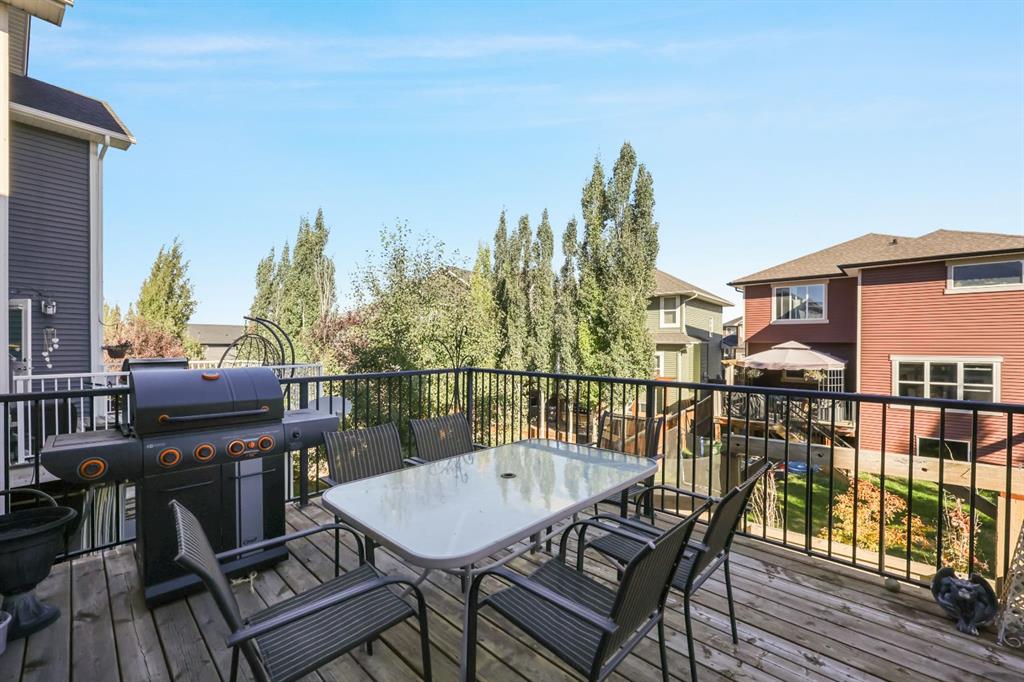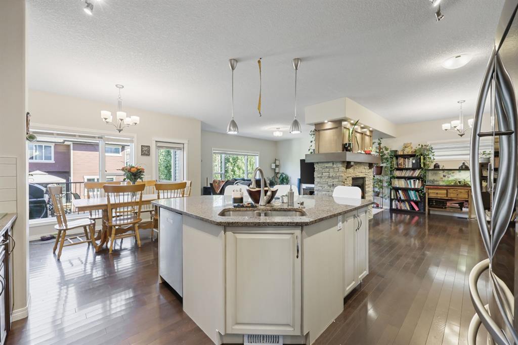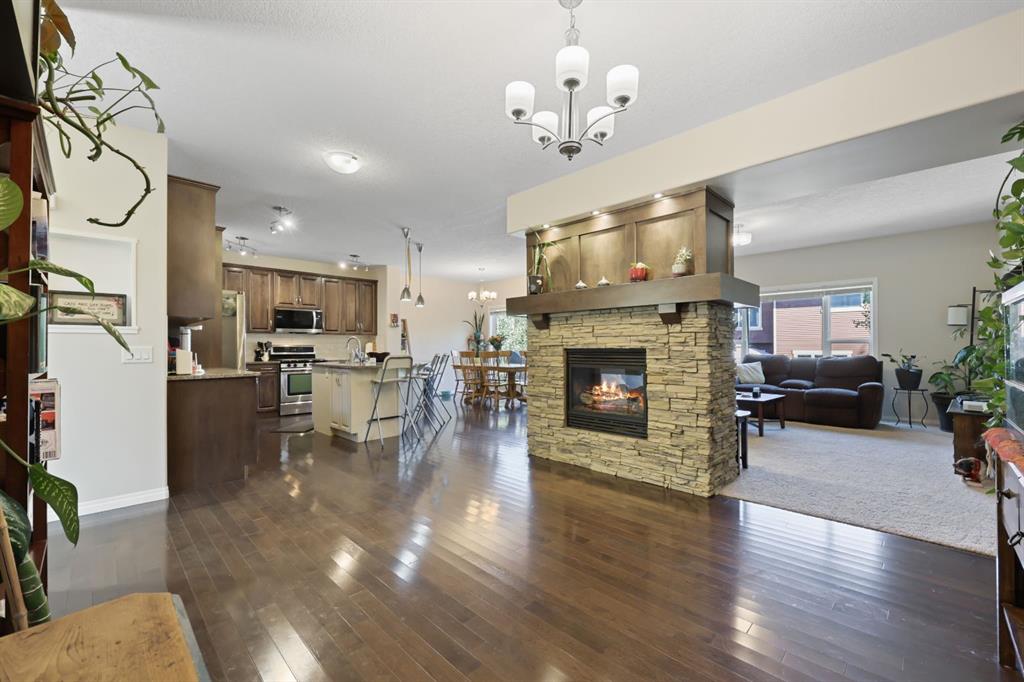 This executive two story WALK OUT home has 3 bedrooms, laundry, and a family room on the upper level with large windows to let in lots of natural light. The main floor features an open concept layout with a kitchen hosting granite countertops, a walk though pantry a spacious living room and a formal dining room, all enhanced by a double sided gas fireplace framed in exquisite stonework. A deck adjacent to the kitchen suitable for an outdoor patio, includes a gas BBQ hook up. The kitchen is equipped with a gas stove, refrigerator featuring a water/ice dispenser with an illuminated front door, and a newly installed dishwasher. The basement contains a private "mother in law" living area with its own laundry facilities, private entrance and privacy door from upstairs. The residence is warmed with forced air heating and cools you with AC! It also offers an attached heated double car garage with spacious back entry coat area and a significant storage room in the basement. The lower patio brings some privacy space, and a cozy sitting area Nearby walking path lead to Jumping Pound Creek, and paths to downtown.