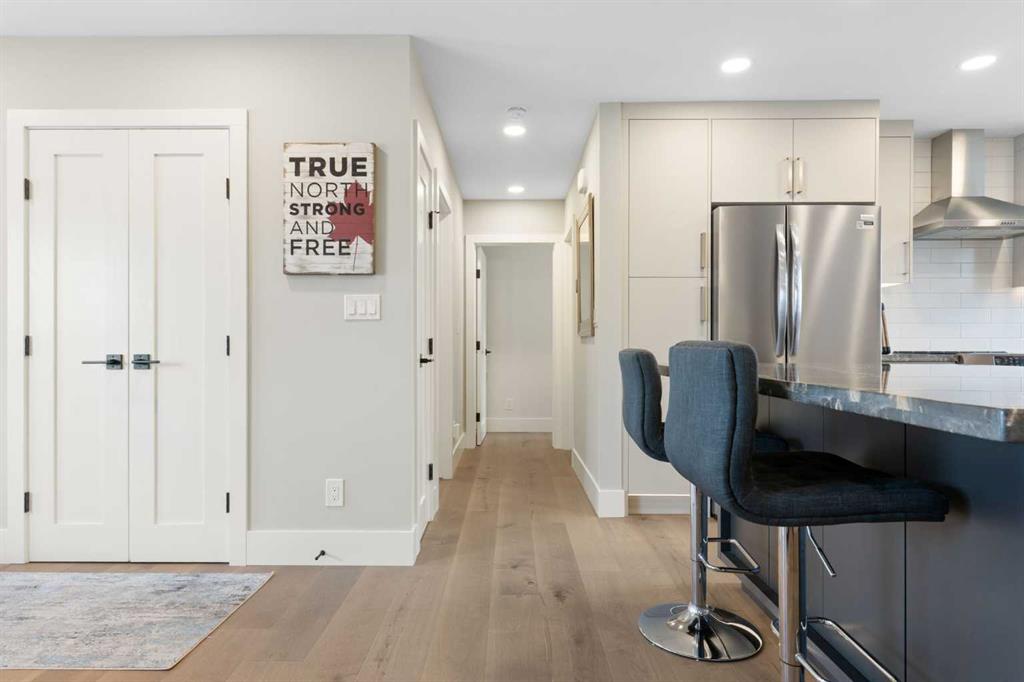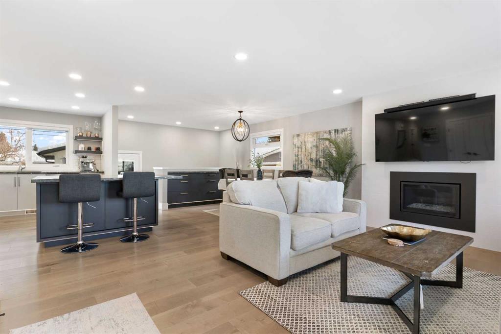 Welcome to 9936 Maplecreek Drive SE, a beautifully reimagined elevated bungalow nestled in the heart of the highly coveted Maple Ridge community. Showcasing a striking modern mid-century aesthetic, exceptional craftsmanship, and SMART home living, this residence offers a seamless blend of timeless design and contemporary luxury. With 1,115 sq. ft. of thoughtfully designed living space above grade and an additional 900 sq. ft. of fully developed basement, the home features 4 bedrooms and 3 bathrooms—perfectly suited for families, professionals, and those who love to entertain. The exterior has been meticulously transformed with refreshed stucco, sleek black windows, refined architectural detailing, and elegant Glowstone front lighting. Professionally landscaped grounds showcase exposed aggregate concrete steps, a wraparound patio, and a custom-built pergola with ambient string lighting—creating inviting outdoor spaces ideal for both intimate evenings and larger gatherings. Elevated from the street, the home enjoys enhanced privacy and striking curb appeal. Inside, the open-concept main floor is bathed in natural light and enhanced by custom built-ins, powered blinds throughout, and a Bluetooth-enabled smart gas fireplace that anchors the living area. The designer kitchen is both stunning and functional, featuring two-toned grey cabinetry with gold accents, Italian marble countertops, under-cabinet and toe-kick lighting, and a spacious island with seating for three. An under-mounted sink overlooks the backyard, while newer appliances include an induction cooktop with air-fry capable oven and an upgraded refrigerator. The primary suite offers a serene retreat, complete with his and hers custom walk-in closets and a spa-inspired 4-piece ensuite with dual vanities, marble countertops, and a custom glass-enclosed shower. One additional bedroom and a beautifully appointed 4-piece bathroom complete the main level. The fully finished basement provides versatile living and entertaining space, featuring a media area, games space, and wet bar, along with two additional bedrooms, a 4-piece bathroom, epoxy-coated laundry flooring, a basement subfloor system, sump pump, and exterior French drain. WiFi-enabled washer and dryer are included. The refinished 25’x 23' double garage accommodates larger vehicles and storage needs and includes a WiFi-enabled garage door opener and EV charger. Additional upgrades include new electrical, HVAC, Carrier air conditioning, a smart Ecobee Premium thermostat with secondary sensor, water softener (excluding kitchen cold and exterior taps), upgraded attic insulation (previously R50), electronic programmable deadbolts, and a 7.29 kW solar panel system delivering enhanced energy efficiency and reduced utility costs. Impeccably finished and truly move-in ready, this exceptional home is steps from top-rated schools, parks, shopping, and everyday amenities—offering a rare opportunity to own in one of Calgary’s most desirable communities.