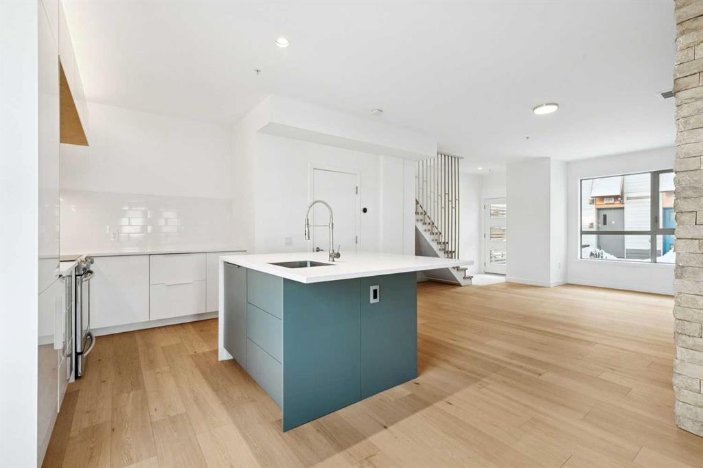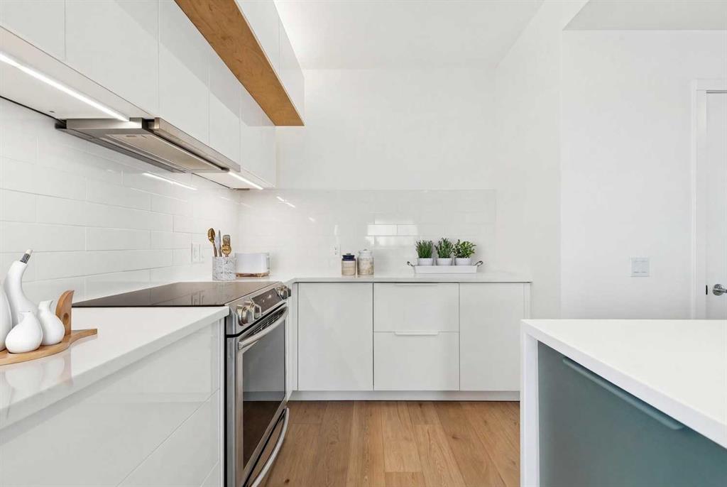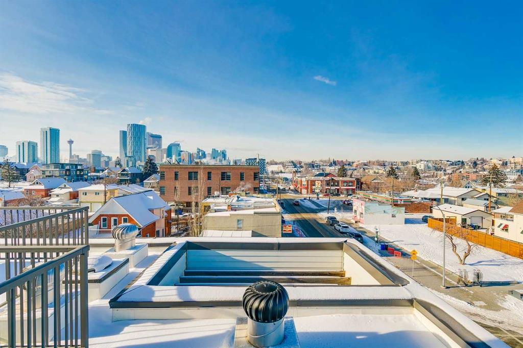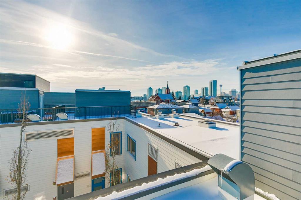 This impressive 1,187 sq. ft. premier townhome in the sought-after Vento complex truly has it all. Ideally located in the heart of historic Bridgeland, you’re just steps from trendy shops, popular restaurants and pubs, parks, the Bow River Pathway, and the LRT, with downtown Calgary and the Calgary Zoo only minutes away. This fully renovated home features 3 outdoor living spaces, 2 bedrooms plus a den, 2 bathrooms and 2 TITLED UNDERGROUND PARKING STALLS, along with a secure storage locker and dedicated bike storage. The Vento is a well-managed, LEED-certified green building designed for energy efficiency and comfort, complete with a Lifebreath Heat Recovery Ventilator that circulates fresh air throughout the home. Your private front entrance leads into a bright, open-concept main floor with 9-foot ceilings, hardwood flooring, and large windows that flood the space with natural light. The spacious living and dining areas flow seamlessly into the well-appointed kitchen, featuring ceiling-height cabinetry, ample counter space, stainless steel appliances and an island — perfect for both everyday living and entertaining. Upstairs, you’ll find a den, two generously sized bedrooms, and a full bath. The south-facing primary bedroom has a private ensuite and French doors that open onto a private balcony overlooking the courtyard. The real highlight - an expansive ROOFTOP PATIO, where you can relax or entertain while taking in the stunning downtown skyline — a rare and highly desirable urban luxury! Additional comforts include in-suite laundry and in-floor radiant heating. Combining space, sustainability, and an unbeatable inner-city location, this townhome offers outstanding value and lifestyle in one of Calgary’s most desirable communities. Book your private showing today.