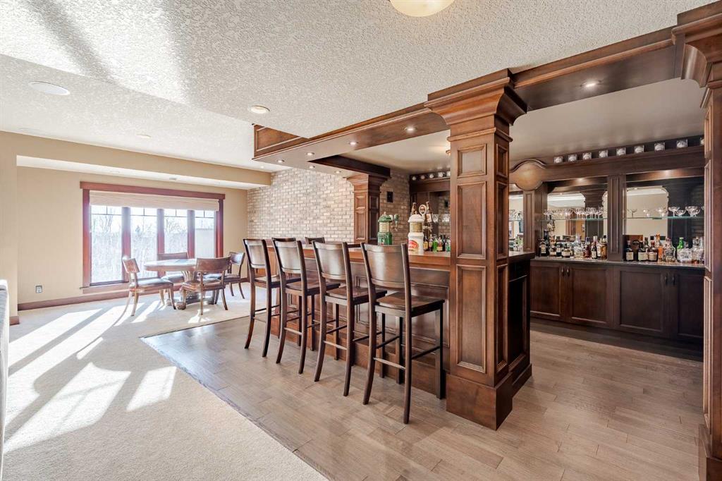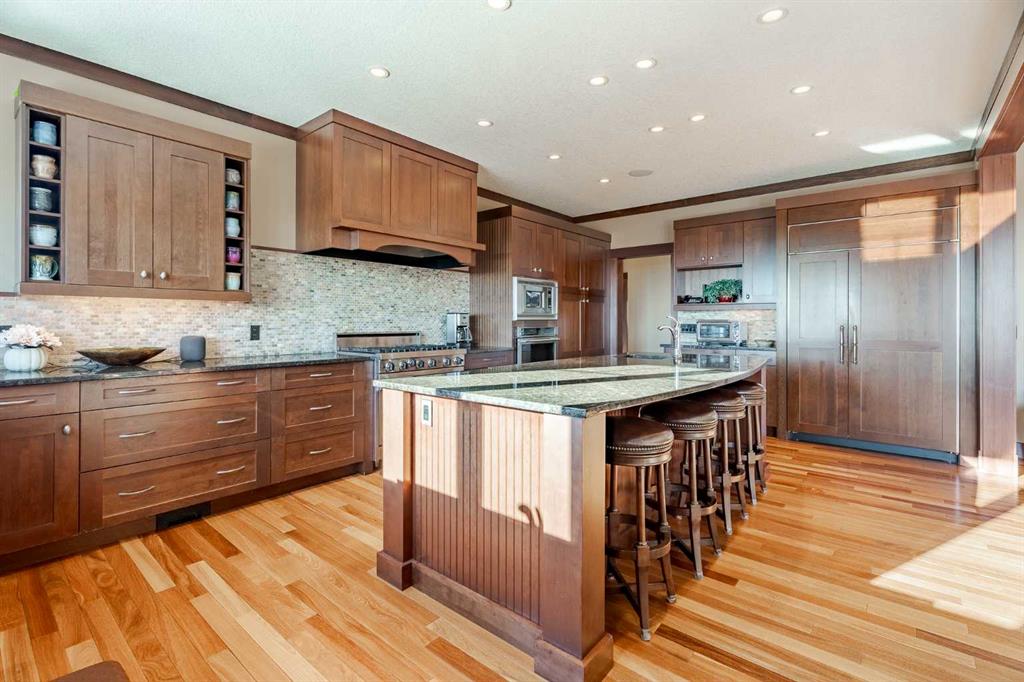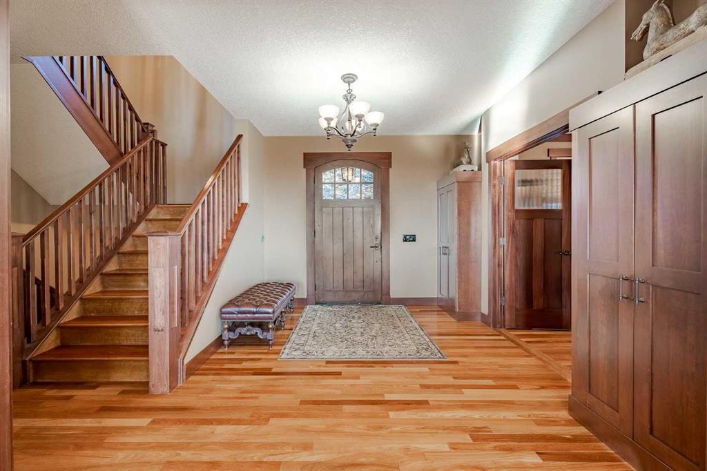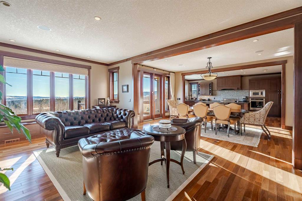 Perched on one of the most coveted lots in Hawks Landing, this extraordinary custom-built estate captures breathtaking, unobstructed views of the rolling valley and endless eastern Foothills. With nearly 4,800 sq. ft. of fully finished living space, this executive residence is a masterclass in timeless design, refined craftsmanship, and elevated country luxury. The striking exterior blends natural stone, cedar shakes and timber detailing setting a tone of understated elegance from the moment you arrive. Inside, a grand open-concept main floor unfolds beneath soaring ceilings and walls of windows that frame the landscape like living artwork. Brazilian teak hardwood flooring, rich stained wood casings, baseboards, and solid interior doors add warmth and sophistication throughout the main and upper levels. The heart of the home is the stunning gourmet kitchen and great room, anchored by a stone-faced fireplace and flowing seamlessly into a spectacular dining space overlooking the Foothills. Designed for both daily living and memorable entertaining, the kitchen features a high-end gas range, granite countertops, an oversized island with seating, and abundant prep space—perfect for intimate family meals or hosting on a grand scale. Upstairs, four beautifully appointed bedrooms each enjoy private balcony access, offering serene outdoor moments and panoramic views. The primary suite is a true retreat, complete with a double-sided fireplace, sitting area, and a spa-inspired ensuite featuring a walk-in steam shower, deep soaker tub, and a custom walk-in closet with built-ins worthy of the most discerning wardrobe. The fully developed walkout lower level is an entertainer’s dream, featuring in-floor heating, a spacious family room, fifth bedroom or den, four-piece bath, a custom-built English pub, and wine room—ideal for evenings spent hosting friends or unwinding in style. Step outside to the expansive east-facing deck, where sunrise views stretch endlessly across the Foothills. Extensive, professionally designed landscaping transforms the backyard into a private paradise, equally suited for quiet reflection or lively gatherings. A triple attached garage completes this exceptional offering. This is luxury living immersed in nature, just 10 minutes from Calgary, with quick access to Bragg Creek, Canmore, Banff and the mountains offering endless outdoor recreation. Thoughtfully designed sight lines from the grand entrance immediately draw your eye to the view beyond—an architectural reminder that this home was built to celebrate its remarkable setting. A rare opportunity to own a custom executive masterpiece in one of Priddis Green’s most prestigious communities—where sophistication, serenity, and panoramic beauty converge.
