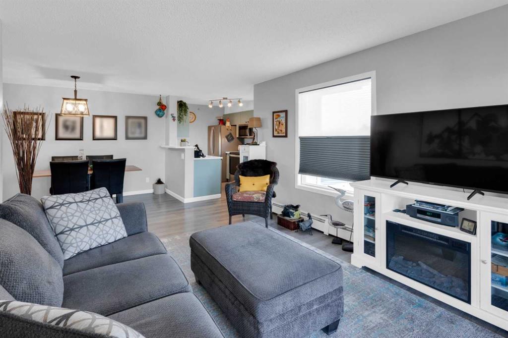 Welcome to MacKenzie Pointe, a well-maintained condo complex ideally located in the heart of Airdrie. This updated top-floor corner, 2-bedroom, 1-bathroom unit offers exceptional privacy with no neighbours above and only one shared wall. Enjoy a walkable lifestyle just steps from shopping, restaurants, health services, and the pathways and activities of Nose Creek Park. Inside, the bright corner layout creates an open, welcoming feel. The kitchen features contemporary coloured cabinetry and stainless steel appliances (2022), including a convection oven with air-fryer function, dishwasher, microwave with hood fan, and a refrigerator with bottom-drawer freezer. A farmhouse sink with pull-down faucet adds both style and everyday practicality. Recent updates include a new washer and dryer (2025), updated switch plates, upgraded lighting, and ceiling fans in both bedrooms. Foil-lined sunshades in the kitchen and living room improve year-round comfort, while mirrored closet doors enhance light and storage. The bathroom features a professionally refinished bathtub that's easier to clean. Step outside to a large two-sided balcony, perfect for relaxing or enjoying evening sunsets. The unit includes titled, heated underground parking located near the elevator, complete with a lockable storage area. Condo fees conveniently cover electricity, heat, water, sewer, and waste removal. A rare combination of location, privacy, and thoughtful updates within MacKenzie Pointe — this is condo living done right.