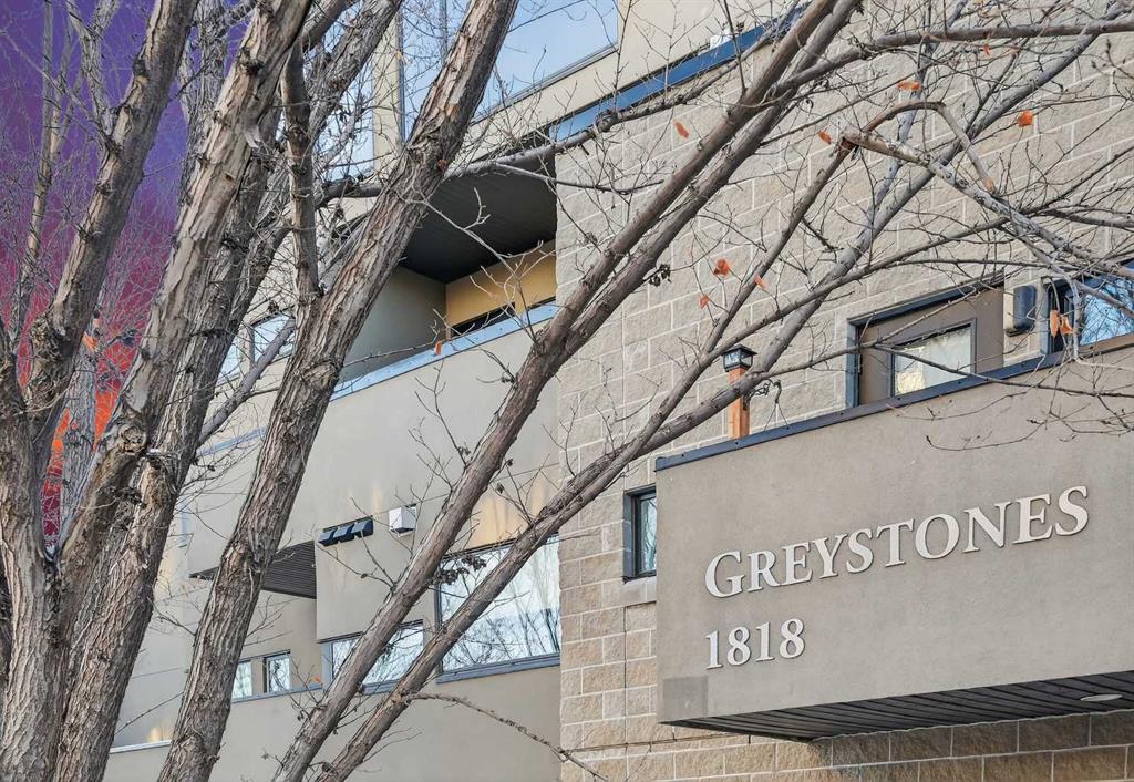 Welcome to The Greystones, a timeless and highly sought-after residence nestled in the heart of Lower Mount Royal, one of Calgary’s most desirable inner-city neighborhoods. Just steps from vibrant 17th Avenue SW, this exceptional location places you at the centre of it all. Enjoy world-class dining, boutique cafés, charming shops, green spaces, schools, and effortless access to public transportation, all right outside your door. This beautifully appointed 1 bedroom plus den, 1.5 bathroom home is located on the third floor and showcases a thoughtfully designed open-concept layout filled with warm west-facing natural light throughout the day. From the moment you enter, you’ll appreciate the sense of space, comfort, and quality. The kitchen is both elegant and functional, featuring granite countertops, stainless steel appliances, a gas range, and rich cabinetry that flows seamlessly into a spacious dining area. Just off the kitchen, the dedicated den offers the perfect space for a home office, reading nook, or creative studio, ideal for today’s work-from-home lifestyle. The inviting living room is anchored by a striking concrete-mantle gas fireplace, creating a cozy yet sophisticated atmosphere for relaxing or entertaining. Step outside onto the private west-facing balcony, where mature trees provide a lush summer canopy and a tranquil setting to unwind at the end of the day. The generous primary bedroom is a true retreat, complete with a walk-in closet and a beautifully finished four-piece ensuite bathroom. Recent updates include fresh paint throughout and brand-new carpeting, ensuring the home feels move-in ready and impeccably maintained. Additional conveniences include a titled underground parking stall and an oversized storage locker, adding exceptional value and everyday practicality. This is inner-city living at its finest. A rare opportunity to own a refined home in an unbeatable location. Come view today and experience it for yourself.