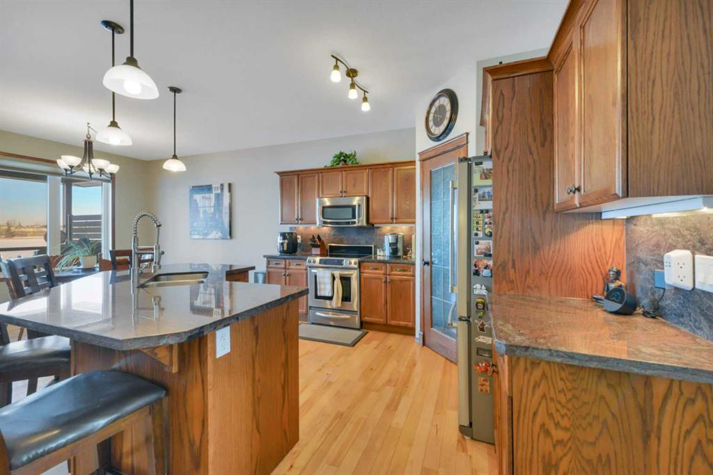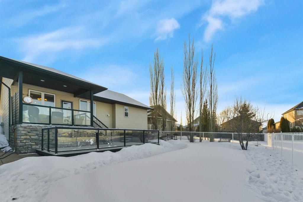 Backing onto a GREEN SPACE, this open concept bungalow is fully finished with FIVE bedrooms and a heated TRIPLE ATTACHED GARAGE!! The open concept main level is bright and inviting, there are hardwood floors throughout the main level, a large bank of windows allow natural light to fill the space, and there is a cozy gas fireplace in the living room. The kitchen includes a large center island, granite counter tops, a corner pantry and stainless appliances. The dining area is nicely connected to the kitchen and living room and offers ample room for family gatherings. There is a front bedroom/office and 2 additional bedrooms on the main level including the large main bedroom with it's own ensuite! Main floor laundry and a full bath complete the top level and once downstairs the fully finished basement comes with infloor heat, 2 large bedrooms, and big rec room and separate flex room - perfect for a craft room, media room, or home gym!! The rear yard is fully fenced and landscaped with a beautiful deck and the hot tub stays!! The large front driveway offers plenty of room to park your RV, there are underground sprinklers, floor drains in the garage and 8' garage doors.