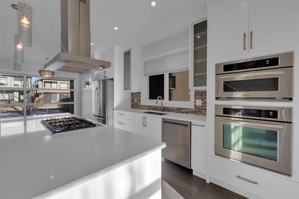 OPEN HOUSE on Saturday, Jan. 31. from 1pm-5pm! Welcome to Richmond/Knob Hill! This beautifully finished home offers 4 bedrooms, 3.5 bathrooms, a thoughtful layout, and a fully developed basement—truly a standout property. The bright, open-concept main floor features 9-foot ceilings, hardwood floors, and oversized windows that fill the space with natural light. The tiled front entry includes a spacious closet with French doors and custom organizers (no wire shelving in this house!), leading into a generous living room perfect for entertaining or settling in for a movie night. The chef-inspired kitchen boasts quartz countertops, a large island, ceiling-height cabinetry, a gas cooktop, built-in wall oven and microwave, and a pantry with custom shelving. It flows seamlessly into the dining area, which comfortably seats eight and is anchored by a gas fireplace with built-ins and a south-facing window. A discreetly positioned 2-piece powder room and a mud room with French door closet and additional built-ins complete the main level. Upstairs, an extra-wide staircase and skylight create an inviting transition to the second floor, where you’ll find 9-foot ceilings and an ideal layout. The private primary suite overlooks the backyard and includes a spacious 5-piece ensuite with dual vanities, a deep soaker tub, an oversized shower, and a dreamy walk-in closet with extensive built-ins. Two additional large bedrooms sit at the opposite end of the home, each with built-in closets, large windows, and a shared balcony complete with soffit lighting. A 4-piece bathroom with quartz countertop and a dedicated laundry room with soft-close cabinetry complete this level. The basement feels anything but below-grade, thanks to large windows and cozy in-floor heat. The rec room offers a great space for family time and includes a well-appointed wet bar. A fourth bedroom with two windows and a huge walk-in closet sits next to a full 4-piece bathroom. Additional highlights include a linen closet, ample storage, and an exceptionally tidy utility room. Outside, the sunny south facing backyard features a lovely deck and leads to a detached double garage (insulated and drywalled). *LOCATION - 5 minute walk to Richmond Elementary, 3 kms to Mount Royal University, 10 blocks to Marda Loop, easy access to all major commuter routes and only a 10 minute drive into downtown. *BONUS - central vac rough-in, sump pump, freshly painted, professionally cleaned and move-in ready!
