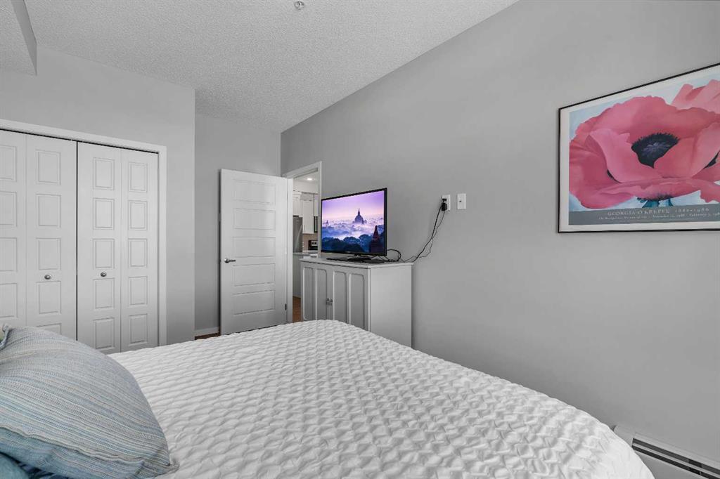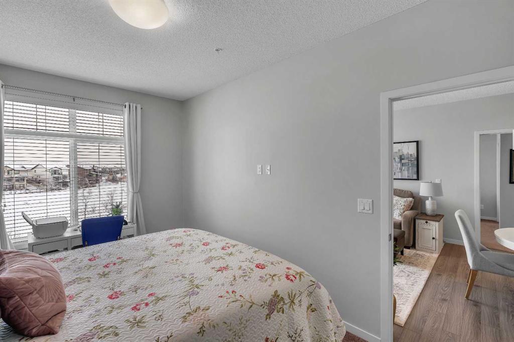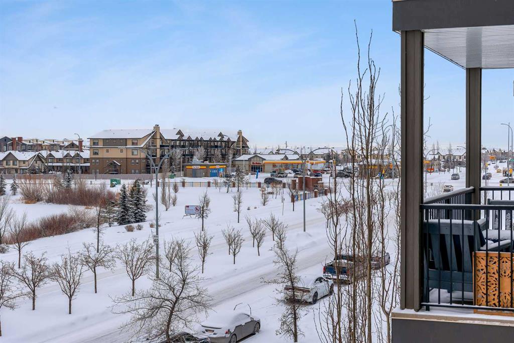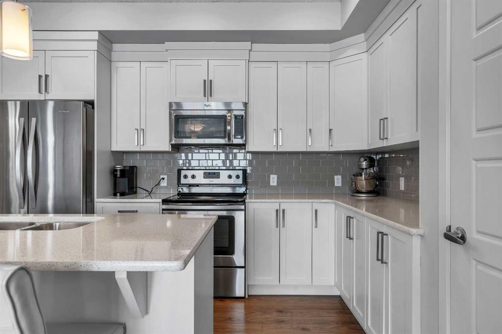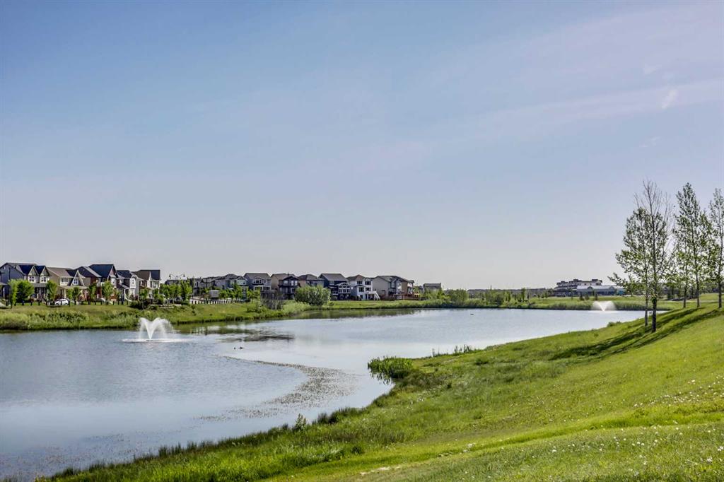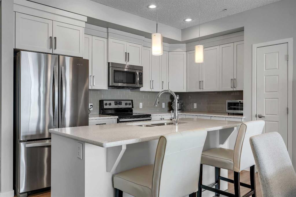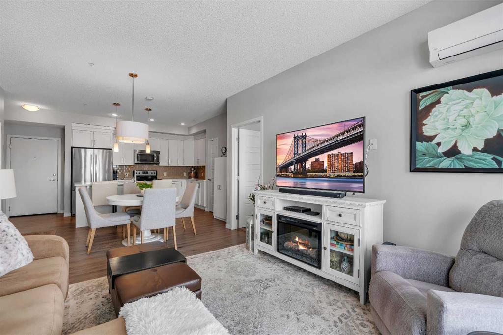 Welcome to this light-filled and beautifully designed 2-bedroom, 2-bathroom condo in the highly sought-after community of New Brighton. Offering a fantastic layout with 9-foot ceilings and triple-pane windows, this bright and airy unit is filled with natural light and designed for comfortable, modern living. The open-concept kitchen is a true standout, featuring a spacious 7-foot island with quartz countertops, stylish tile backsplash, stainless steel appliances, and ample cabinetry—perfect for cooking, entertaining, or casual dining. The kitchen flows seamlessly into the dining and living areas, creating an inviting space to relax or host guests. Step out onto your private balcony and enjoy peaceful pond and mountain views, stunning sunsets, and the convenience of a BBQ gas hookup—an ideal outdoor retreat. Inside, durable laminate flooring enhances the main living areas, while both generously sized bedrooms offer plush comfort. The primary suite is complete with twin closets and a large ensuite featuring an oversized walk-in shower. A second spacious bedroom and full bathroom make this home ideal for guests, roommates, or a home office. Additional features include in-suite laundry with full-size machines and extra storage, along with additional storage conveniently located by the heated underground parking. Central air conditioning ensures year-round comfort. Beyond the home itself, residents enjoy access to the incredible New Brighton Community Centre, which offers a waterpark, two outdoor skating rinks, and tennis/pickleball courts. Ideally located close to South Trail Crossing, South Health Campus, schools, playgrounds, and scenic walking paths, with easy access to Deerfoot and Stoney Trail, this home delivers the perfect balance of convenience, lifestyle, and community. Don’t miss your opportunity to call this beautiful home your own. Schedule your showing today!