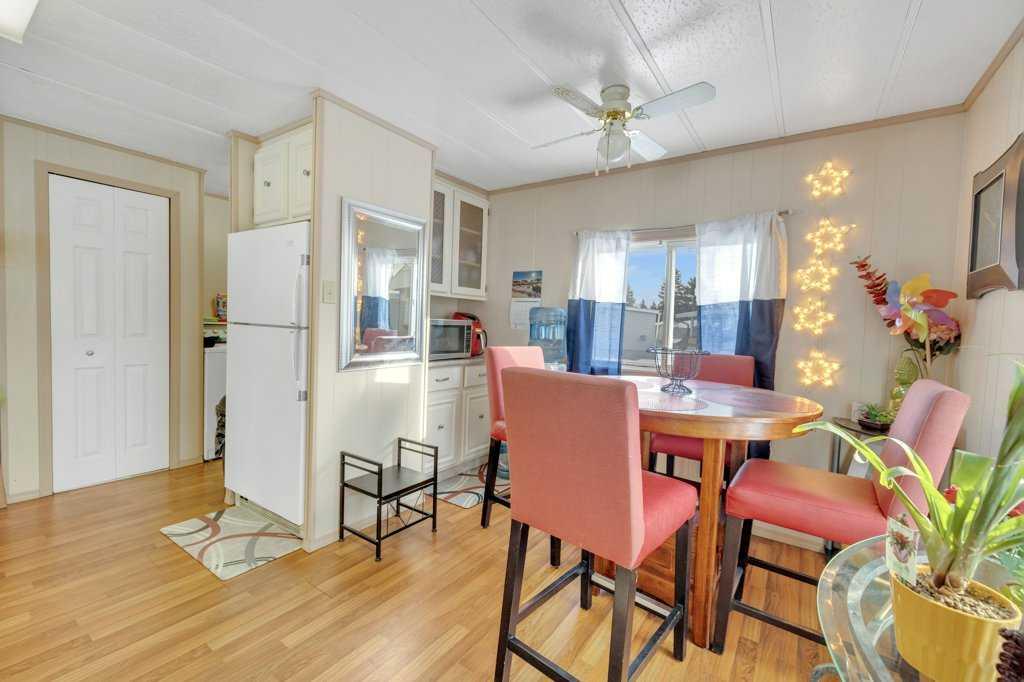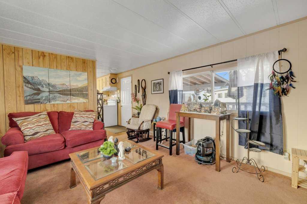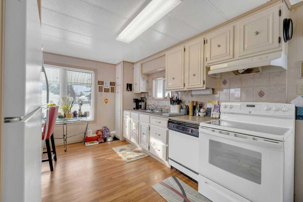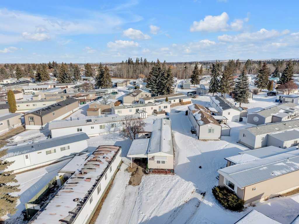 This well-cared-for two-bedroom home is located in a long-established mobile home park in North Red Deer. Over the years, several important improvements have been completed, including newer windows and siding in 2009, a sloped metal roof installed in 2011, and a furnace replacement in 2014. A paved driveway provides partially covered parking, and a covered front deck offers a sheltered entry into the home. The kitchen features laminate flooring, white cabinetry, and space for a dining table with large windows for natural light. Laundry and additional storage are conveniently located just off the kitchen area. The spacious living room connects to two bedrooms, and the three-piece bathroom includes a corner shower. There's an unheated workshop addition (not included in the square footage) just off the hallway which makes great space for storage. An 8x10 storage shed is included. Monthly lot rent is $700 with included water and garage.