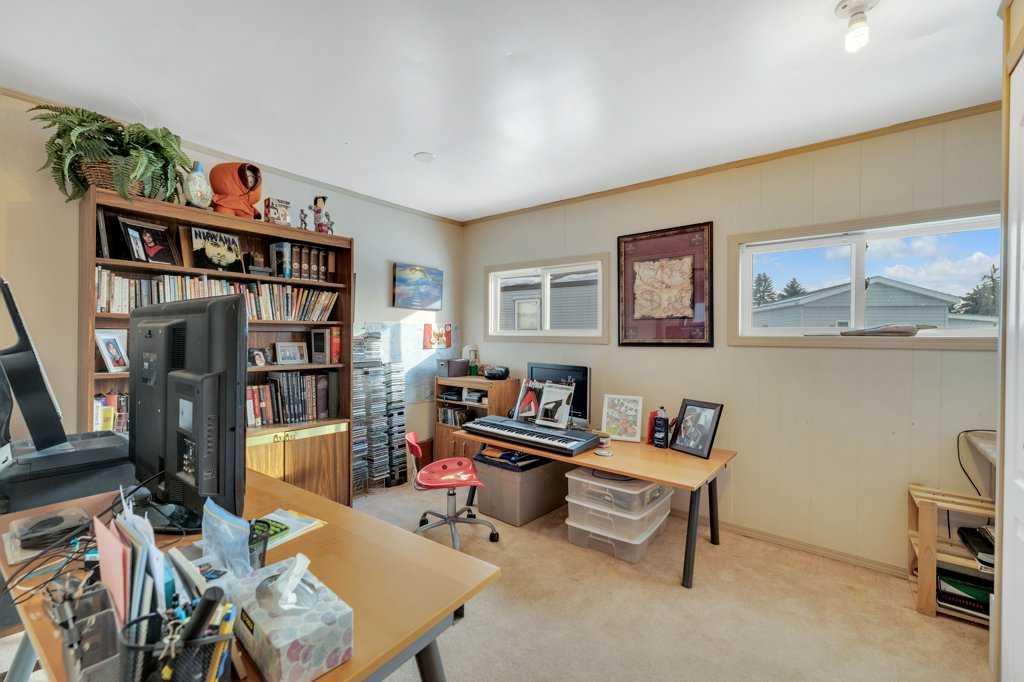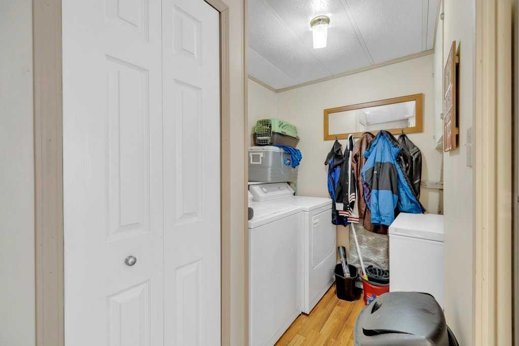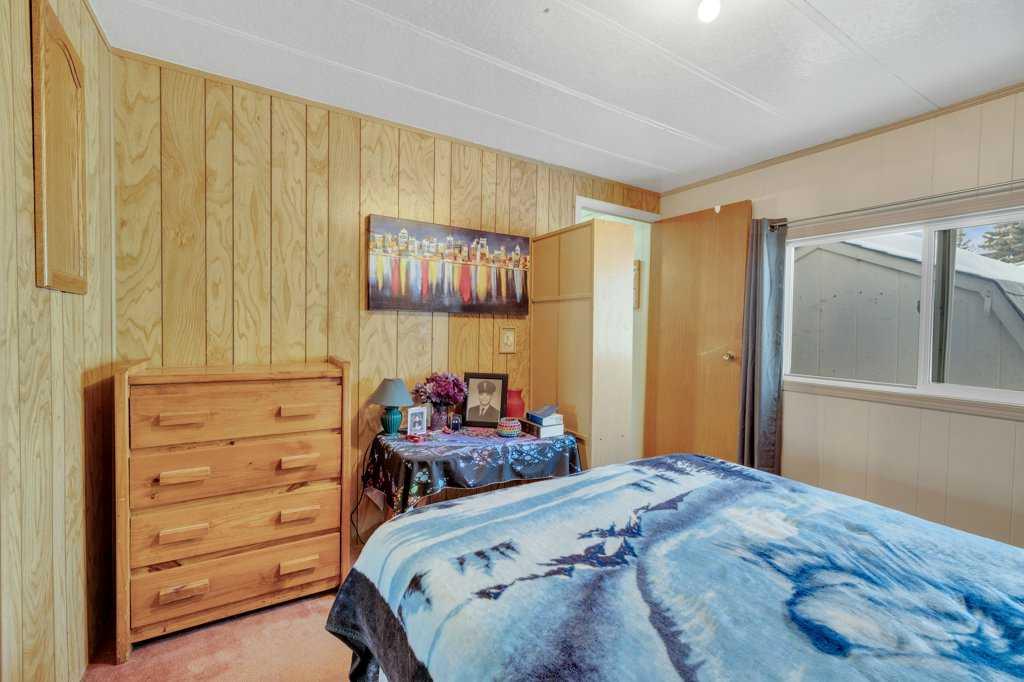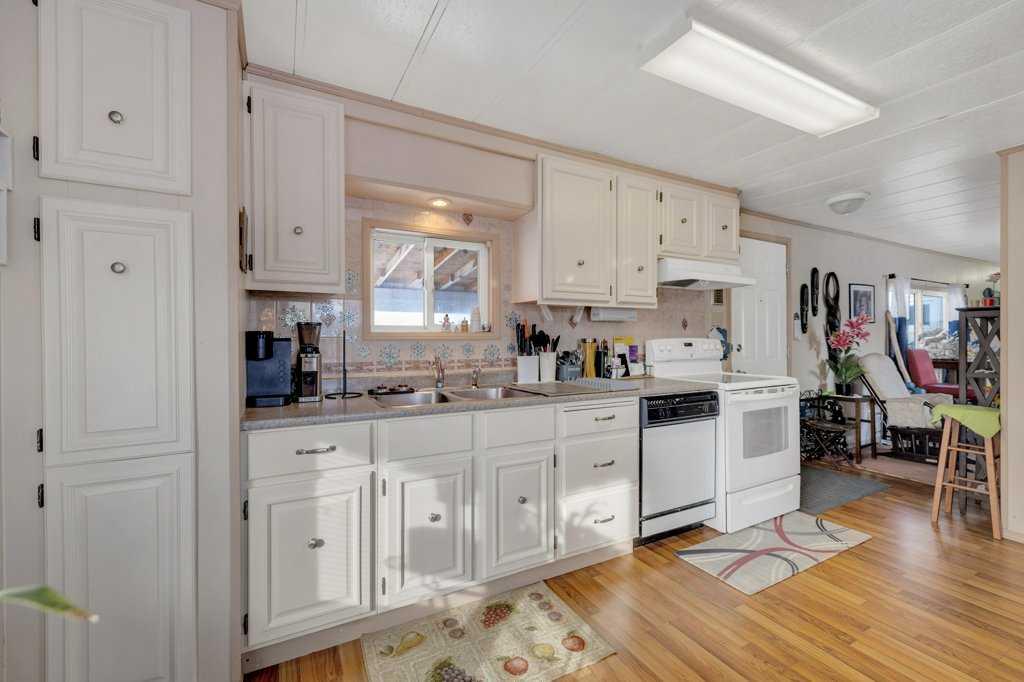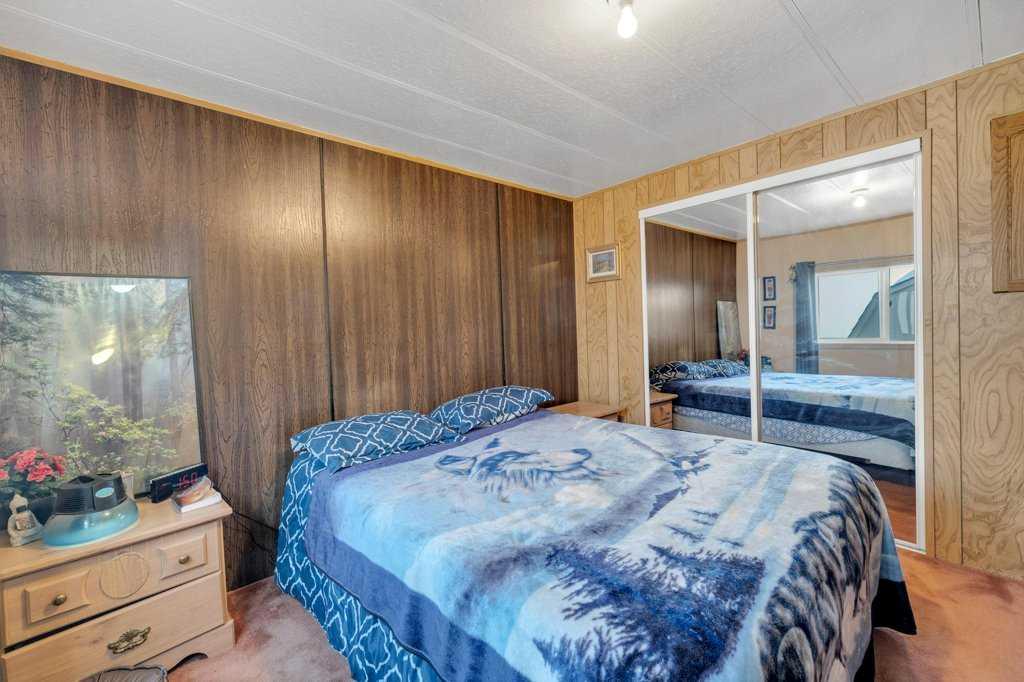 This well-cared-for two-bedroom home is located in a long-established mobile home park in North Red Deer. Over the years, several important improvements have been completed, including newer windows and siding in 2009, a sloped metal roof installed in 2011, and a furnace replacement in 2014. A paved driveway provides partially covered parking, and a covered front deck offers a sheltered entry into the home. The kitchen features laminate flooring, white cabinetry, and space for a dining table with large windows for natural light. Laundry and additional storage are conveniently located just off the kitchen area. The spacious living room connects to two bedrooms, and the three-piece bathroom includes a corner shower. There's an unheated workshop addition (not included in the square footage) just off the hallway which makes great space for storage. An 8x10 storage shed is included. Monthly lot rent is $700 with included water and garage.