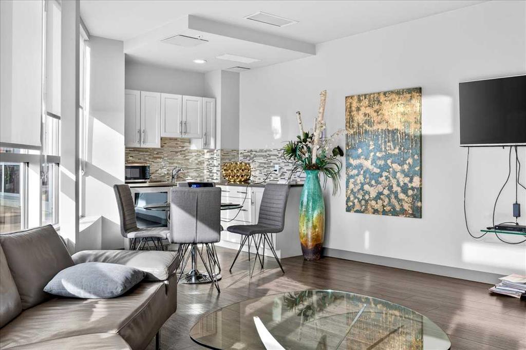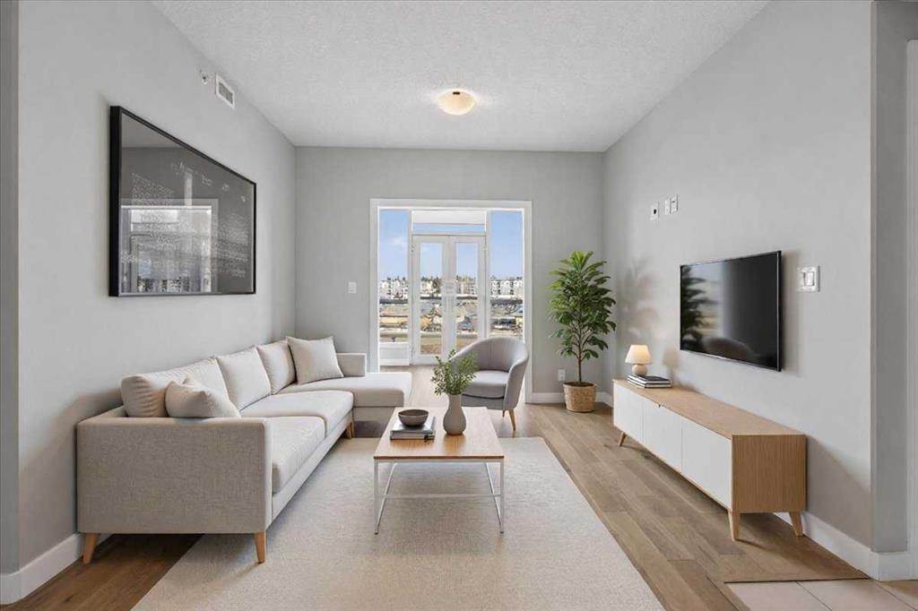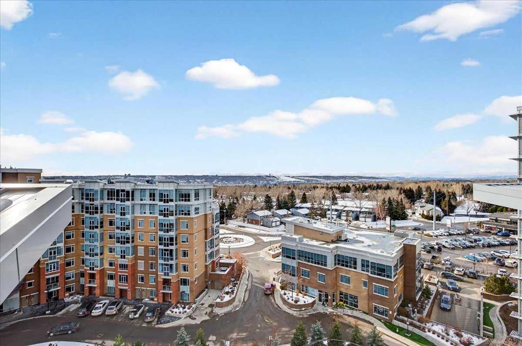 OPEN HOUSE Sat 31 Jan 11-2. Located in a newer concrete tower steps from all conveniences in the prestigious Groves of Varsity, this 5th floor 2 bedroom, 2 bathroom nearly 1,100 sq. ft. corner condo stands out. In perfect condition throughout, the open-concept living area opens to an upgraded kitchen on one side, and it also separates the spacious bedrooms (both with walk-in closets) for optimal privacy. The primary bedroom’s luxurious ensuite features TWO sinks in the quartz countertop over a cabinet with drawers, and a large glass-enclosed shower, plus a more private WC. The spacious kitchen features lots of full height maple-spice cabinets, stylish quartz countertops, a large island, and stainless appliances. Beyond the dining area in front of the kitchen, and beyond the living room is a bright and enclosed sunroom/flex area! The 9-ft high ceiling through-out allows the large windows (with professional window coverings) to pour light throughout; building has central air conditioning to keep you cool.The laundry machines sit in a cozy room. Freshly painted and NEW hardwood flooring amplifies the otherwise immaculate condition of the condo. The elevators are a short walk from your new home, and they lead to an array of services and amenities. Up on the rooftop is a large world-class fitness centre, with steam rooms, that opens to a terrace with panoramic views of the city and mountains. There is a meeting room on this floor as well. Underground is your heated, ample-sized titled parking space (#60), and assigned storage space. But, you don’t need to drive often because amenities like coffee shops, medical centre & pharmacy are right beside this grand complex. Additionally, the Silver Springs Golf Course is a block away, the Safeway grocery store & Dalhousie LRT station are two blocks away, and the large Market Mall is just a few more blocks away still. Further, the Bow River and University of Calgary are also close by, as are convenient thru fares to the Rocky Mountains and other places you want to go. FYI. There's an on-site property manager during business hours who is accessible to all residents, and an on-site BOMA-certified caretaker to ensure everything is running smoothly. They have installed EV charging stations in the underground parkade. Pets are welcome subject to board approval. Make your move to a place you will happily call home right away.