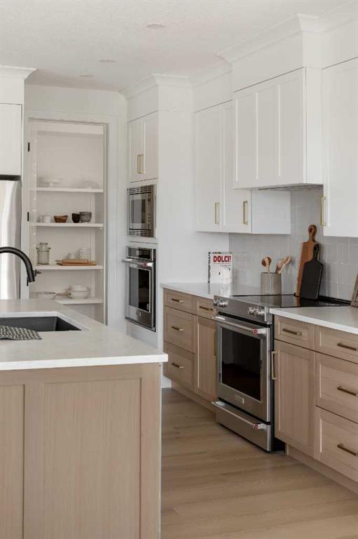 Welcome to Pinnacle Estates at Sunset Ridge in Cochrane. This corner-lot home features the MIA model by Aspen Creek Designer Homes, Cochrane Builder of the Year two years running. Offering over 3,100 sq. ft. of fully developed living space, this home combines style and functionality. Enjoy a wraparound front porch with stunning views, a bright open-concept main floor, custom mudroom, and powder room. The kitchen impresses with custom cabinetry, quartz counters, stainless steel appliances, double ovens, and a walk-in pantry. A private workspace, cozy living room with electric fireplace, and dining area with access to a covered porch complete the main level. Upstairs includes a private primary retreat with walk-in closet and spa-inspired ensuite, two additional bedrooms, bonus room, 4-piece bath, laundry, and coffee bar. The finished basement offers a rec room, bedroom, full bath, and storage. Fully sodded yard ready to personalize. Located one block from RanchView School (K–8), parks, and pathways. Book your showing today!