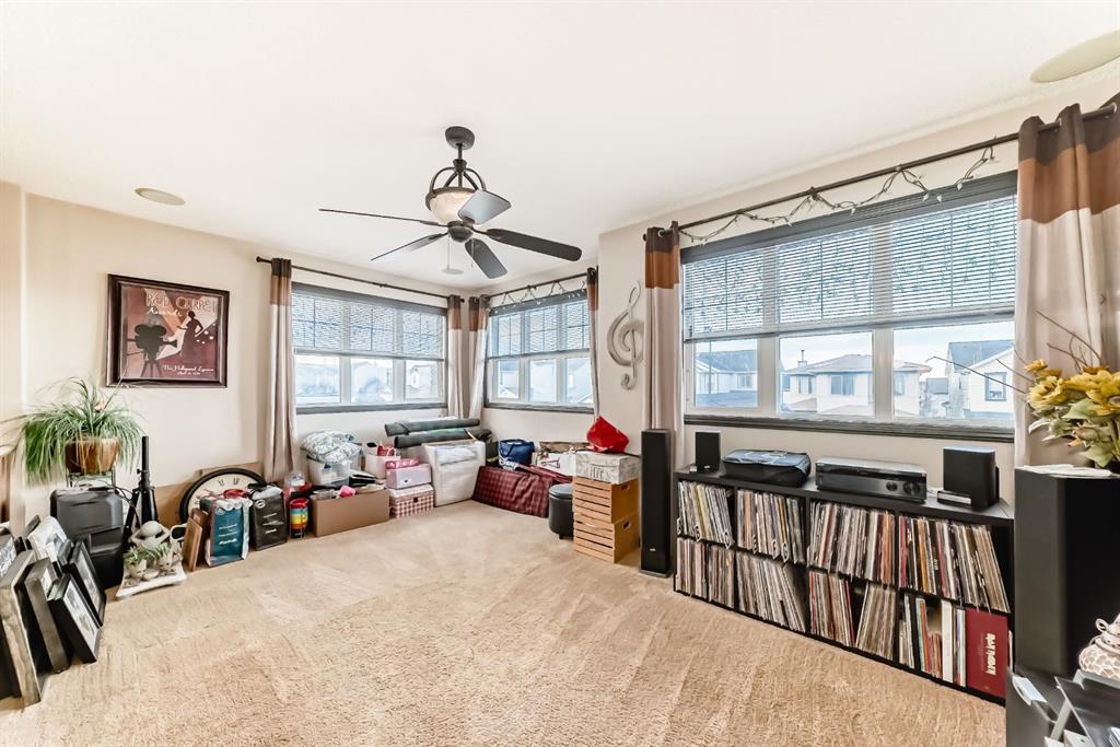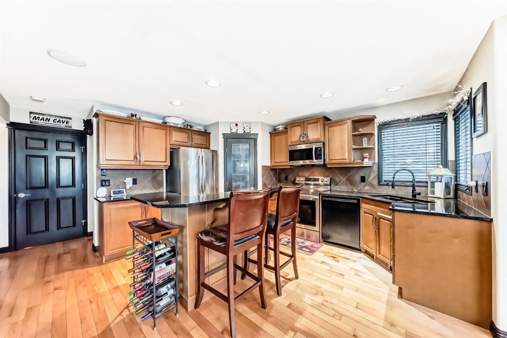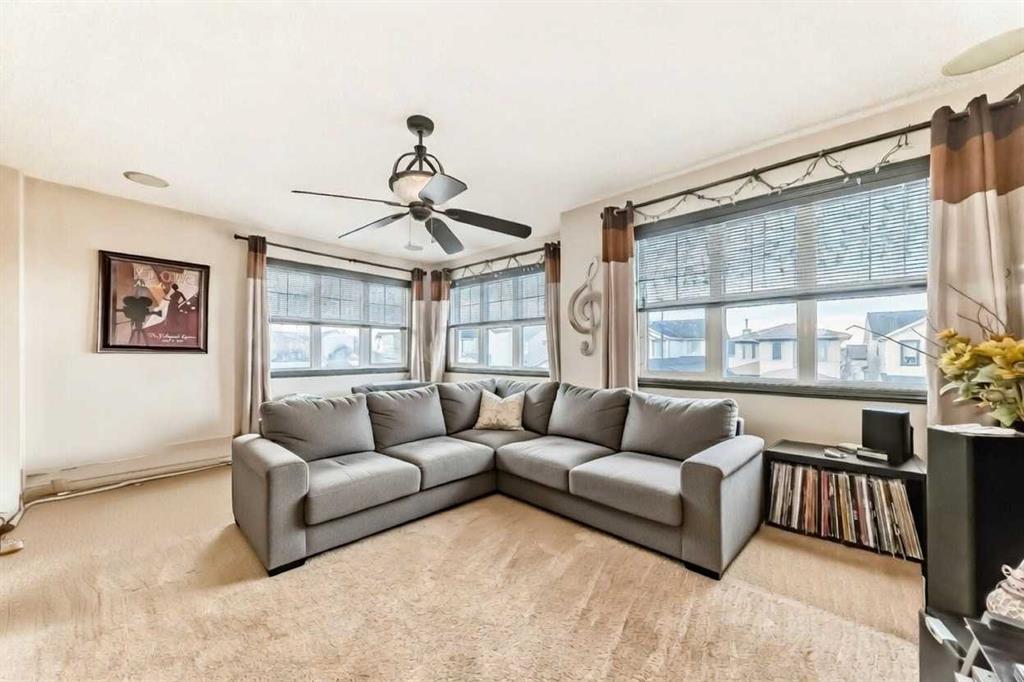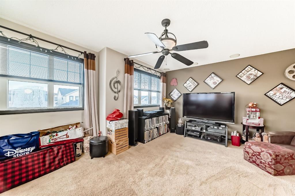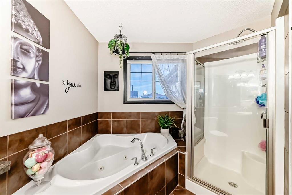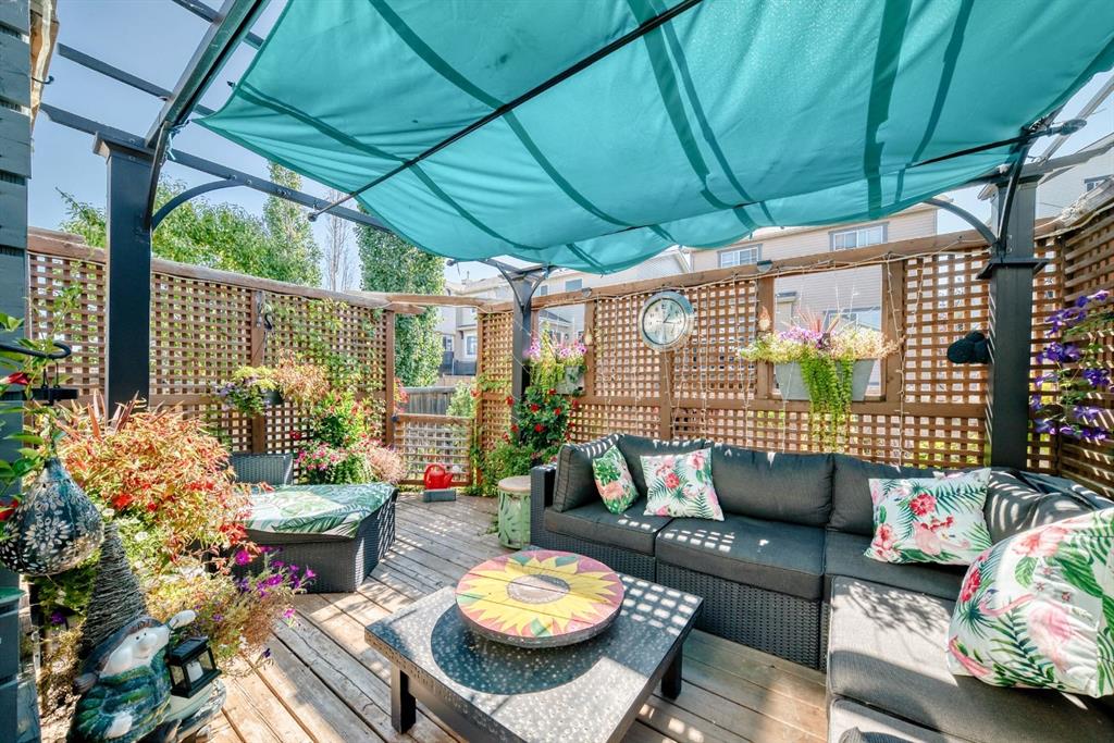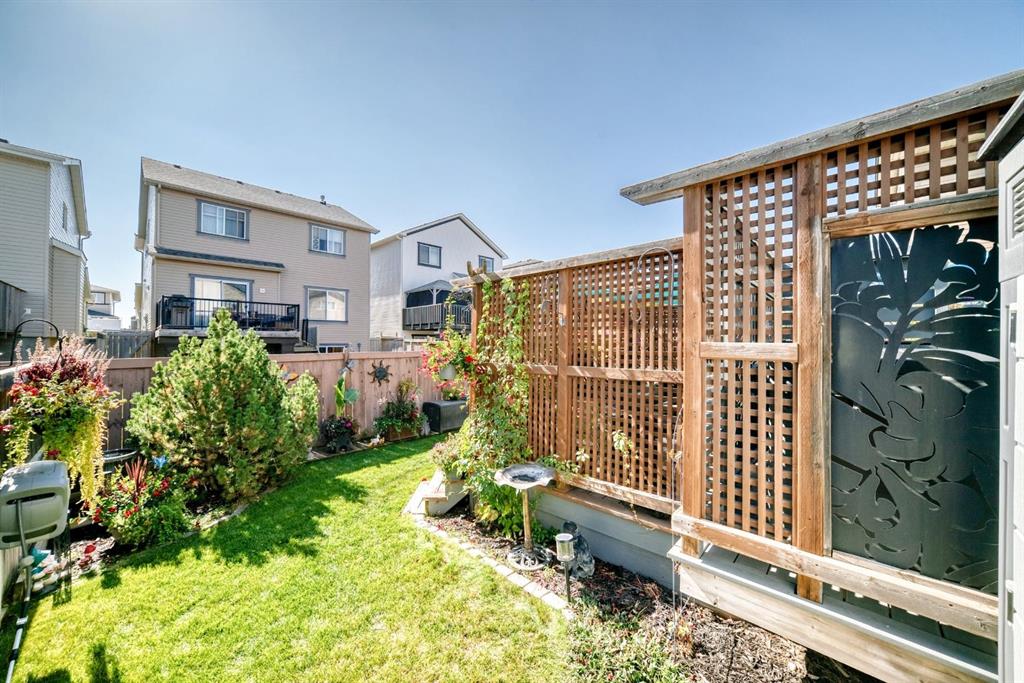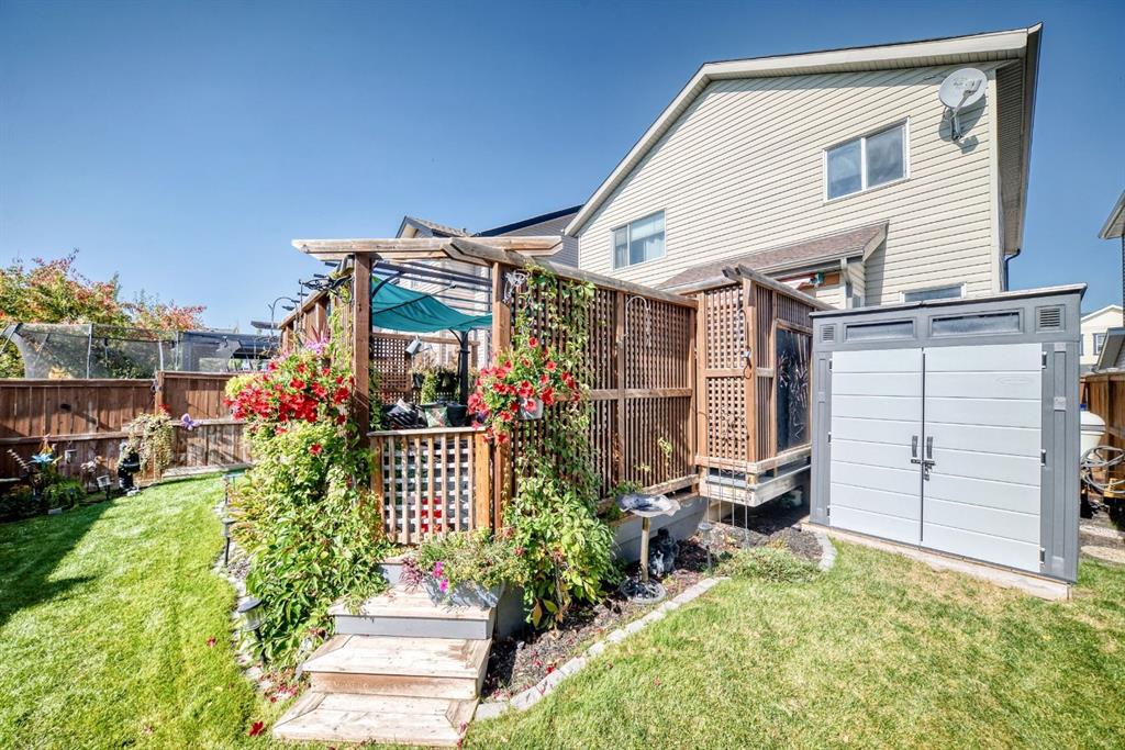 Welcome to your new home at 2071 Sagewood Rise in the family friendly community of Sagewood. This fully finished, meticulously maintained 2-storey residence offers exceptional curb appeal with a beautifully manicured front yard featuring lush shrubs, neat landscaping, and thoughtful details that welcome you home every day. Step inside through the tiled entry foyer, which flows seamlessly into an open and inviting main floor plan adorned with genuine hardwood flooring throughout. The spacious living room is a cozy focal point, highlighted by a stylish corner fireplace with an elegant mantle and tile surround, complemented by in-ceiling speakers for effortless entertainment. Large, ample windows bathe the space in natural light, creating a bright and airy atmosphere. The heart of the home is the upgraded kitchen, featuring newer SS appliances, granite countertops, an undermount granite sink, and abundant cabinetry with generous storage. A convenient corner pantry keeps everything organized, while the spacious dining area overlooks the stunning south-facing rear yard—perfect for family meals or hosting gatherings with views of your private outdoor oasis. Upstairs, the layout provides excellent separation for privacy, featuring a large bonus room ideal for movie nights or relaxation, complete with in-ceiling speakers, abundant natural light from numerous windows, and a striking feature wall. The primary bedroom is a true retreat, offering a 4pc ensuite bathroom with a large corner soaker tub, a standalone shower, and a generous walk-in closet. Two additional well-sized bedrooms and a full 4pc main bathroom complete this level. The fully developed basement serves as the ultimate “man cave” or family entertainment space, including a large living area anchored by another corner fireplace, two additional bedrooms for extended family, guests, or a home office setup, and a convenient 3-piece bathroom. Outside, the south-facing backyard is an absolute paradise designed for year-round enjoyment and privacy. Relax in the nearly new (2-year-old) Master Spa hot tub, fully enclosed for seclusion. A secondary private lounge area beneath the pergola offers another tranquil retreat. The yard is beautifully landscaped with numerous perennials and mature shrubs, a dedicated dog run for your furry friends, and a handy storage shed. The attached garage is a standout feature, complete with a built-in heater for year-round comfort, plus numerous wood shelving units—including upper shelving designed for larger items—providing excellent organized storage for tools, seasonal gear, sports equipment, and more. Additional premium upgrades throughout the home include central AC and a central vacuum system for added comfort and convenience. Ideally located near C.W. Perry School, this home provides easy access to top-rated education, parks, shopping, and all the amenities Airdrie has to offer, while still enjoying a peaceful, family-friendly neighborhood.