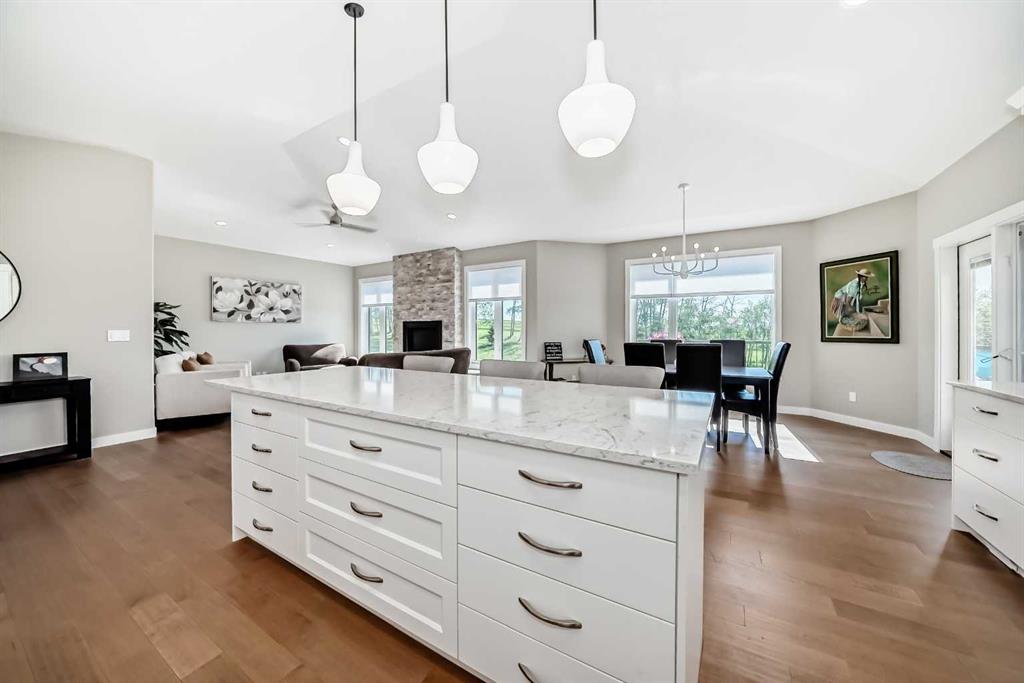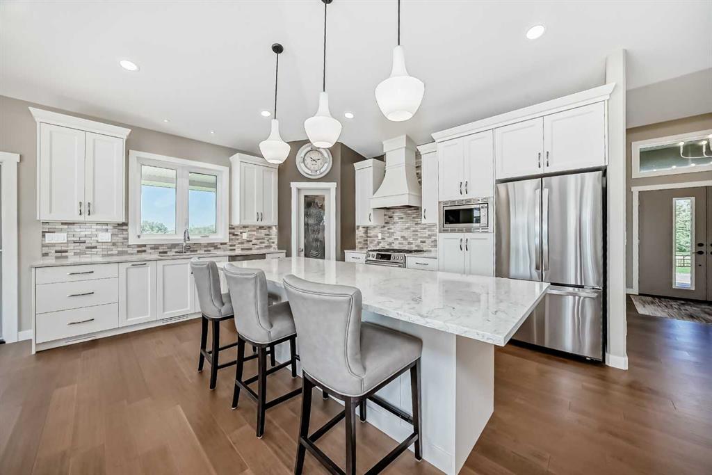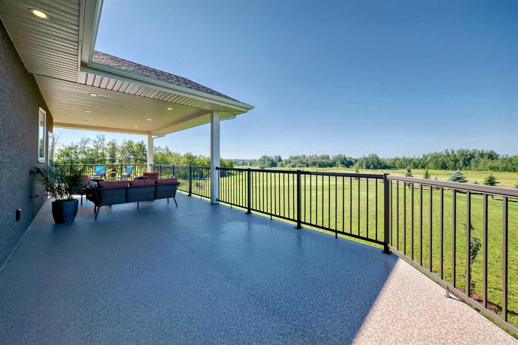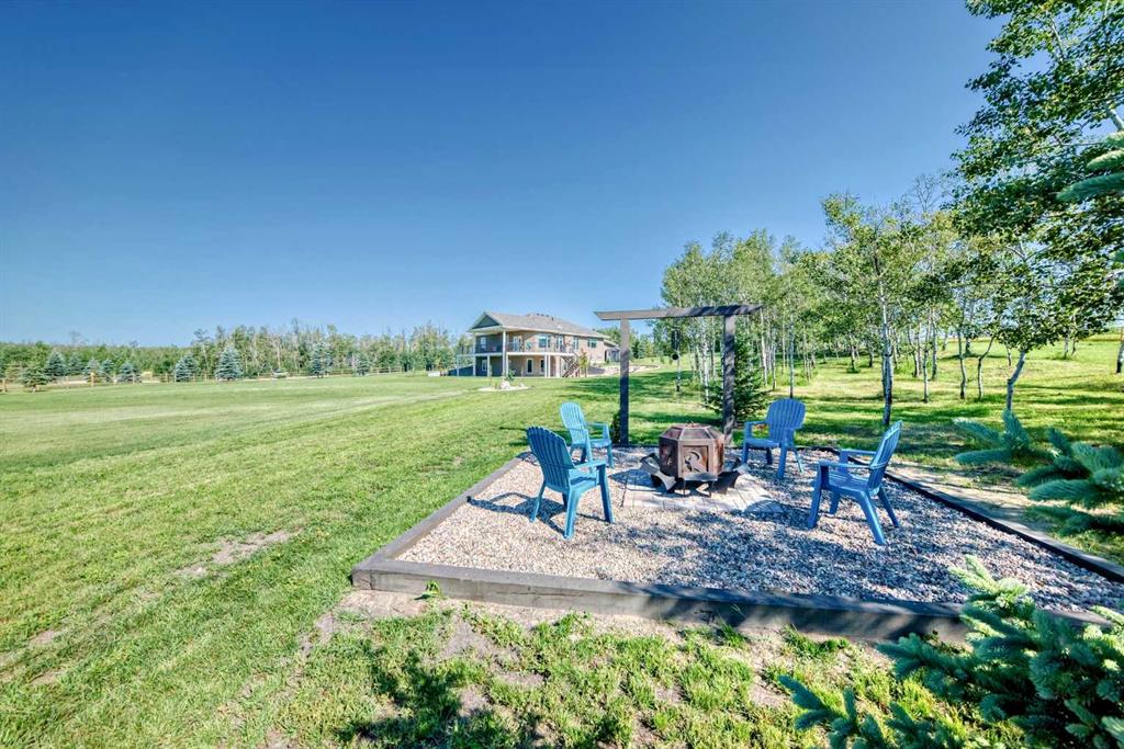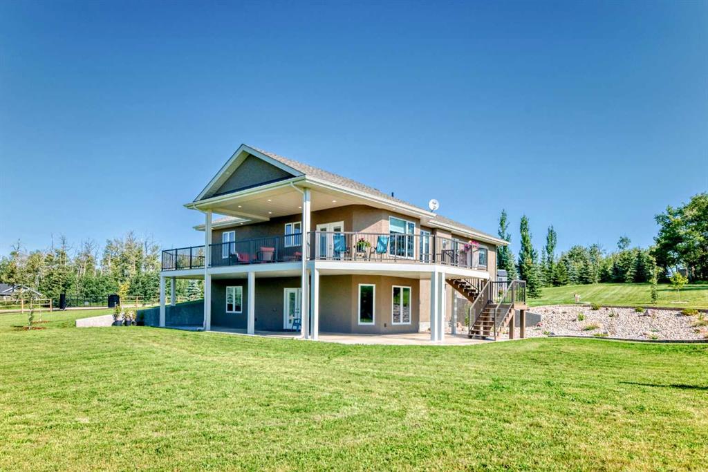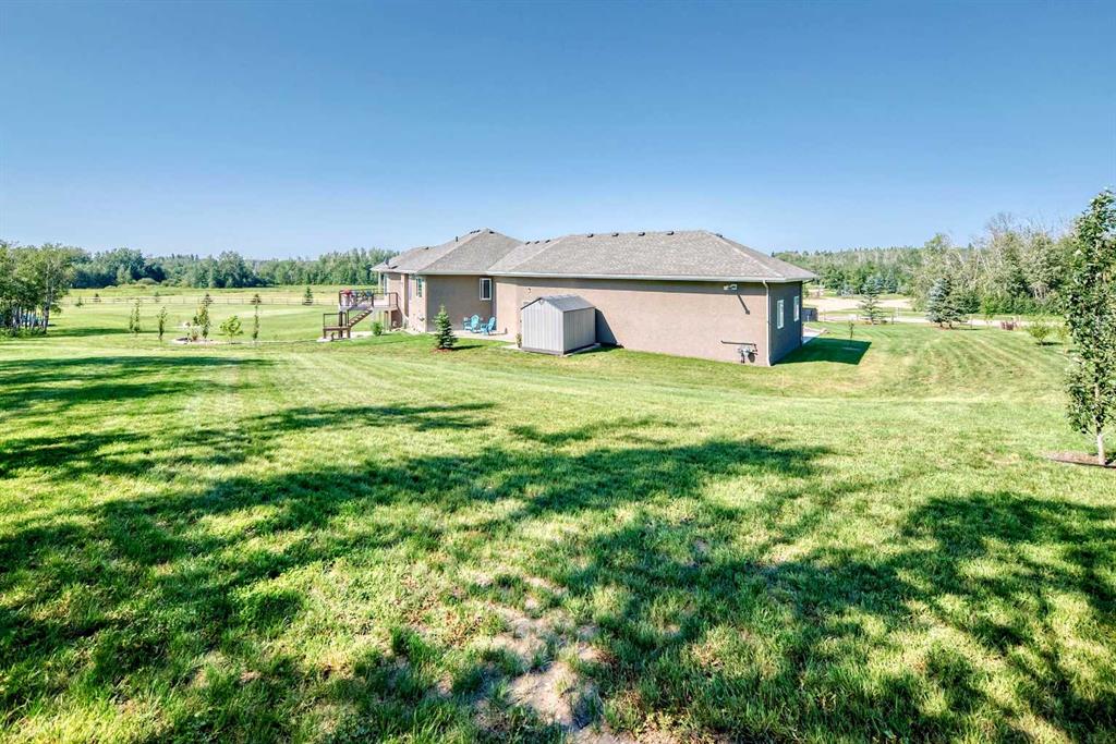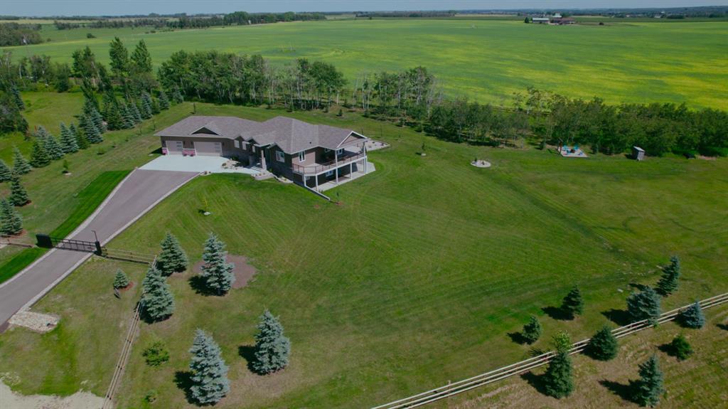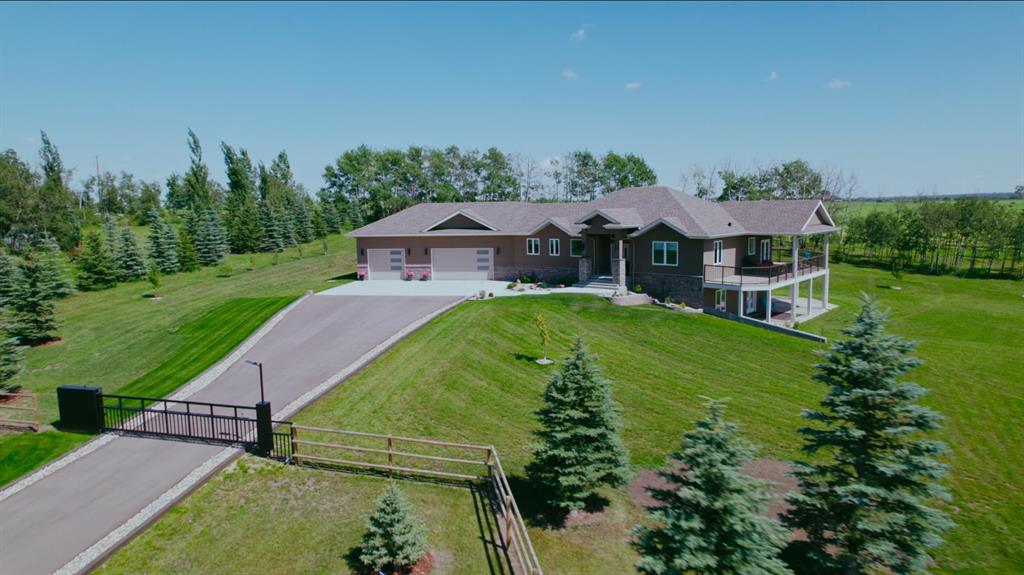 Experience the perfect blend of luxury, space, and location in this exceptional 4-bedroom, 3-bath executive bungalow offering 1,823 sq. ft. of beautifully finished living space, set on nearly 3 acres just minutes from town. With the balance of a 10-year new home warranty remaining, this property delivers the peace of mind of newer construction without the wait—ideal for families, entertainers, or those dreaming of a refined acreage lifestyle. There is also ample room to add a shop, barn, or accommodate horses, allowing you to truly make this property your own. Outstanding curb appeal welcomes you with a paved driveway, automatic entry gate, and three-rail wood perimeter fencing. The grounds are thoughtfully landscaped with auto-drip irrigation, a river rock fire pit, and an 8' x 10' garden shed, blending beauty with function. The low-maintenance exterior features acrylic stucco, cultured stone accents, and triple-pane vinyl windows for long-term durability and energy efficiency. Inside, the open-concept kitchen, dining, and living area is bright and inviting, highlighted by vaulted ceilings and expansive east-facing windows that flood the space with natural light. The chef-inspired kitchen showcases custom cabinetry, a large island, quartz countertops, and premium stainless steel appliances, including a dual-fuel range. A Napoleon fireplace anchors the living room, while the primary suite offers a walk-in closet and a spa-like 4-piece ensuite with dual sinks, a soaker tub, and a walk-in shower. Engineered maple hardwood floors and a soft, neutral colour palette create a timeless and welcoming atmosphere throughout the main level, complemented by luxury vinyl tile in the lower walkout. The fully developed walkout basement continues the home’s high standard of finish, featuring in-floor heating, a second fireplace, and a custom bar which is perfect for entertaining or relaxing year-round. East- and south-facing decks with vinyl flooring, sleek metal railings, and pot lighting provide ideal outdoor spaces for gatherings or quiet moments taking in the views. The attached, heated, fully finished triple-car garage boasts 11-foot ceilings and includes a mudroom and utility sink for everyday convenience. Additional features include central vacuum, high-efficiency furnace, water conditioning system, air conditioning, and an upgraded lighting package. With countless thoughtful upgrades throughout, this move-in-ready home offers exceptional value and surpasses the appeal of building new. Enjoy breathtaking sunrises and sunsets in a private, serene setting that still offers unmatched convenience—just 5 minutes from Ponoka, 20 minutes from Lacombe, 30 minutes to Red Deer, 45 minutes to the international airport, and approximately one hour to Edmonton. This is acreage living at its finest, without sacrificing accessibility.