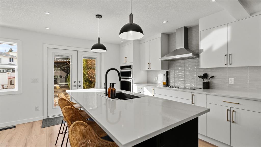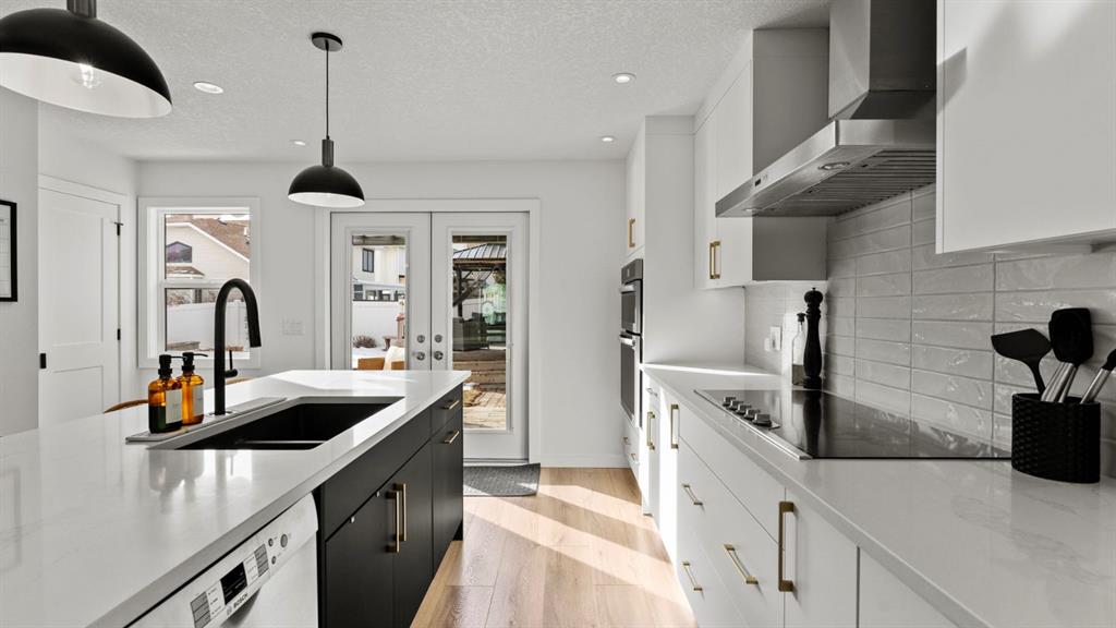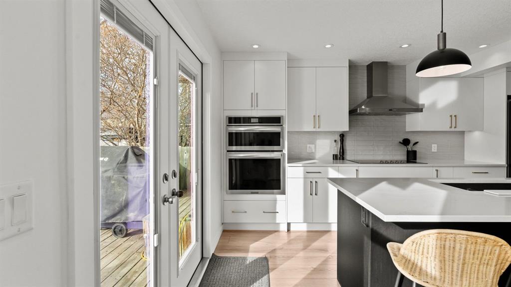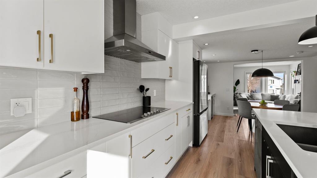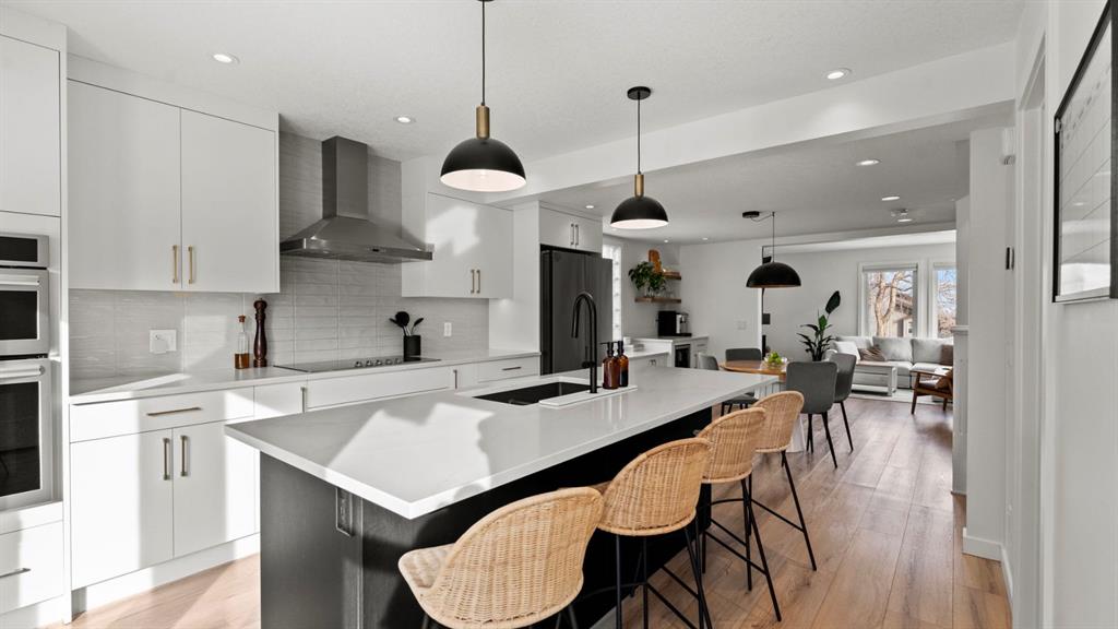 Welcome to this beautifully updated two-storey home in the highly desirable community of MacEwan Glen, offering the perfect balance of thoughtful renovations, functional living space, and an exceptional location. Situated on a corner lot and just steps from Nose Hill Park, this home provides immediate access to scenic walking paths and green space, while also offering quick connections to Stoney Trail, Deerfoot Trail, and a convenient commute to downtown via 14th Street. The home offers 1,373 sq ft of above-grade living space, plus an additional 543 sq ft in the fully developed basement, providing over 1,900 sq ft of total living space designed to adapt to a variety of lifestyles. The main floor has been fully renovated and showcases a bright, modern open-concept layout ideal for both everyday living and entertaining. Wide-plank flooring, recessed lighting, and large windows create a warm and welcoming atmosphere throughout. The living room flows seamlessly into the stunning kitchen, where crisp white cabinetry, quartz countertops, contrasting dark accents, and a large centre island with seating take centre stage. High-end stainless steel appliances include an induction cooktop, built-in wall ovens, and a statement range hood, while stylish pendant lighting and a sleek tile backsplash complete the space. The adjacent dining area offers direct access to the west-facing backyard, perfect for enjoying afternoon sun and evening sunsets. A convenient powder room completes the main level. Upstairs, the home features three well-sized bedrooms, including a bright and inviting primary retreat with a walk-in closet and private ensuite bathroom. Two additional bedrooms provide excellent flexibility for children, guests, or a home office, all finished in a soft, neutral palette. A full main bathroom completes the upper level. The fully developed basement adds valuable and versatile living space. A spacious recreation room offers the ideal setting for movie nights, a play area, or a second family room. An additional fourth bedroom is perfect for guests or older children, while a dedicated office or flex space supports work-from-home needs. A full bathroom and a separate laundry room complete the lower level, creating a functional and comfortable extension of the home. Set in a quiet, family-friendly neighbourhood close to schools, parks, and everyday amenities, this MacEwan Glen home delivers exceptional lifestyle value combining proximity to nature, modern updates, and outstanding access to all areas of the city.