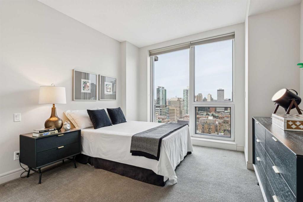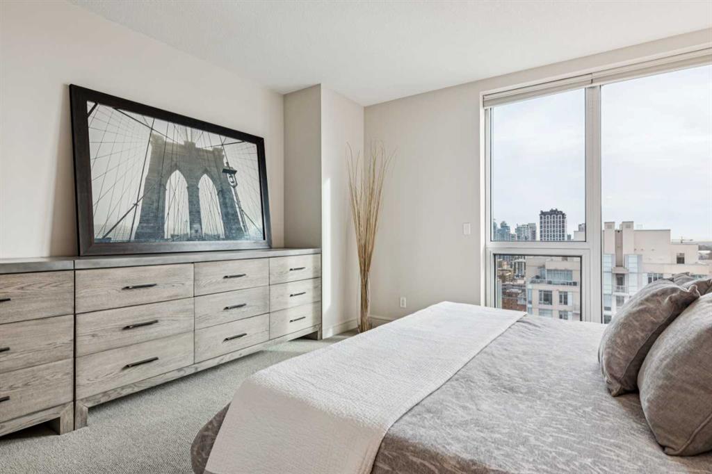 Experience luxury living at this high-floor, stunning corner unit that’s part of the exclusive “Penthouse Collection” at The Montana. This is arguably this most desirable location in the Beltline…just off 17th Avenue and 8th Street…surrounded by endless amenities, shops services, restaurants, cafes and fitness…a true lifestyle destination. This “Georgia” floorplan offers a generous 1289 square feet including 2 bedrooms, a den-office and 2 full baths. Floor-to-ceiling windows frame incredible downtown views that include all the iconic buildings. 9’ ceilings, contemporary architectural details, updated lighting and fresh paint throughout. Flexible and open-concept layout including a generous seating area, a dining area that can accommodate a large table, a work-from-home space tucked around the corner and a stylish kitchen with excellent storage (double-door pantry), fresh white cabinetry, granite counters, large centre island with extended counter for stools and stainless appliances. Balcony with panoramic view and gas for BBQ. Exceptional primary suite with a large bedroom that enjoys morning light, power window shades, Restoration Hardware drawer units, a generous walk-through closet and a 4-piece ensuite with soaking tub-shower combination. Good second bedroom next to a 3-piece bath with shower. Laundry room with storage. Extra-wide titled parking stall and assigned storage locker. The Montana has a unique window construction…the 3” thick “vision wall” system for superior soundproofing and energy efficiency. Central air conditioning. Building amenities include a newly renovated fitness centre, 5-star concierge service, visitor parking and 3 high-speed elevators with secured floors. Perfect for downsizers and those that appreciate a little extra space.