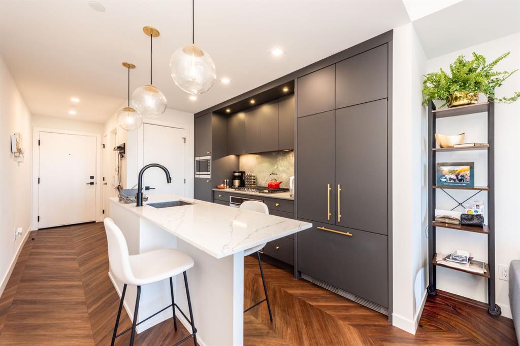 Experience elevated living in this Truman-built, concrete construction condo in sought-after West Springs. This 1-bedroom residence offers peace and quiet with superior soundproofing, allowing you to fully enjoy the spacious 547 sq ft open-concept design. Floor-to-ceiling glass in the living room, 9’ ceilings, and LED pot lighting create a bright, modern atmosphere. The chef-inspired kitchen features quartz countertops, a gas cooktop, wall oven, and custom soft-close cabinetry. Retreat to the bedroom with its expansive walk-in closet, and step out onto your private balcony with sweeping views. With central air conditioning, high-end finishes, and a location just minutes from shopping, dining, and transit, this home blends comfort, style, and convenience. Perfect for professionals, downsizers, or investors seeking long-term value.