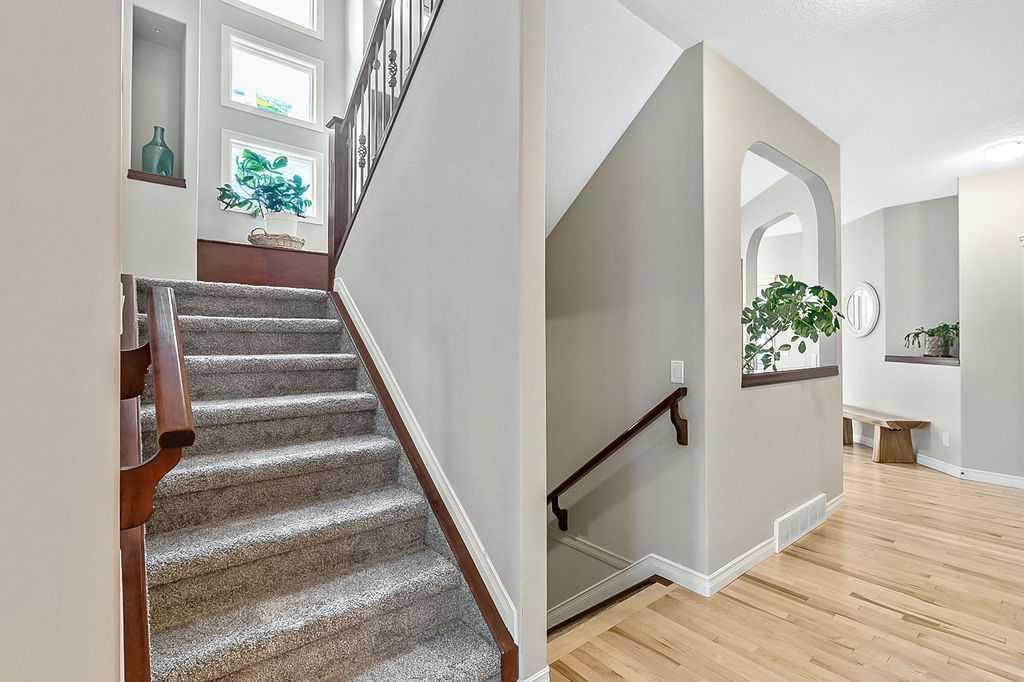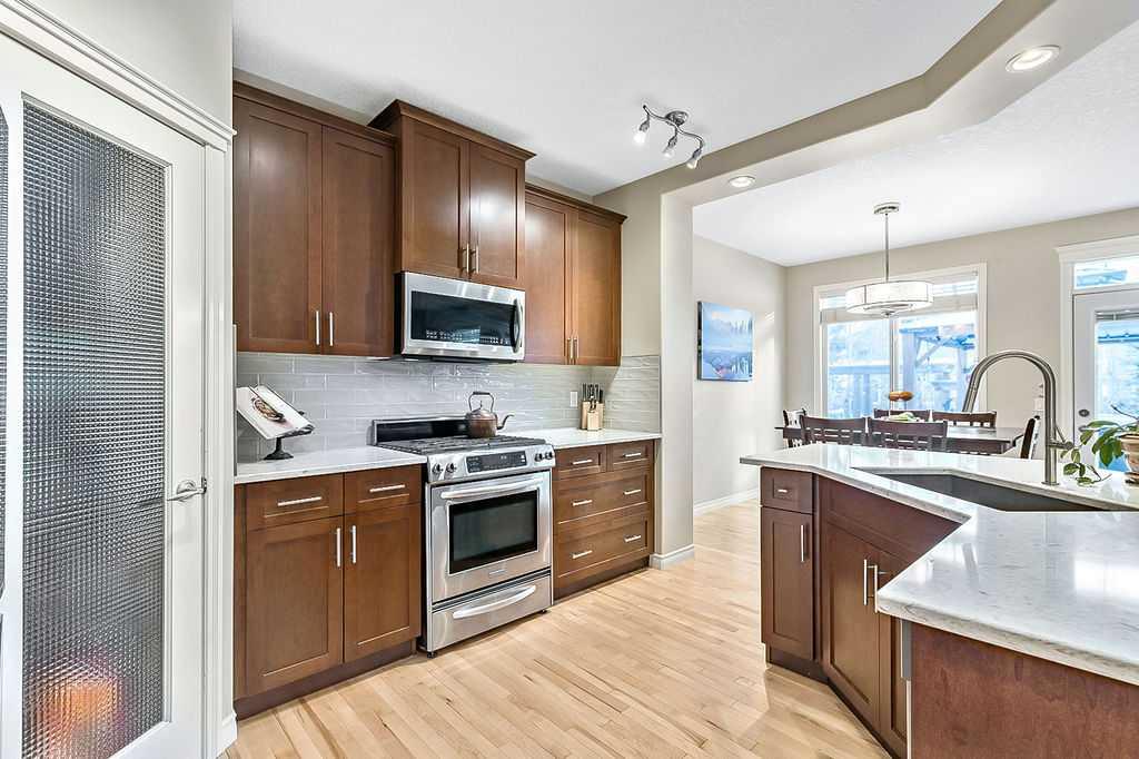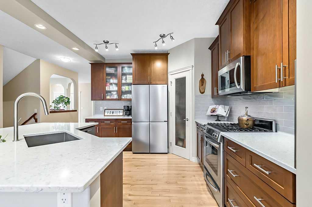 ~LAKE ACCESS ~ STEPS TO GOLF COURSE~ TRIPLE HEATED GARAGE ~ 6 BEDOOMS ~ 4 BATHS ~ ALMOST 4000 SQ FT OF LIVING SPACE~ Check out this absolutely stunning home nestled on one of the quietest roads in Crystal Green. Backing onto the prestigious Air-Ranch homes gives this street that extra feel of luxury and privacy. This home provides the space you need for large families to function together. Step inside the large entranceway and notice the beautifully maintained hardwood floors. The front office/den can be easily converted to a formal dining space or the flex space you need. Step through to the open concept living space with a charming 3 way gas fireplace, a stunning kitchen, huge dining, and cozy living room. This open floorplan is where all the memories will be made. Large windows invite your eye to enjoy the outside greenery. Enjoy cooking meals in this chefs kitchen with recent updates of new quartz counters and backsplash. Plenty of cupboards, workspace, stainless steel appliances, gas stove, corner pantry , and massive sit up island are just a few of the features this kitchen offers. Enjoy watching the kids and pets play in the yard from the kitchen. The upper level has new plush carpets and offer a second living space for your family. The huge bonus room is loaded with natural light and provides a good separation between the primary bedroom and the kids/guest rooms. You will love this massive primary suite!! The walk-in closet is large enough to host all your clothes plus dressers if needed. The ensuite gives a space to relax after a long day at work. 3 more large sized room plus another 5 piece bathroom complete this bright and sunny upper level. The fully finished lower level provides a 3rd living space plus 2 more large bedrooms and another full bathroom. If you love outdoor space, this home is for you!! The tranquil oasis of a back yard truly comes to life every summer , providing privacy, and pure bliss. Relax on the large deck space and listen to the leaves on the mature trees blowing in the breeze. There are so many spaces on this property to obtain the lifestyle you desire. Enjoy long walks on the extensive path system Okotoks has to offer. Close to parks and playgrounds , in a convenient north end location that is perfect for city commuters. The oversized triple heated garage has epoxy floors, a man door to outside, a workbench area(or extra toy parking) and plenty of space for storage. Air conditioned on all levels of the home! There is truly something for every member of the family to find pleasure in this remarkable home. Upgrades over the last few years include new concrete pathway to back yard, hardwood floors redone, new counter tops and backsplash in kitchen, new carpets, paint, new back door and back windows, epoxy floors in garage... and more. Enjoy 4 season entertainment at Crystal Shores lake, offering beaches, swimming, fishing(summer and winter) and skating. This is a true family home ready for its next family to enjoy.