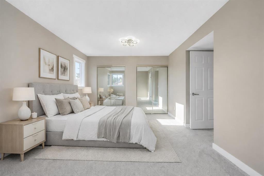 A beautifully updated end-unit townhouse in a quiet corner of the complex, backing onto open greenspace and offering exceptional privacy. Available for immediate possession. This home features a rare oversized double attached garage with extensive built-in cabinetry, a sink, and full driveway parking. Recent upgrades include new bathrooms throughout, modern engineered hardwood and LVP flooring, fresh paint, and bright kitchen cabinetry with a large island and integrated dining table, all finished with quartz countertops. A welcoming foyer leads to a spacious living room with high ceilings and large south-facing windows for excellent natural light. A few steps up is the kitchen, dining area, and a second living space with a cozy wood-burning fireplace and convenient half bath, ideal for everyday living and entertaining. Upstairs offers a spacious primary bedroom with a private ensuite featuring heated floors. A thoughtful reconfiguration created a massive second bedroom with dual closets and a cheater ensuite with separate hall access. The original third bedroom wall can be easily restored if desired. Enjoy a sunny south-facing deck and private fenced yard, perfect for pets and outdoor living. The basement level is dedicated to mechanical space and crawl-space storage, maximizing usable living areas above. This well-managed, pet-friendly complex is steps from Glamorgan Park, London Place West, and Richmond Square. Positioned directly beside the pathway and greenspace, the home offers a quiet, private setting with immediate access to long walking routes. Just 15 minutes to downtown with quick connections to Glenmore Trail and Stoney Trail.