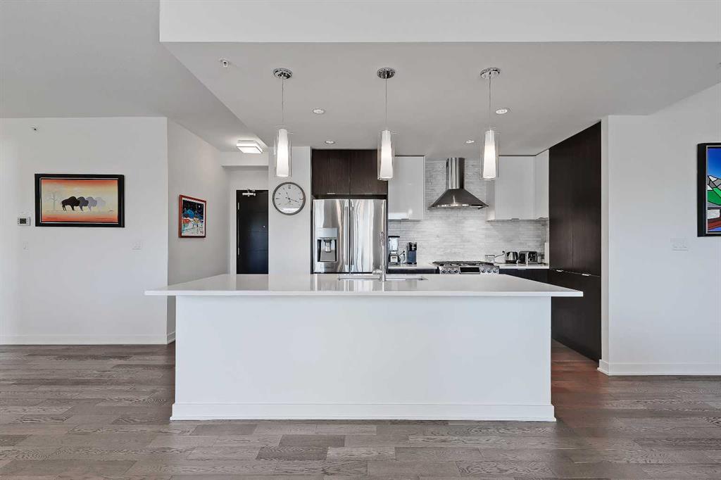 *VISIT MULTIMEDIA LINK FOR FULL DETAILS & FLOORPLANS!* Welcome to SUB-PENTHOUSE LIVING at Vogue! This 2-bed + den, 2-bath condo w/ over 1,200 sq ft on the 34th-floor w/ amazing city skyline band river views boasts two balconies opening off the main living areas. Naturally bright living w/ soaring ceilings, modern light and ceiling details, an open concept floorplan, & engineered hardwood flooring throughout (no carpet!), you are going to love the urban life at Vogue. Gather around the massive island w/ breakfast bar seating & dual undermount sink in the modern, sleek kitchen. Stainless steel appliances include a fridge w/ French doors, a deli drawer, & a freezer drawer, a gas stove & hood fan, a dishwasher, & built-in microwave. White quartz counters & marbled tile backsplash complement the wood & white cabinetry & modern pendant lighting. The open-concept living, dining, and den area has large windows, a gas fireplace, & access to TWO balconies via sliding glass doors. 2 bedrooms flank the main living space for ultimate privacy. The primary bedroom features a walk-in closet w/ custom built-in storage, and a private 5-pc ensuite. Featuring white quartz counters, modern faucets, dual undermount sinks, wood grain cabinetry, a standup shower, & soaker tub w/ full height tile, you’ll find everything you want & more in a primary suite. The secondary bedroom on the opposite side of the unit features a large window, a walk-in closet w/ custom built-in storage, & quick access to the main 4-pc bathroom w/ white a quartz counter, undermount sink, modern faucet, wood grain cabinets & a tub/shower combo w/ full-height tile. Rare for condo living, this unit has a laundry room w/ a washer & dryer, & heated, underground parking w/ a storage locker. VOGUE is a high-end building w/ lots of amenities, including an elegant lobby, full-time concierge, gym, billiards, large party room w/ kitchen & multiple rooftop terraces. Surrounded by parks, transit, the LRT, shopping & more, & within walking distance to the downtown core & all Kensington shops & services – this location truly cannot be beaten.