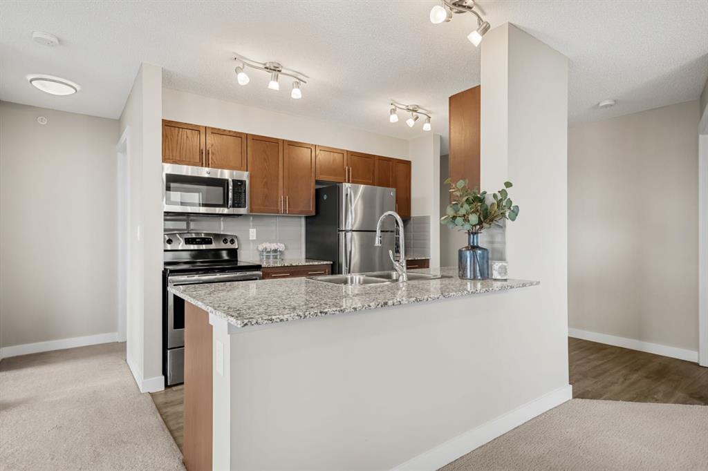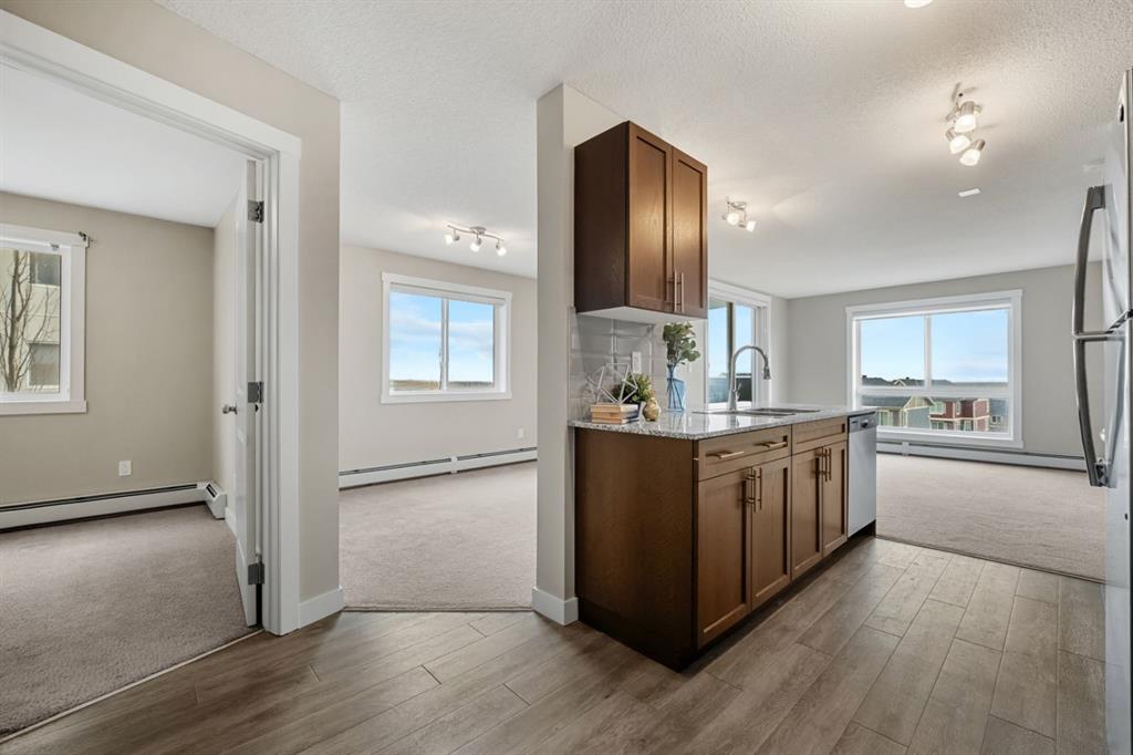 Welcome to this exceptional corner unit in one of Kincora’s most desirable buildings, perfectly positioned right beside the stairs for ultimate convenience. This home features a smart, spacious layout that is one of the largest and best in the entire complex- expertly designed with privacy in mind, featuring two bedrooms located on opposite sides of the unit. Enjoy breathtaking views from every room, flooding your home with natural light and serene outdoor scenery. An extra den space offers flexible use for a home office, creative zone, or cozy reading nook. The large dining area and open concept kitchen, complete with modern stainless steel appliances, make entertaining effortless and stylish. An unbeatable bonus for Calgary’s winters: this condo comes with one titled underground parking stall, giving you secure, convenient access and protection from harsh weather all year round. Outside your front door, the vibrant Kincora community provides numerous walking paths, scenic ravines, and lush green spaces- perfect for daily enjoyment and outdoor living. You are also within walking distance to convenient shopping and essential services. With easy access to Stoney Trail, commuting downtown, to the airport, or weekend trips to the Rockies couldn’t be simpler or faster. This condo isn’t just a place to live - it’s a lifestyle upgrade offering comfort, convenience, and stunning natural beauty. Whether you’re a first-time buyer, downsizer, or savvy investor, this home’s size, layout, and amenities provide unmatched value in Kincora. Schedule your private showing now- homes like this get snapped up quickly.