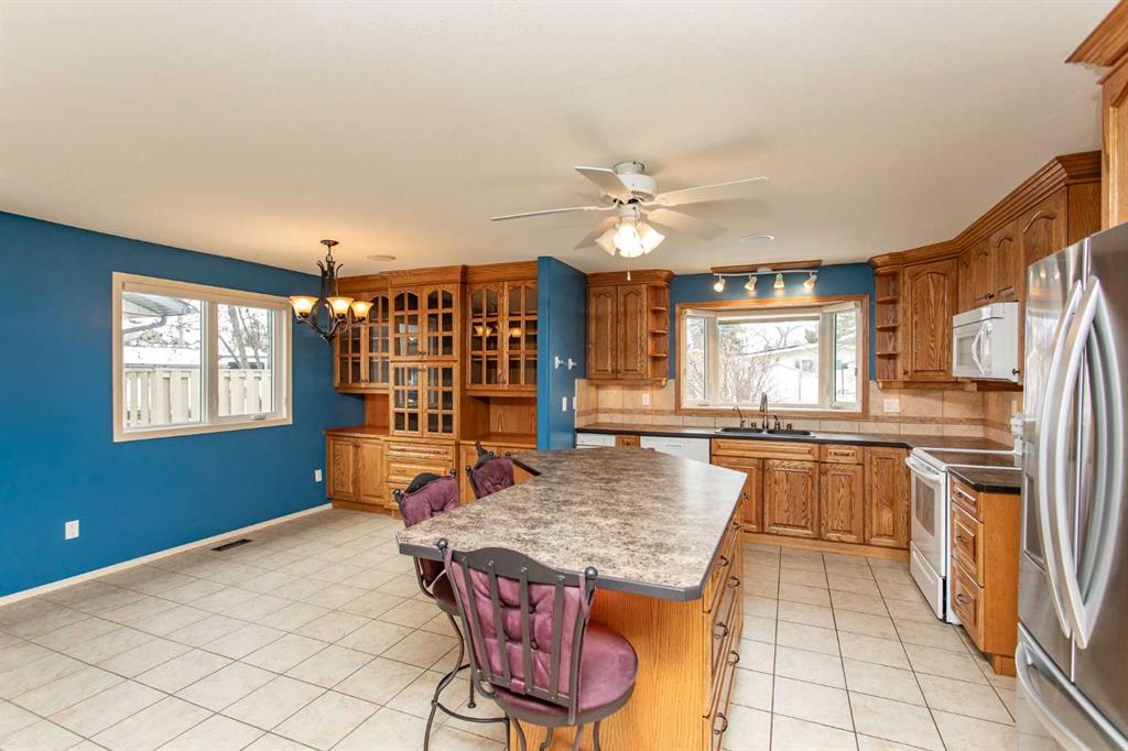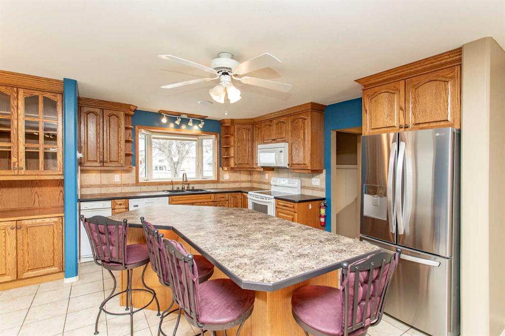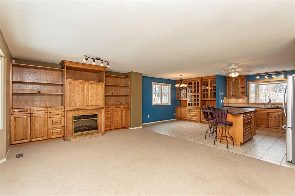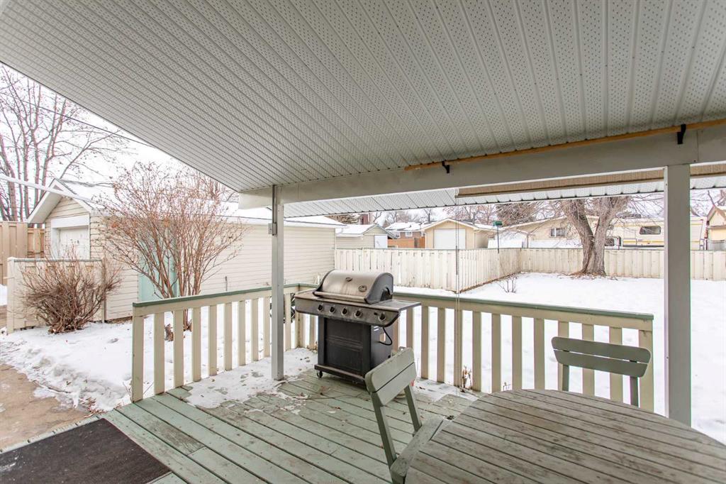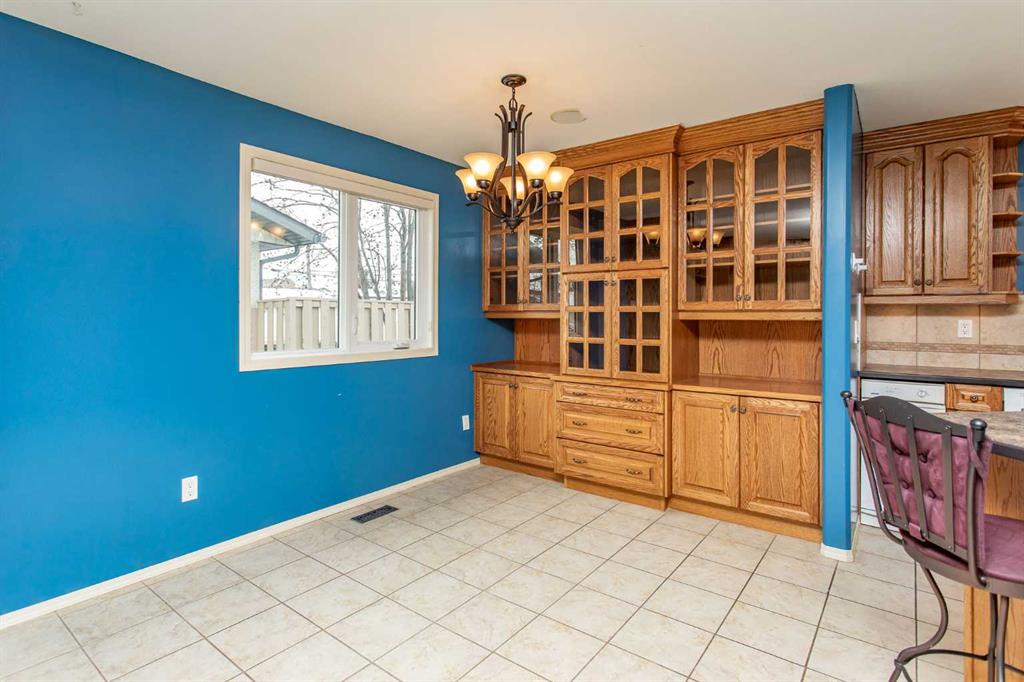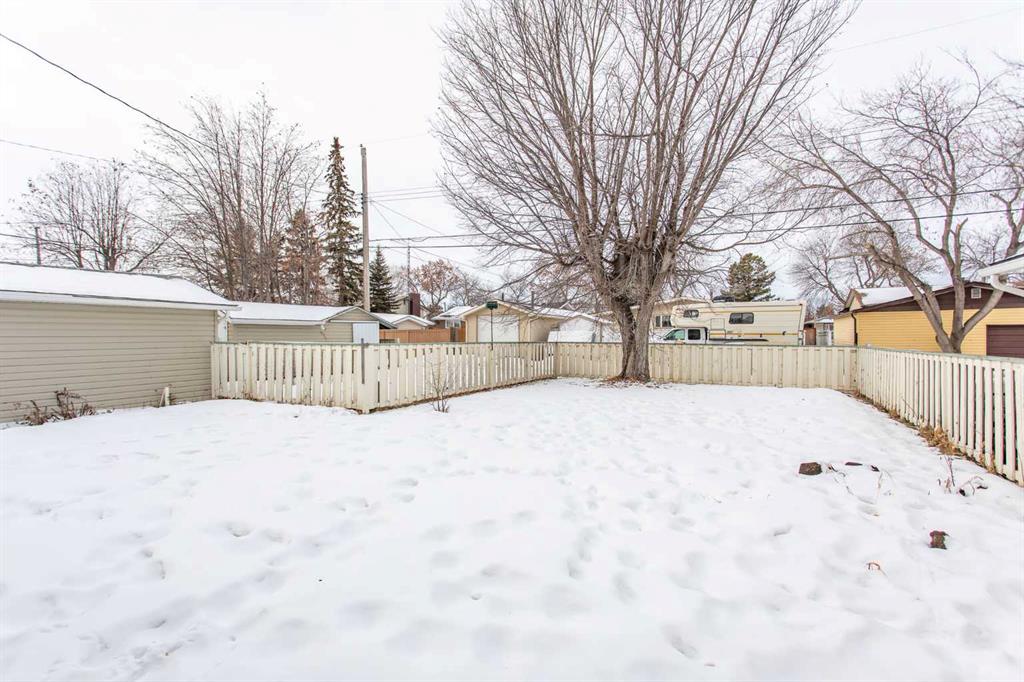 If you are seeking a home in the heart of downtown Lacombe, this well-maintained bungalow offers an excellent opportunity. As only the second owner since its construction in 1967, pride of ownership is evident throughout. The main floor features a spacious kitchen with ample countertop space, a dining area, and a comfortable living room. There are three bedrooms on this level, including a primary bedroom with a two-piece ensuite. One bedroom has been converted to accommodate main floor laundry but may be reverted to serve as a third bedroom if desired. The basement includes a fourth bedroom, a three-piece bathroom, and a large family/games room fitted with a dry bar. Built-in benches convert into double-size beds, making the area ideal for hosting guests. Notable updates include new countertops, cabinetry, backsplash, a large island, abundant oak cabinetry, custom built-ins, modern tile flooring, and the majority of windows replaced. Additional insulation was also added when the siding was updated. Outdoor amenities feature a covered patio with a wood-burning brick fireplace, perfect for use during spring, summer, and autumn. The property includes a single-car garage, fenced yard, garden shed, garden area, and convenient back alley access. Shingles were replaced around 2015.