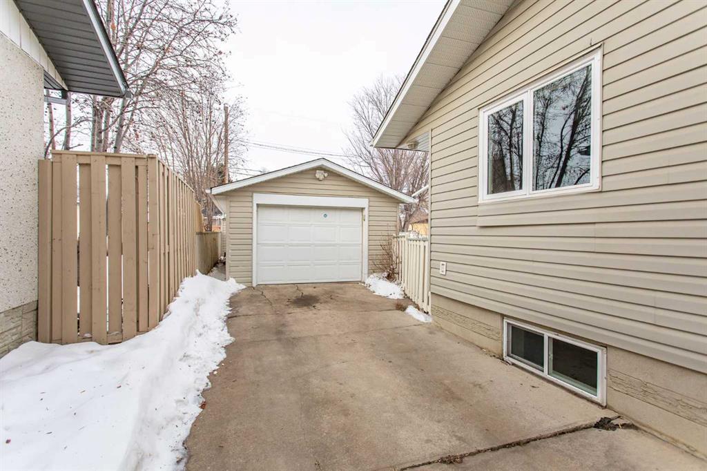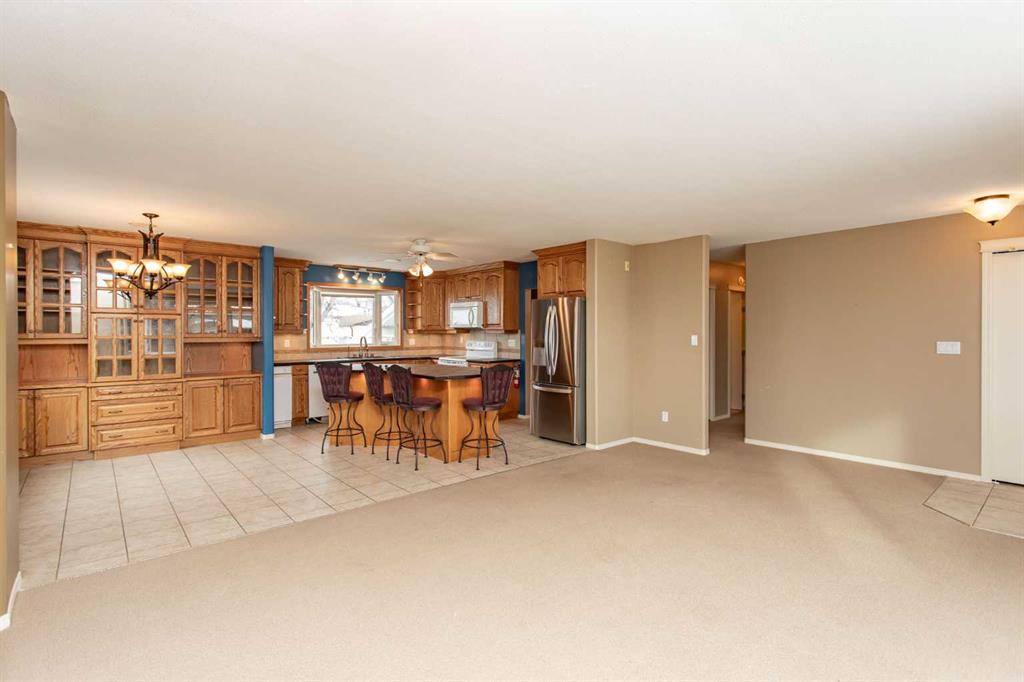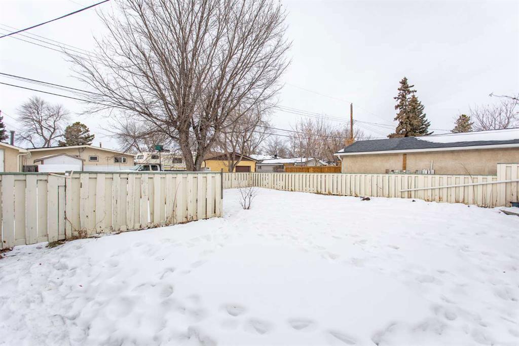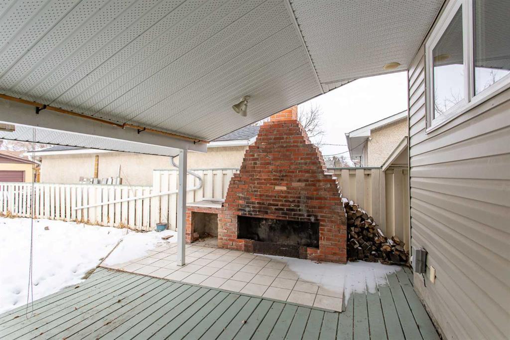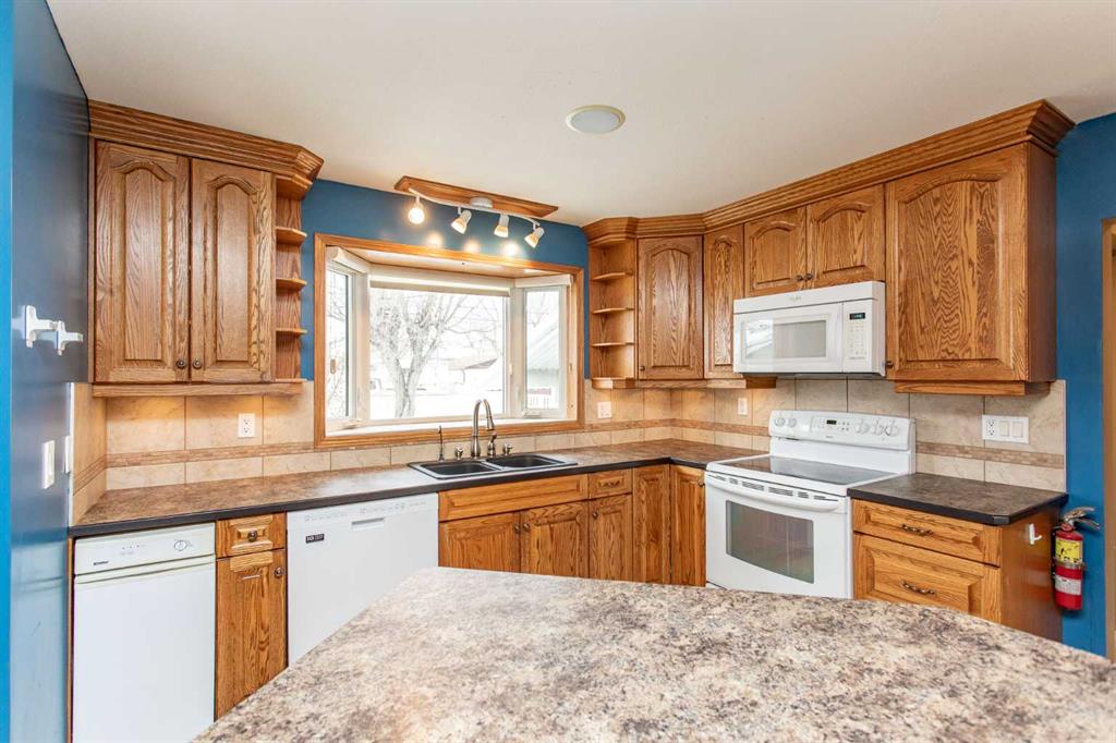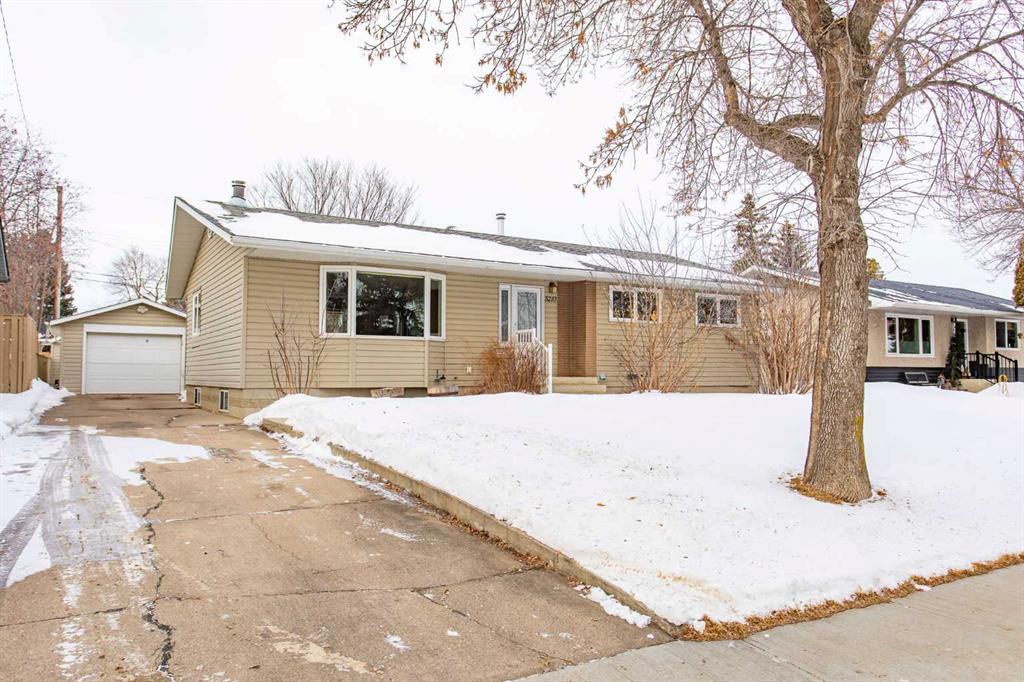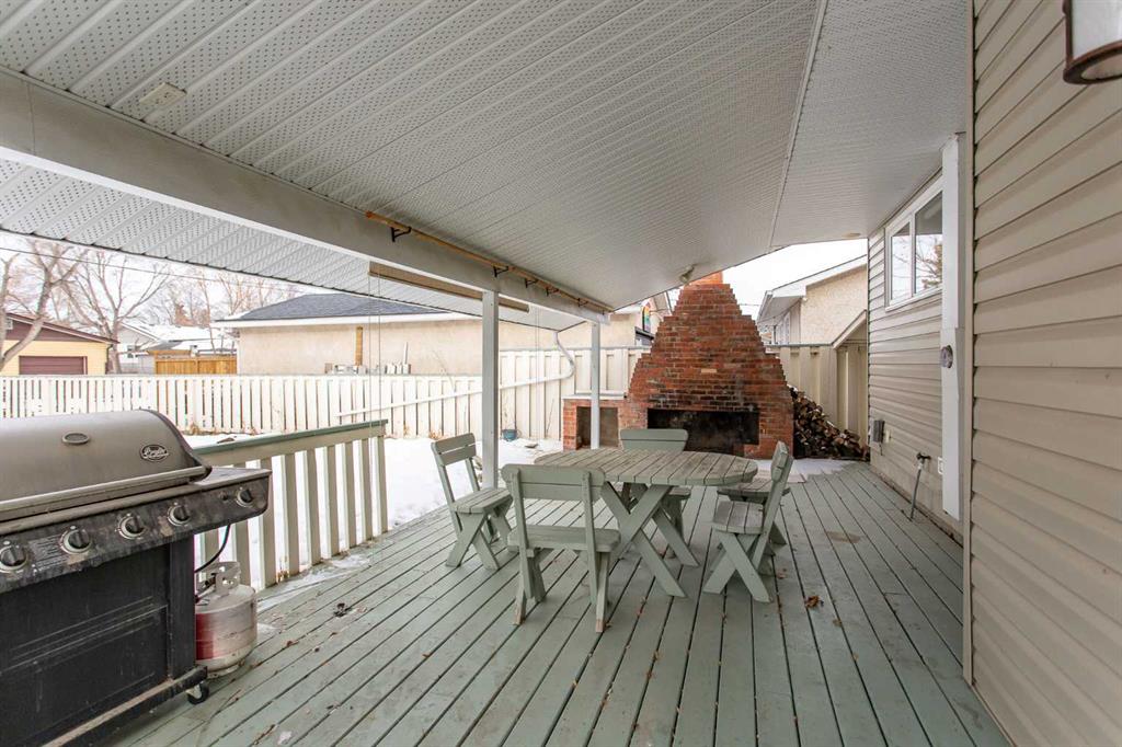 If you are seeking a home in the heart of downtown Lacombe, this well-maintained bungalow offers an excellent opportunity. As only the second owner since its construction in 1967, pride of ownership is evident throughout. The main floor features a spacious kitchen with ample countertop space, a dining area, and a comfortable living room. There are three bedrooms on this level, including a primary bedroom with a two-piece ensuite. One bedroom has been converted to accommodate main floor laundry but may be reverted to serve as a third bedroom if desired. The basement includes a fourth bedroom, a three-piece bathroom, and a large family/games room fitted with a dry bar. Built-in benches convert into double-size beds, making the area ideal for hosting guests. Notable updates include new countertops, cabinetry, backsplash, a large island, abundant oak cabinetry, custom built-ins, modern tile flooring, and the majority of windows replaced. Additional insulation was also added when the siding was updated. Outdoor amenities feature a covered patio with a wood-burning brick fireplace, perfect for use during spring, summer, and autumn. The property includes a single-car garage, fenced yard, garden shed, garden area, and convenient back alley access. Shingles were replaced around 2015.