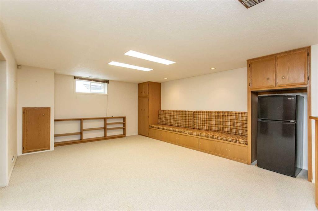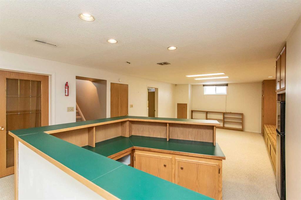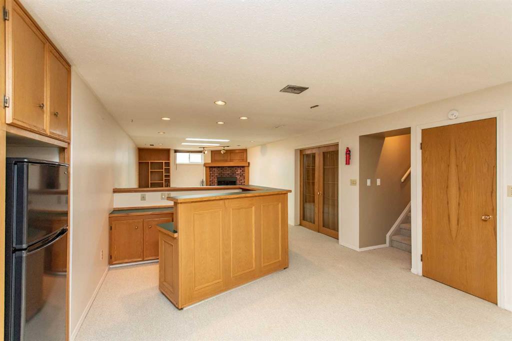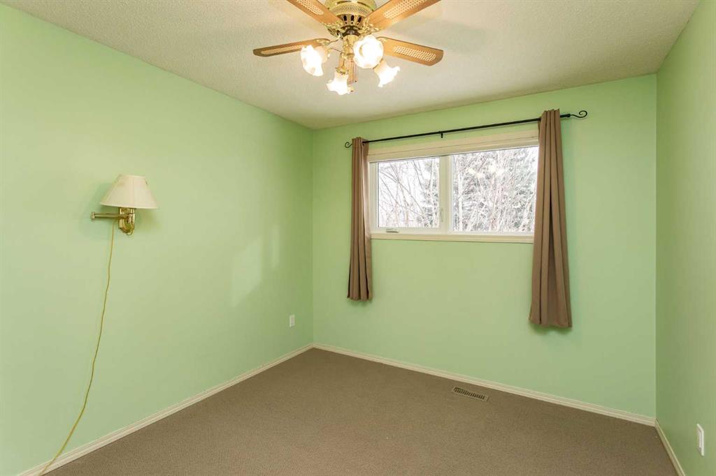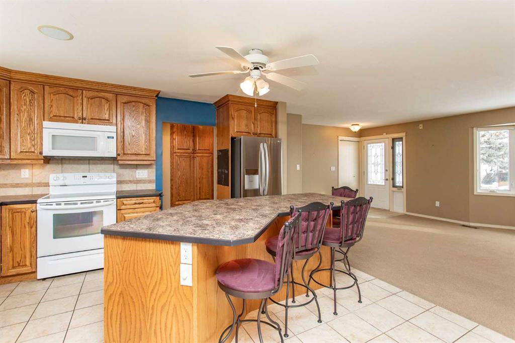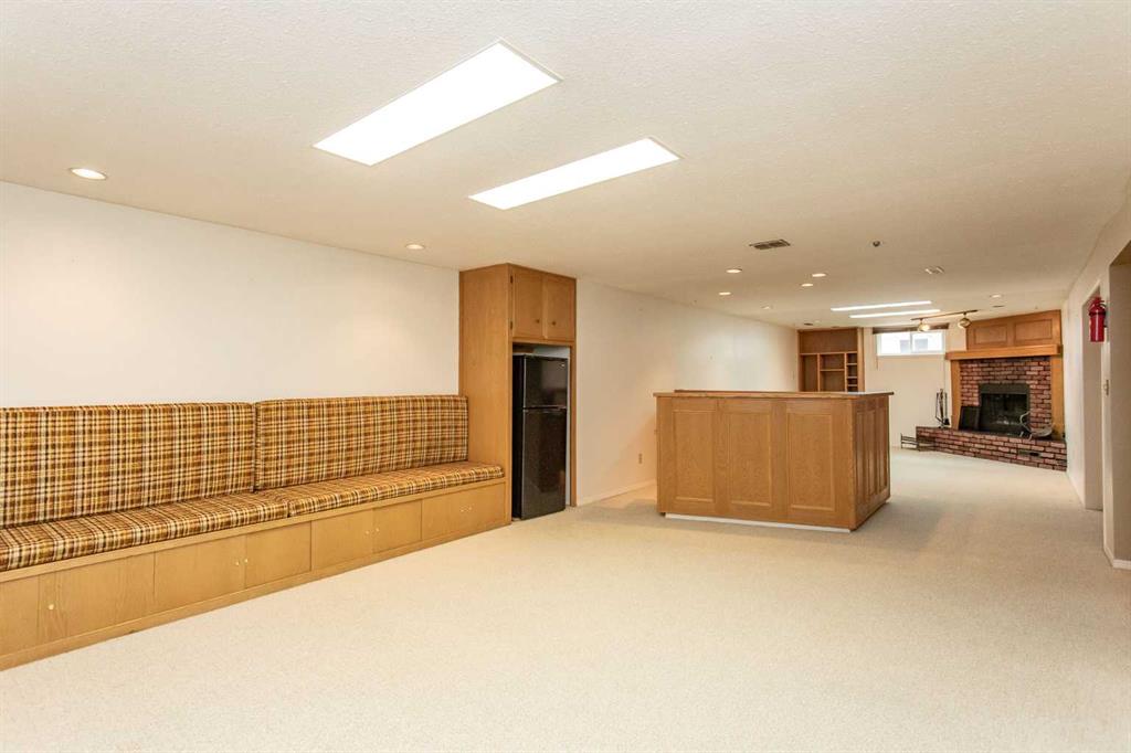 If you are seeking a home in the heart of downtown Lacombe, this well-maintained bungalow offers an excellent opportunity. As only the second owner since its construction in 1967, pride of ownership is evident throughout. The main floor features a spacious kitchen with ample countertop space, a dining area, and a comfortable living room. There are three bedrooms on this level, including a primary bedroom with a two-piece ensuite. One bedroom has been converted to accommodate main floor laundry but may be reverted to serve as a third bedroom if desired. The basement includes a fourth bedroom, a three-piece bathroom, and a large family/games room fitted with a dry bar. Built-in benches convert into double-size beds, making the area ideal for hosting guests. Notable updates include new countertops, cabinetry, backsplash, a large island, abundant oak cabinetry, custom built-ins, modern tile flooring, and the majority of windows replaced. Additional insulation was also added when the siding was updated. Outdoor amenities feature a covered patio with a wood-burning brick fireplace, perfect for use during spring, summer, and autumn. The property includes a single-car garage, fenced yard, garden shed, garden area, and convenient back alley access. Shingles were replaced around 2015.