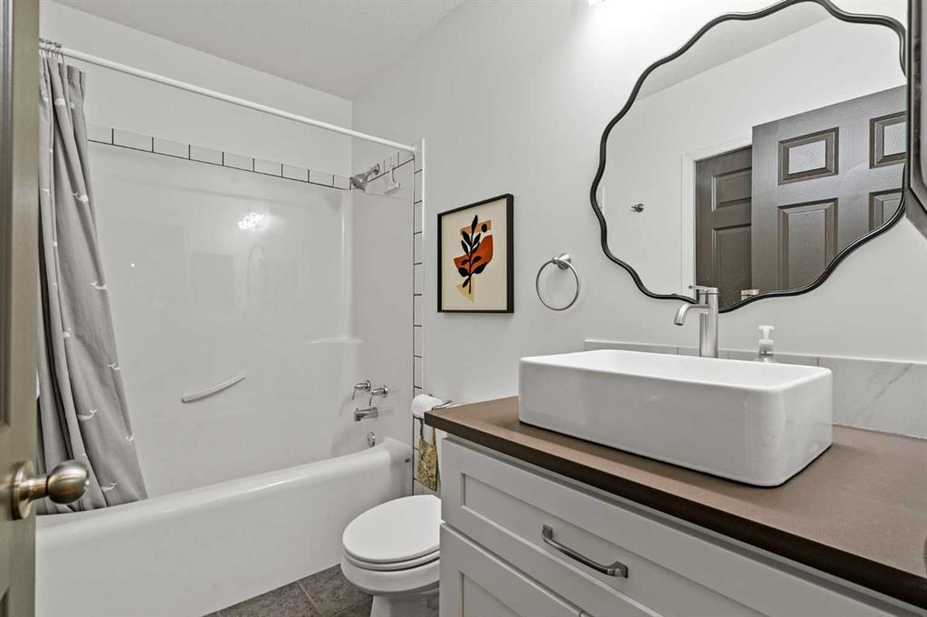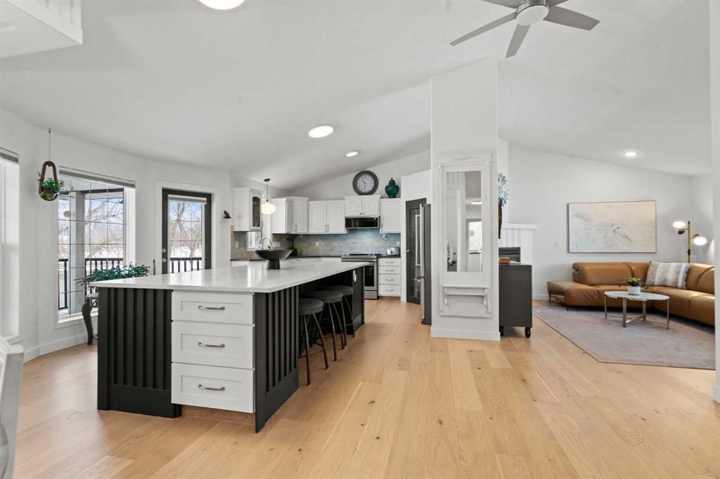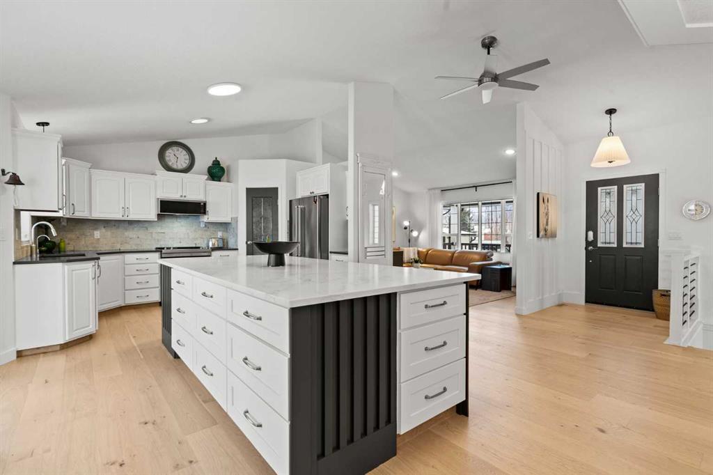 This MOVE IN READY HOME has been thoughtfully updated with features that focus on function in designing this ELEGANT MAKEOVER. A freshly painted front exterior and cozy covered front verandah speak to the classic curb appeal that sets this home apart in a league of it's own. Vaulted ceilings soaring above banks of windows that capture the natural light highlight the open floor plan that flows seamlessly... inviting larger family gatherings or intimate get togethers. A neutral paint palette offsets the gorgeous new engineered hardwood flooring - trimmed with high profile baseboards on the main floor. Masterfully crafted is the focal point of the main floor - a stunning island addition that isn't just an amazing storage and dining area.. it's the hub of this gorgeous family home. Custom designed wood details trim the island and complement the feature walls located in several areas of the house. A massive quartz slab accentuates the grandness of the island and showcases the sleek quartz topped cabinetry at the rear of the kitchen. A refreshed stone tiled backsplash complements the Stainless Steel appliances. Banks of drawers have been added for convenient storage. A spacious Living Room with a re-faced gas fireplace is offset from the kitchen for entertaining. An open-ended dining area boasts enough room for a larger table and a servery/coffee bar has been added for your convenience. The primary suite tucked away at the end of the hall delivers privacy and solitude and features custom wall detailing, a walk in closet and a lovely updated 5 pc ensuite bath complete with a jetted soaker tub and separate shower. Main floor laundry and a 4 pc main bath complete the main level. The bathrooms showcase new quartz topped vanities, tile backsplash and new sinks and taps. Ascending to the loft you are greeted by a spacious room that can be anything you need. Vaulted ceilings, lots of windows and sky lights to brighten the room all day, easy care engineered hardwood flooring... easy to add an area rug for a TV get away/bedroom or perfect as is for a crafters room. The four piece main bath is at the bottom of the stairs to accommodate a bedroom in the loft area. The lower level has a 4 pc bath, two additional bedrooms and plenty of room to add more with legal egress windows and 9 ft ceilings already in place. In floor heat keeps this level cozy in the winter months and the AC keeps the rest of the house cool in the summertime. A massive open recreation area in the lower level will fit your pool table and gaming desires to create a family sized entertainment area. The oversized 24'11"x 24'11" insulated and drywalled garage has in floor heat, and a 220 V power source. In ground sprinklers, a man sized garden shed with power, perennial beds laid with rocks that flank the perimeter and front grounds, and covered front and rear porches to satisfy your outdoor enjoyment complement the mature landscaping. This home is a dream to show! Call today!