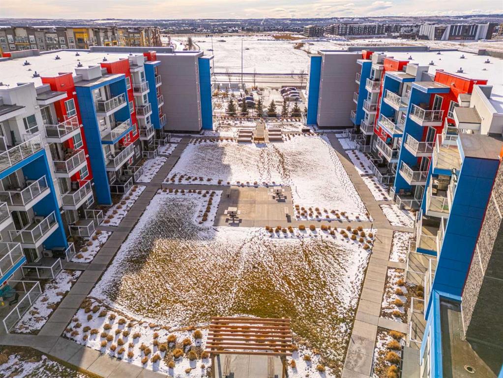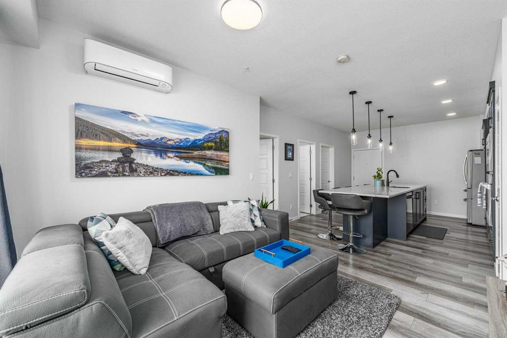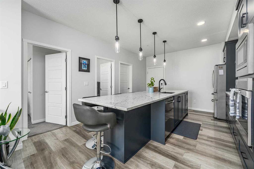 Welcome to this stunning top floor two bedroom, two bathroom condo, flooded with natural light and offering east facing views over an expansive green space. This home includes two titled underground parking stalls, wall unit air conditioning, and the quiet comfort of a well managed, low density complex. Inside, you’ll be impressed by the bright, open layout with high ceilings and a showstopping full length quartz island that comfortably seats six or more, perfect for hosting dinners or casual gatherings. The chef inspired kitchen features stainless steel appliances, an in wall oven, elegant herringbone tile backsplash, upgraded pull out cabinetry, and abundant storage to keep everything effortlessly organized. The spacious living area strikes the perfect balance. Large enough for entertaining yet cozy enough for relaxed evenings at home. The primary bedroom easily accommodates a king size bed and is complemented by a large walk-in closet and a stylish four piece ensuite featuring dual quartz vanities, modern finishes, and a beautiful herringbone tiled shower. A second bedroom offers excellent flexibility for guests or a home office, while an additional four piece bathroom is conveniently located just off the kitchen. Completing the interior is a generous in-suite laundry and storage room, large enough to double as a den or office space. Step outside through the sliding doors to your oversized balcony, where you can enjoy morning coffee and sunshine while overlooking the peaceful green space. At the heart of the complex is a unique central courtyard featuring pergolas, seating areas, manicured lawns, and community garden boxes, a true extension of your living space. The location is exceptional, just steps from South Health Campus, and surrounded by restaurants, cafés, shopping, entertainment, parks, and the world’s largest YMCA, offering swimming, fitness facilities, a public library, and learning programs. All moments from your door. Additional highlights include side-by-side titled underground parking, bike storage, low condo fees, and a quiet, pet-friendly (with board approval) complex with only 78 total units. This is a rare opportunity to enjoy style, space, and unbeatable convenience. A must see!