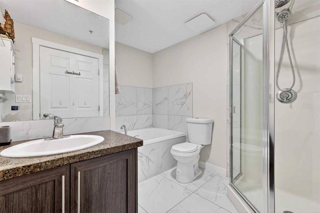 Welcome to this bright and spacious third-floor unit, ideally situated in the boutique ICBM Lofts—an intimate complex of just eight units—offering a rare combination of privacy, comfort, and exceptional inner-city convenience. Located close to shopping, everyday amenities, public transit, and the vibrant energy of 17th Avenue, this well-appointed home also provides easy access for commuting downtown. The thoughtfully designed kitchen features granite countertops, a tiled backsplash, and an abundance of cabinetry, creating both a functional and stylish space for cooking and entertaining. Adjacent to the kitchen is a dedicated dining area with direct access to a private, covered, and enclosed balcony—perfect for enjoying natural light year-round or creating a cozy extension of your living space. The generously sized living room is filled with natural sunlight from large windows and offers a welcoming layout ideal for relaxing or hosting guests. A gas fireplace adds visual charm to the space (currently non-operational), while marble-look tile flooring and soft carpet throughout the unit enhance both durability and comfort. This home offers two well-proportioned bedrooms, providing flexibility for a guest room, home office, or additional living space. The four-piece bathroom is thoughtfully designed with heated floors, a walk-in shower, and a deep soaking tub—creating a spa-like retreat. In-suite laundry with additional storage adds everyday convenience and completes the interior. An assigned parking stall in the covered parkade is included, offering secure and sheltered parking. Residents will appreciate the unbeatable location, just steps from multiple parks, tennis courts, and the Bankview off-leash dog park—perfect for outdoor enthusiasts and pet owners alike. With large windows, abundant natural light, and a prime inner-city location, this well-maintained home presents an excellent opportunity for comfortable urban living in a quiet, community-oriented setting.