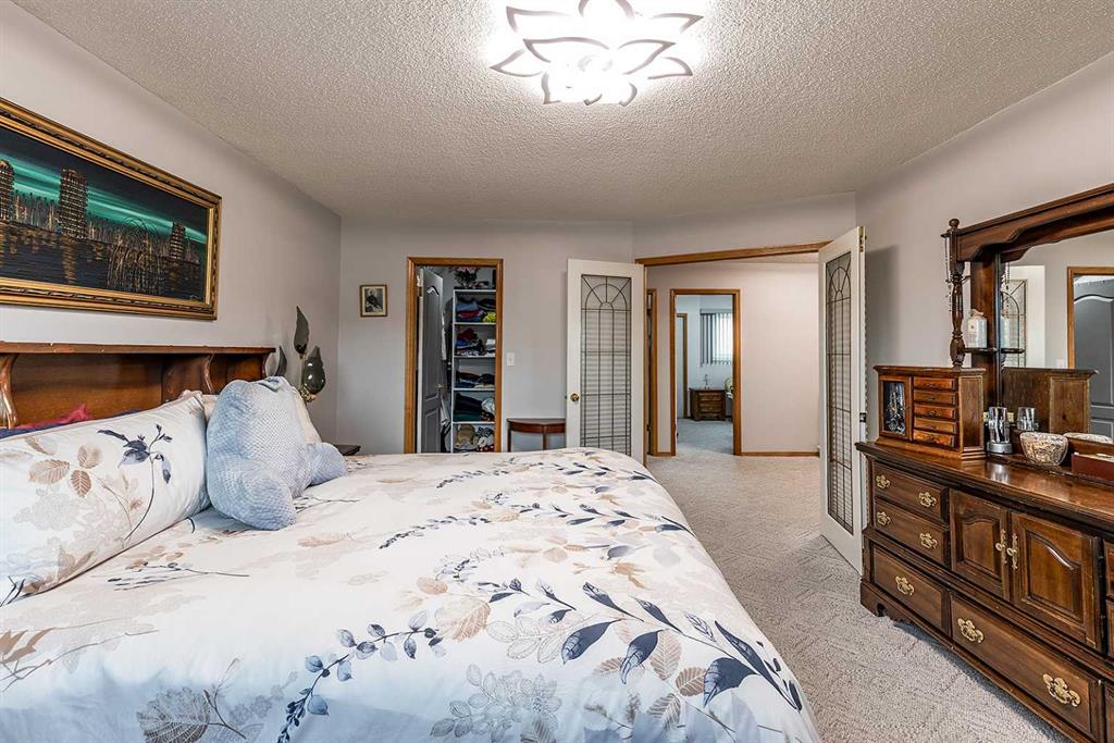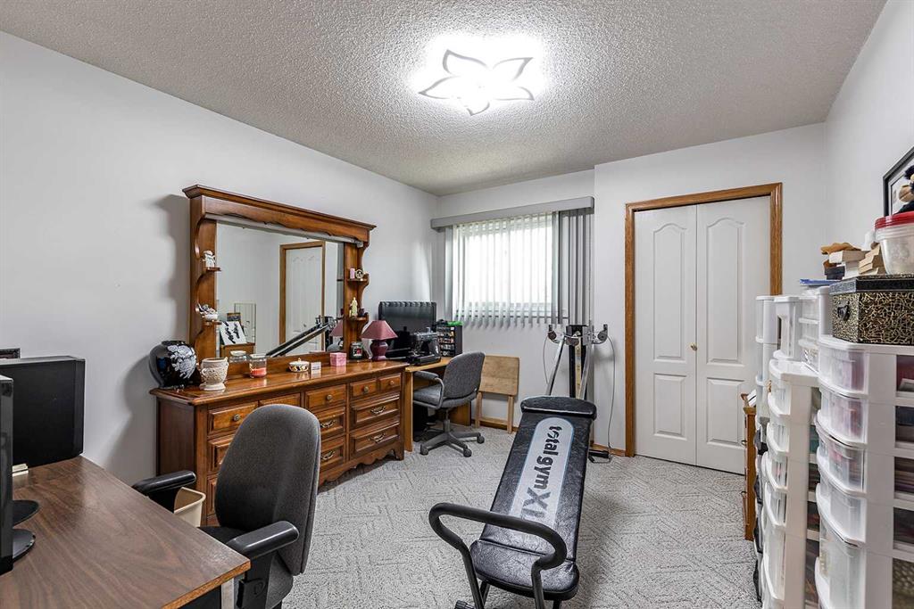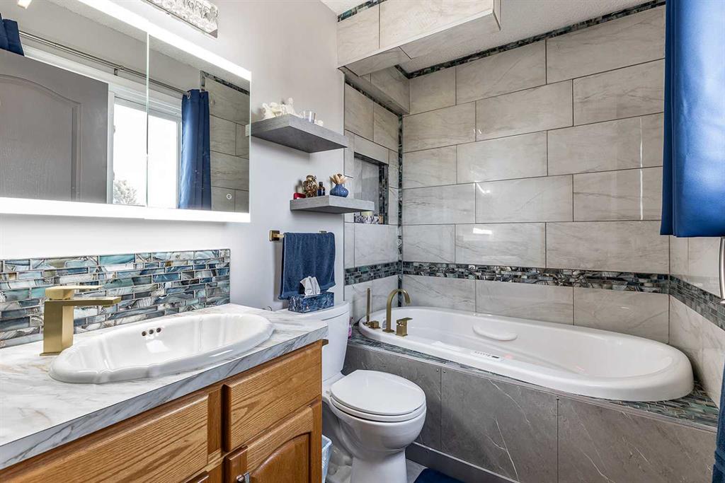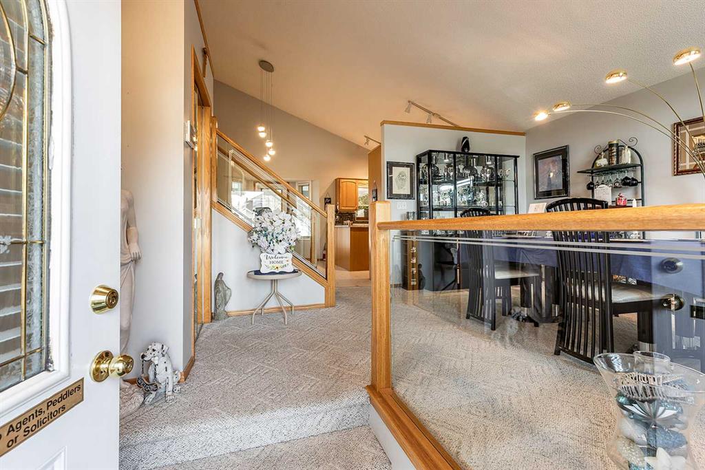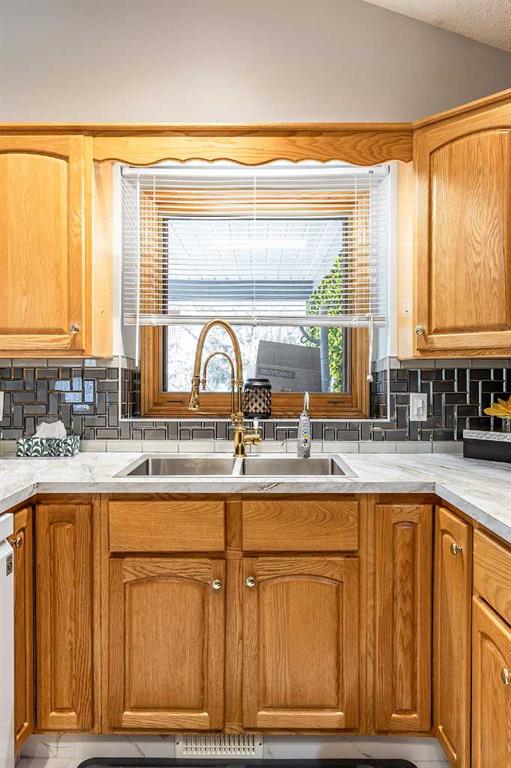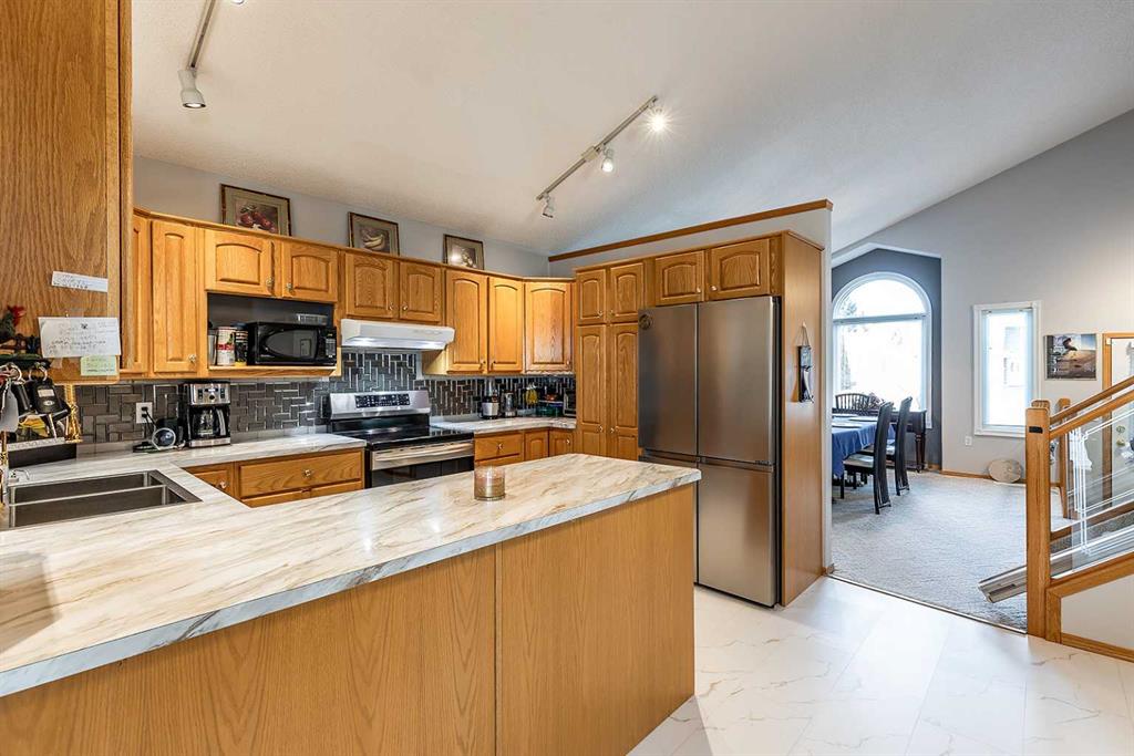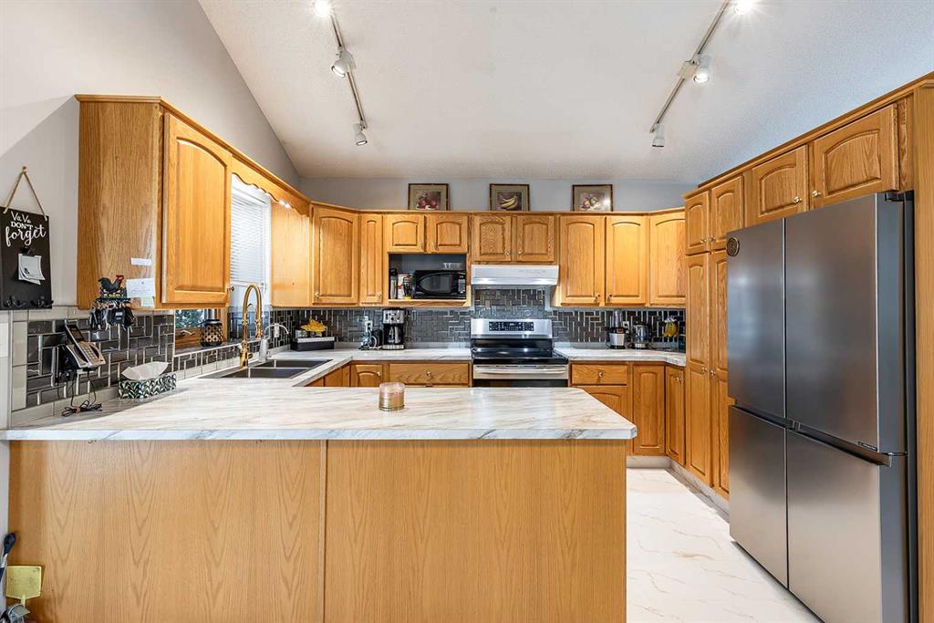 Located in the highly sought-after Parkview neighbourhood, just one minute from the Medicine Hat Golf & Country Club, this well-maintained two-storey split home offers space, flexibility, and a long list of updates. Featuring 3 bedrooms and 3.5 bathrooms, this property is ideal for families looking for a comfortable home in an established location. The main floor welcomes you with a front flex room currently used as a formal dining area, but easily suited for a living room, home office, or play space. The kitchen offers ample oak cabinetry, updated countertops and backsplash, newer stainless appliances (including fridge with ice maker), and a spacious dining area with direct access to the back deck and yard. From here, the layout flows into the large sunken living room, highlighted by a cozy gas fireplace. A convenient 2-piece powder room and main-floor laundry are located just off the attached double garage. Upstairs, you’ll find three bedrooms, including the primary suite featuring a walk-in closet and a private updated 3-piece ensuite with a newer air-jetted tub. A full updated 3-piece bathroom with a newer large spa-style shower completes the upper level. The lower level provides a generous family room, an updated 3-piece bathroom, and a huge storage room, offering plenty of space for recreation and organization. Outside, the fully fenced (Metal) and landscaped backyard is a standout feature. Enjoy the new, oversized two-tier covered deck, underground sprinklers, RV parking, and an abundance of mature fruit including plum and apple trees, raspberry and blueberry bushes. Two sheds ( 16' x 6' and 10' x 9.5') provide additional storage. Notable updates include a new roof (4–5 years), windows (6 years), A/C and furnace (6 years), hot water tank (2024), updated kitchen finishes and appliances, renovated bathrooms, and the new deck. A wonderful opportunity to own a move-in ready home in one of Medicine Hat’s most desirable neighbourhoods. Garage will be reverted back to a fully finished heated garage for possession.