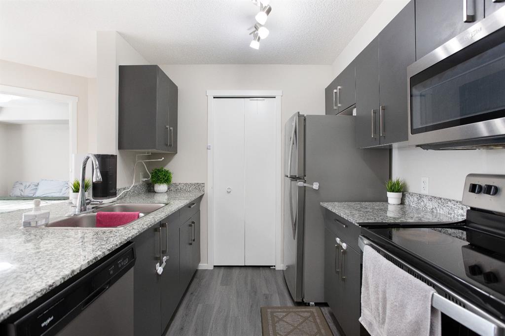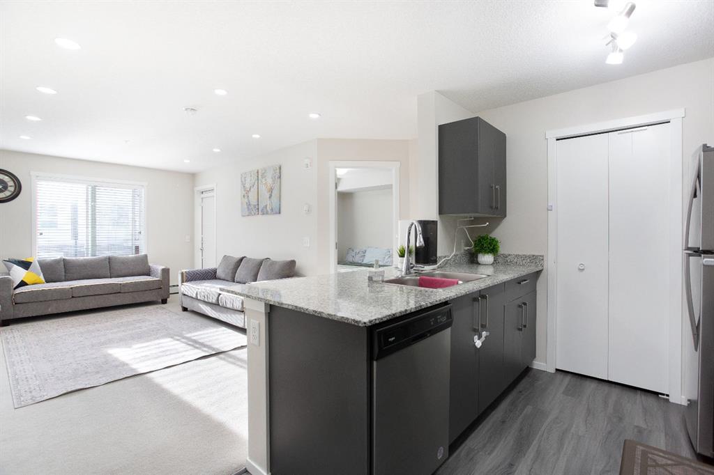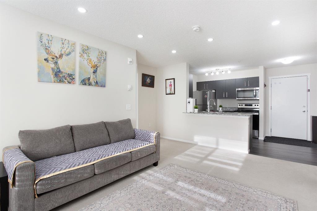 Welcome to this bright and well-maintained two-bedroom, two-bathroom condo in the vibrant Skyview Ranch community, offering 754 sq. ft. of interior living space plus a balcony, for a combined total of over 800 sq. ft. filled with natural light. The modern kitchen features stainless steel appliances, granite countertop, ample cabinetry and a large island with bar seating, ideal for everyday living and entertainment. The kitchen flows seamlessly into the spacious living and dining areas, with a flexible layout suitable for a lounge or home office. Enjoy your private covered balcony or patio, perfect for relaxing outdoors. The primary bedroom includes a walk-through closet and private ensuite. A second bedroom and full bathroom provide excellent privacy for guests, roommates or family. Additional features include in-suite laundry, luxury vinyl plank and carpet flooring and two car titled underground parking stall conveniently located near the stairwell. Visitor parking is available. Building amenities include a fitness centre, while condo fees cover heat, water, outdoor cleaning, landscaping, snow removal, and professional management. Ideally located across from grocery store and Dollarama. Close to Prairie Sky School, on-site daycare, parks, shopping, transit, and major routes including Stoney Trail, Deerfoot Trail and Country Hills Boulevard with quick access to downtown, the airport, and CrossIron Mills. An excellent opportunity for first-time buyers, downsizers, or investors seeking comfort, convenience, and value.
