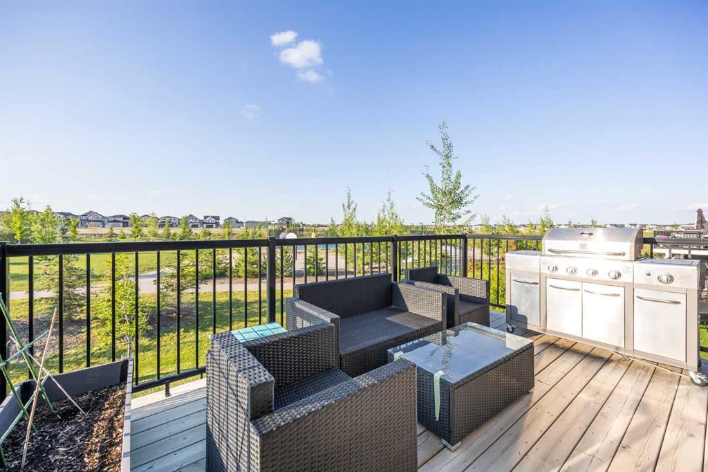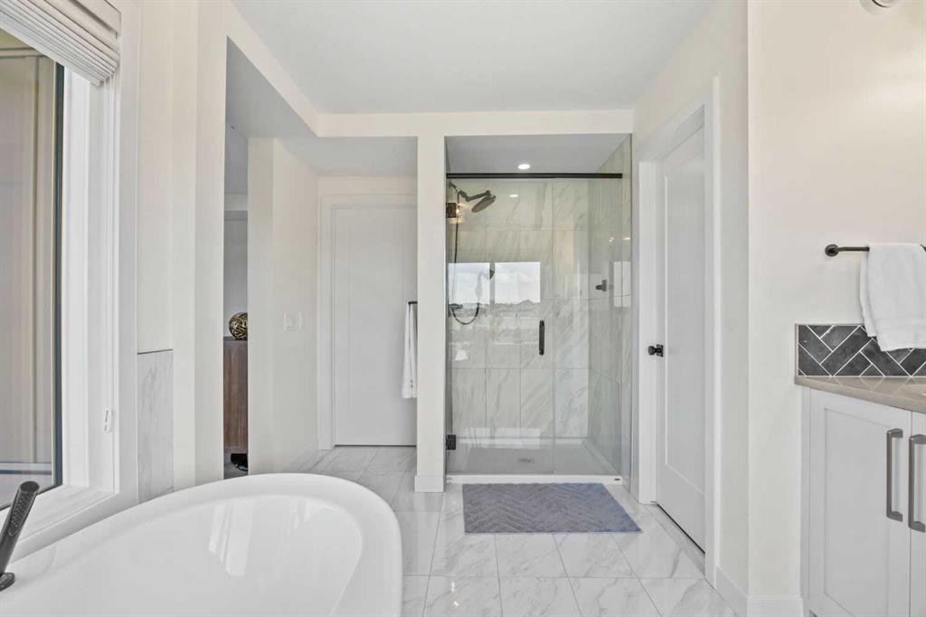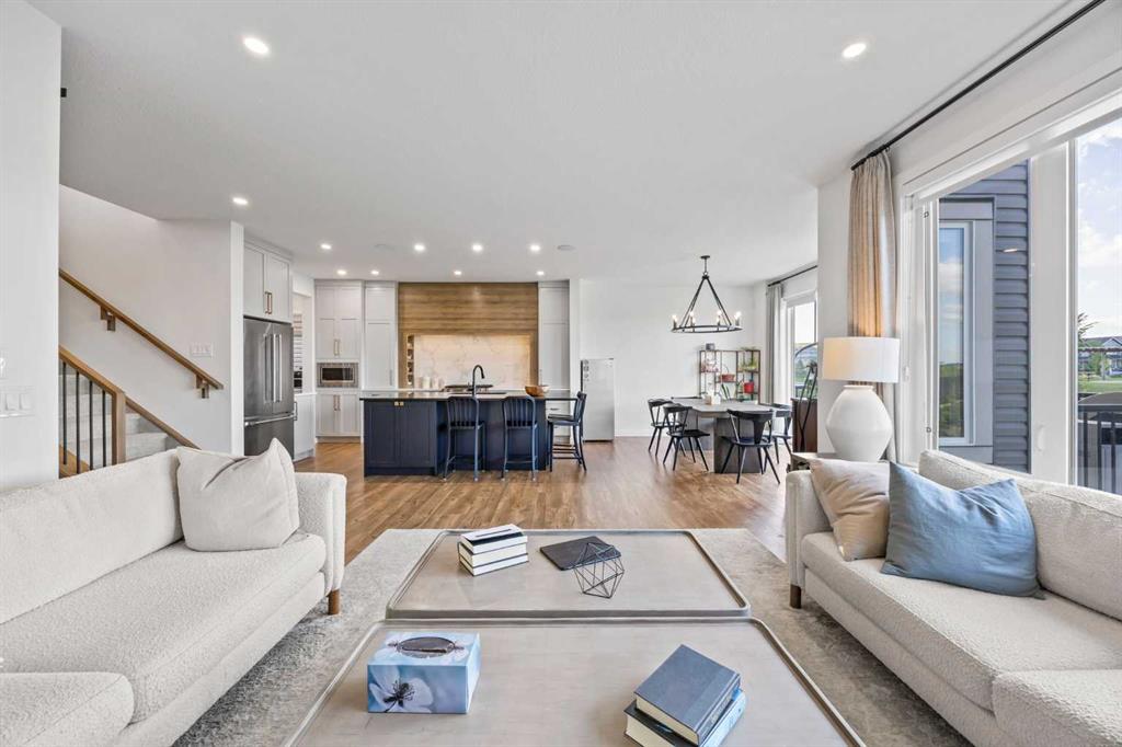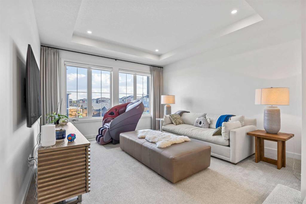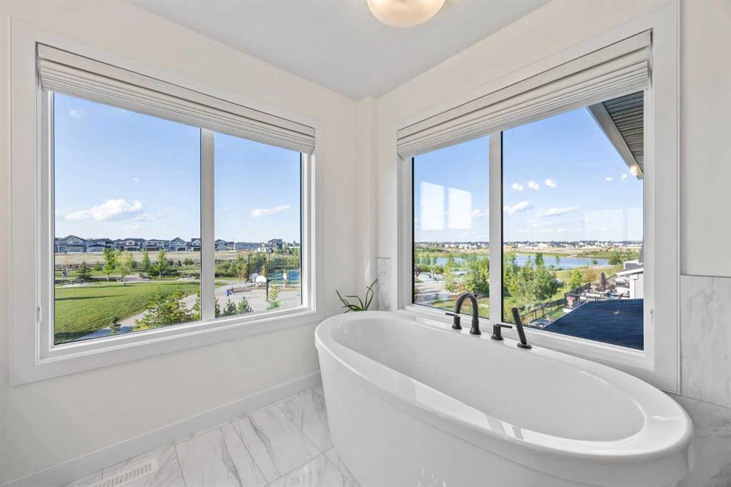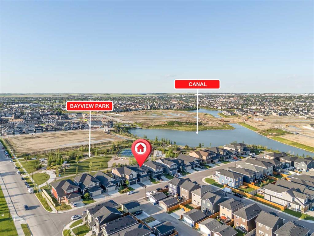 Welcome to this exceptional 30 ft wide former showhome, backing directly onto the scenic Bayview Park, in a vibrant community featuring a tranquil canal system, expansive green spaces, and a future school just steps away. Thoughtfully designed and meticulously upgraded with over $150,000 in high-end finishes, this award-winning residence blends sophistication, comfort, and modern functionality. Over 3600 Sq ft. developed area, the main level impresses with two-tone cabinetry, stacked flooring, and two-tone quartz countertops, beautifully accented by white oak railings and elegant boxed-up ceiling details. The custom kitchen is both stylish and practical, seamlessly connecting to open-concept living and dining areas. A large spa-inspired ensuite bathroom and comfort-height vanities bring a touch of everyday luxury, while triple-pane windows ensure quiet and energy efficiency throughout the home. Upstairs, a generous bonus room with 9 ft ceilings offers a perfect space for relaxing or entertaining. Every bedroom is pre-wired with TV and data ports, reflecting the home’s forward-thinking design. The laundry room is roughed in for a future sink, offering additional convenience. The fully developed basement adds an additional 810 sq ft of living space with 9 ft ceilings, and features a spacious recreational area, a large bedroom, and a full bathroom, perfect for guests, teens, or multi-generational living. In-ceiling speakers are installed on every level, delivering a seamless audio experience throughout the home. Modern amenities continue with a dual-zone furnace system, central air conditioning, and an upgraded 200 AMP electrical panel. The heated garage with an 8 ft overhead door is EV-ready with charging rough-in already in place. Exterior upgrades include Gemstone permanent lighting, an irrigation system, and a hot tub control panel, enhancing the outdoor lifestyle. This is a rare opportunity to own a turnkey luxury home in a premier location—designed to impress and built to last.