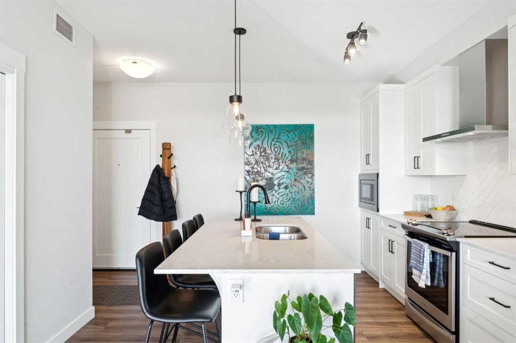 Look no further for your TOP floor unit with beautifully curated interiors and a functional layout. This unique "Pratt" layout by Logel Homes, is for the home buyer who wants a larger single bedroom and larger living quarters- no small bedrooms here! Enjoy upgraded finishings like the herringbone tiled backsplash, stainless steel appliance package, trendy black pendant lights, luxury vinyl plank flooring throughout and an integrated microwave that helps the functionality of the kitchen flow seamlessly. The spacious bedroom accommodates large furniture and welcomes personal items & belongings with a walkthrough closet. Tucked past the closet is a 4-piece ensuite with a tiled bath/shower and sparkling quartz counter tops. The unit has a second bathroom for guests- offering convenience and privacy for the homeowners. Just off the cozy living room are sliding balcony doors that take you to your private outdoor hub- which includes a gas barbecue! We cannot forget to mention, one of the best features of Auburn Bay... LAKE ACCESS! Enjoy year-round exclusive access to the Home Owners Association which includes a splash park, tennis courts, a fishing dock, a boathouse, picnic tables, gymnasiums and more. Nearby services like South Health Campus (3 min drive) and grocery stores, shopping, entertainment and parks just a couple blocks away, makes Auburn Bay a community of choice for many. Complete with a titled parking stall (end stall) and an over-sized storage locker compared to other units, this is an ideal choice for vibrant living in one of Calgary's most desired neighbourhoods. LIKE-NEW, gently lived in, this unit is truly turn-key and could be yours today! *Mortgage at 1.69% may be assumed, subject to buyer qualification and lender approval. Please contact listing agent for details.