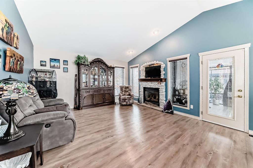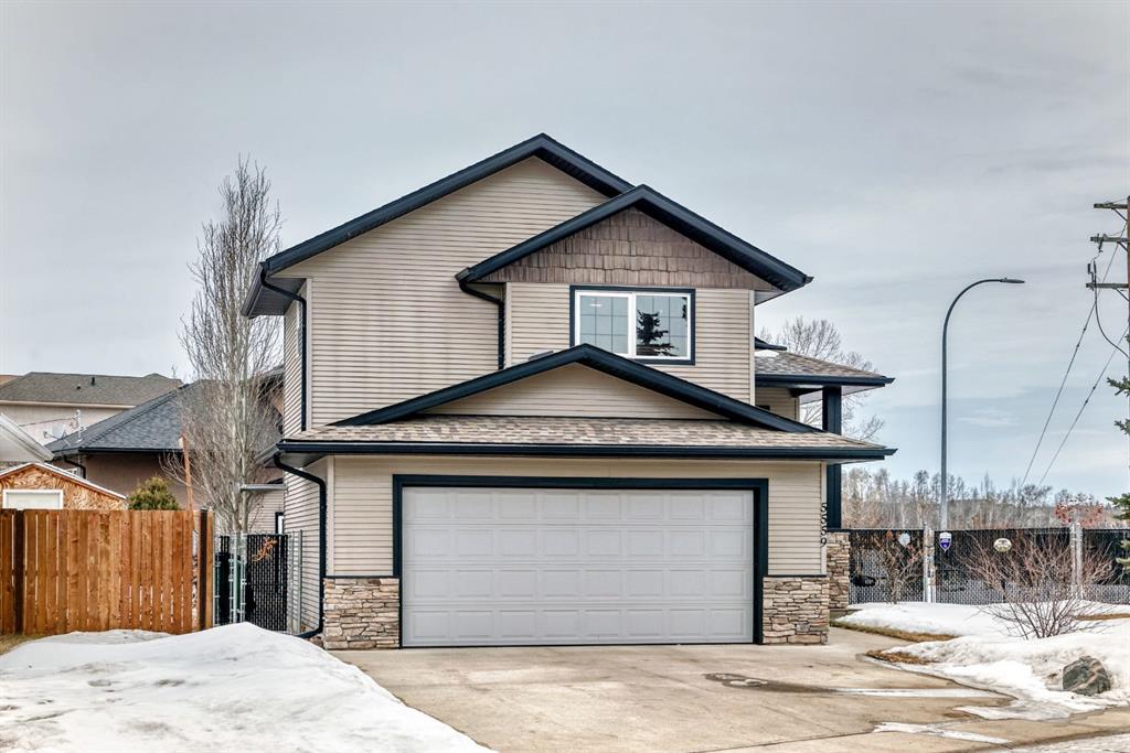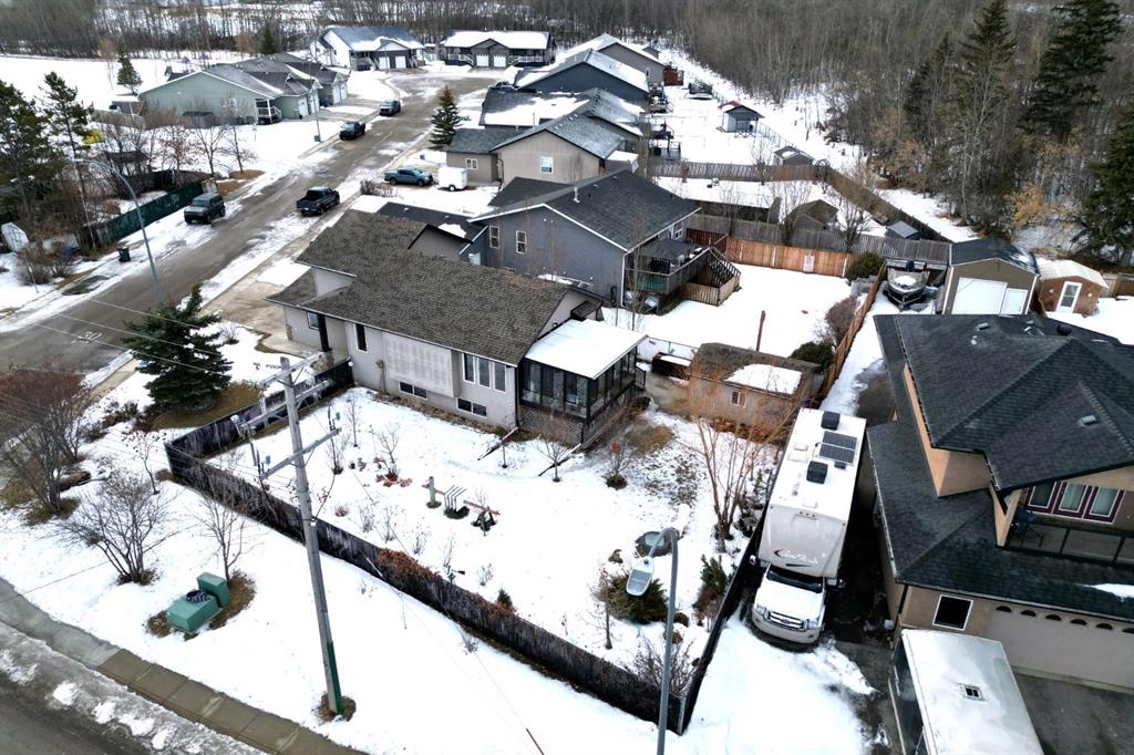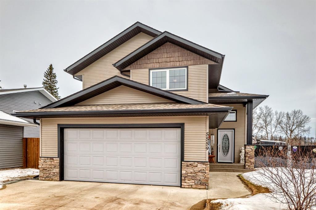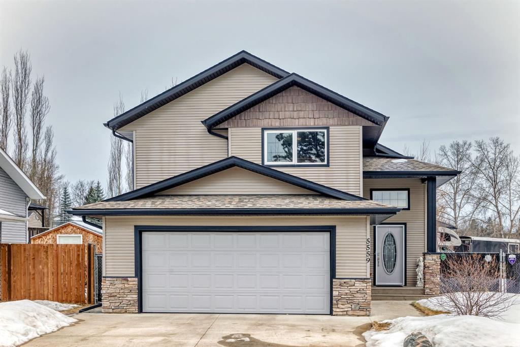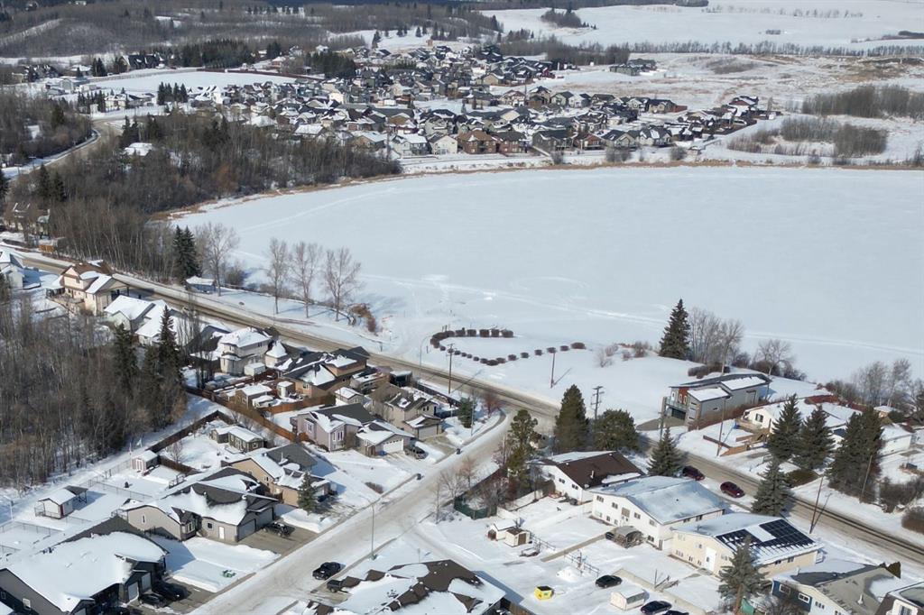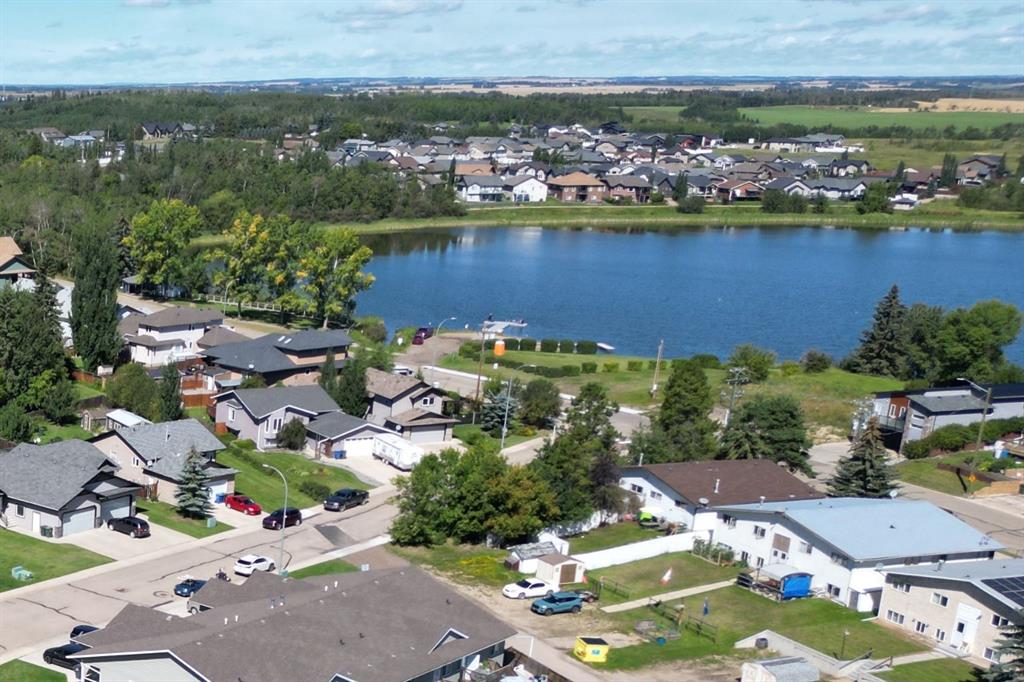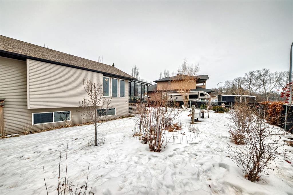 Welcome to this clean, well maintained 3 bed, 3 bath modified bi-level ideally located across from Dodds Lake in Innisfail on a large, fully fenced corner lot with a beautiful west-facing backyard view. You’re welcomed by a spacious tiled entry leading into a bright, open-concept main floor featuring vaulted ceilings, large windows, and an abundance of natural light. The kitchen is both functional and inviting with updated appliances (2022), a centre island with breakfast bar, corner pantry, and plenty of cabinetry. The cozy living room is anchored by a gas fireplace, creating a warm gathering space. Just off the dining area, enjoy the stunning 3-season sunroom, perfect for relaxing while taking in the surroundings. The main floor includes a second bedroom and a full 4-piece bath, while the upper level is dedicated to the spacious primary retreat. The large sized primary bedroom offers a walk-in closet and a generous 5-piece ensuite with dual sinks, a whirlpool tub, and separate shower. The fully finished lower level features a welcoming family/rec room with a second gas fireplace, a third bedroom, another full 4-piece bath, and a huge utility/storage room. The hot water tank was replaced in 2025. Vinyl flooring runs throughout the home for a modern, low-maintenance finish. Additional highlights include an attached heated double garage, plus an exceptional backyard complete with mature trees, raised garden beds, a firepit, and a large powered shed. All this in a prime location close to golf, ski hill, shopping, schools, and with lake views right across the street, a fantastic family home in a sought-after setting.
