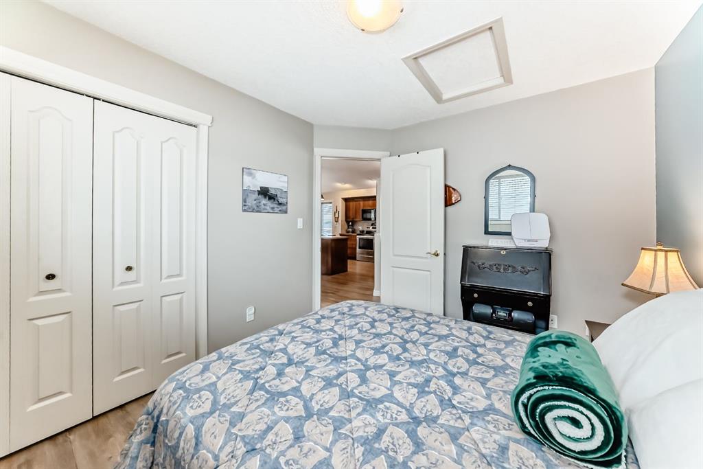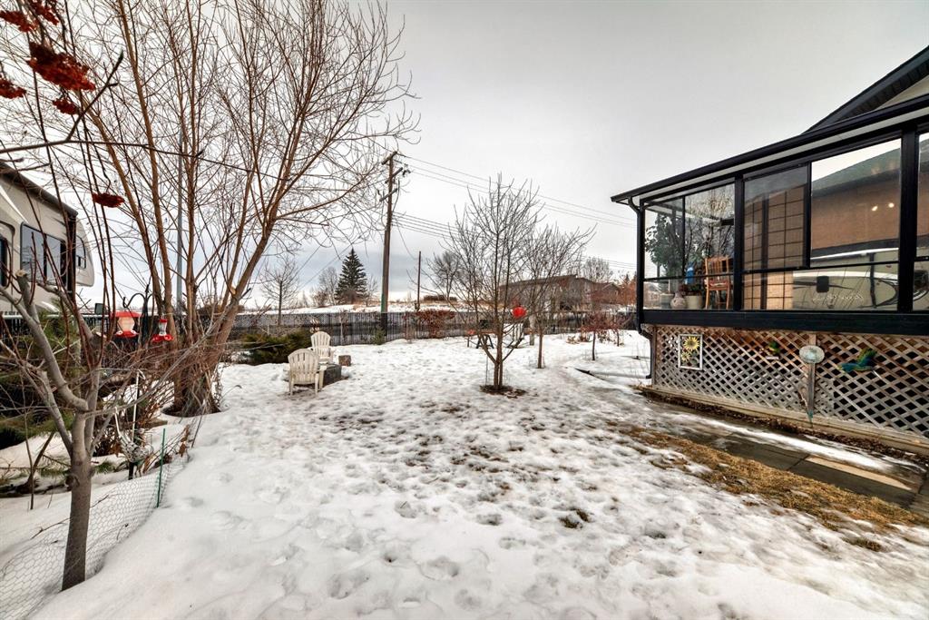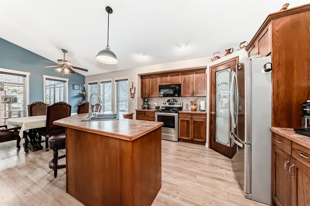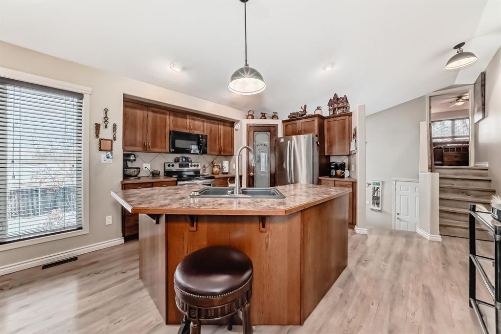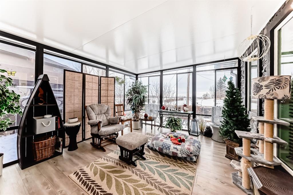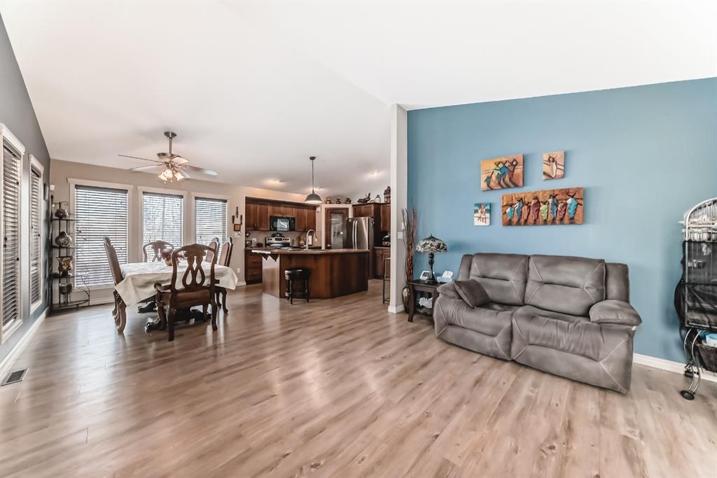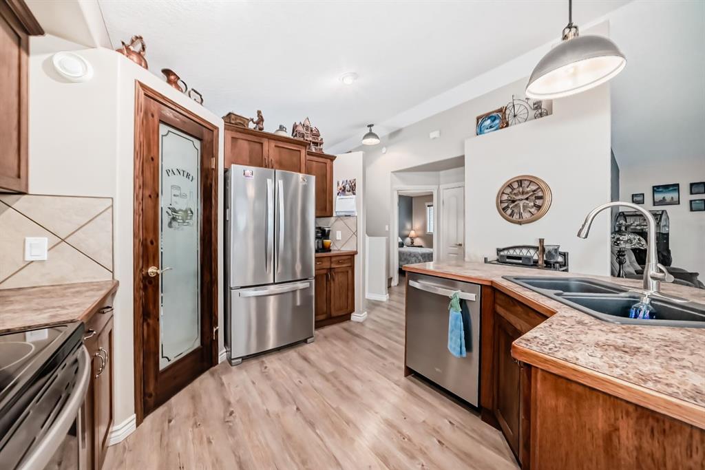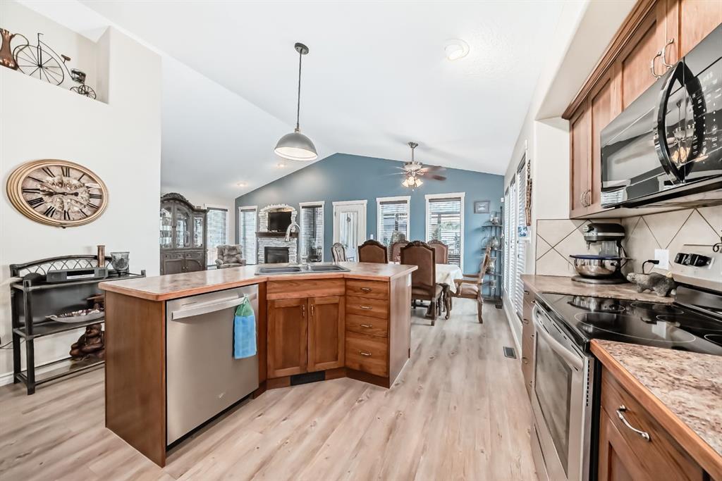 Welcome to this clean, well maintained 3 bed, 3 bath modified bi-level ideally located across from Dodds Lake in Innisfail on a large, fully fenced corner lot with a beautiful west-facing backyard view. You’re welcomed by a spacious tiled entry leading into a bright, open-concept main floor featuring vaulted ceilings, large windows, and an abundance of natural light. The kitchen is both functional and inviting with updated appliances (2022), a centre island with breakfast bar, corner pantry, and plenty of cabinetry. The cozy living room is anchored by a gas fireplace, creating a warm gathering space. Just off the dining area, enjoy the stunning 3-season sunroom, perfect for relaxing while taking in the surroundings. The main floor includes a second bedroom and a full 4-piece bath, while the upper level is dedicated to the spacious primary retreat. The large sized primary bedroom offers a walk-in closet and a generous 5-piece ensuite with dual sinks, a whirlpool tub, and separate shower. The fully finished lower level features a welcoming family/rec room with a second gas fireplace, a third bedroom, another full 4-piece bath, and a huge utility/storage room. The hot water tank was replaced in 2025. Vinyl flooring runs throughout the home for a modern, low-maintenance finish. Additional highlights include an attached heated double garage, plus an exceptional backyard complete with mature trees, raised garden beds, a firepit, and a large powered shed. All this in a prime location close to golf, ski hill, shopping, schools, and with lake views right across the street, a fantastic family home in a sought-after setting.