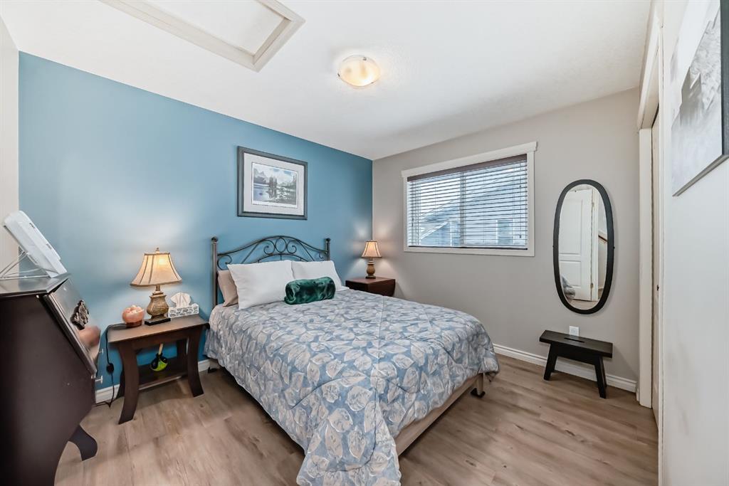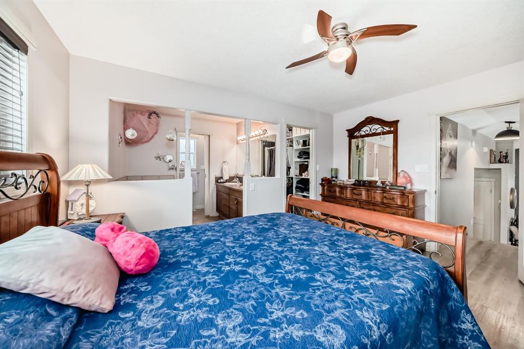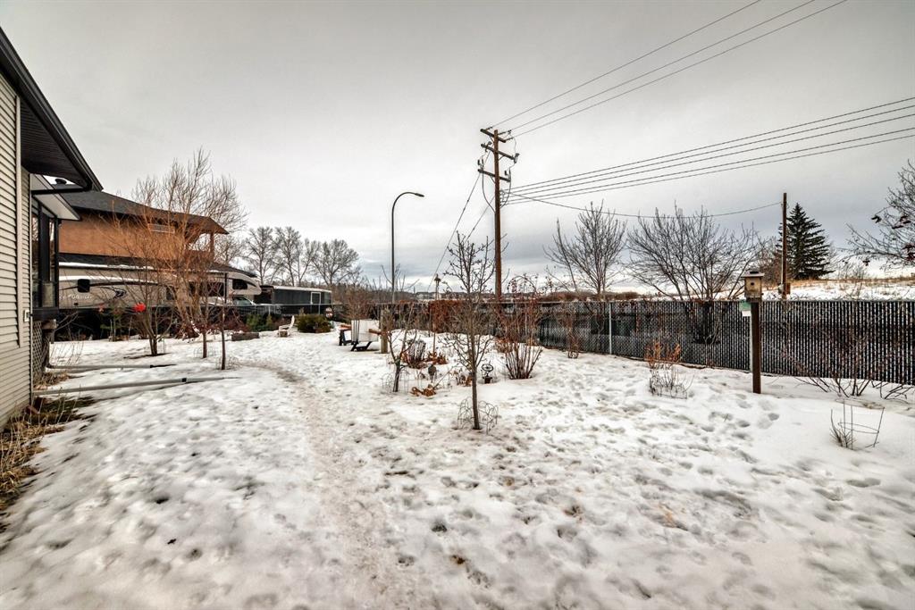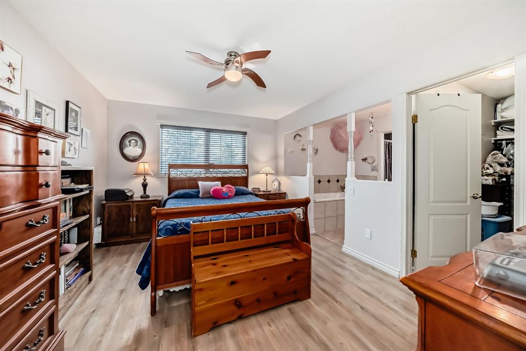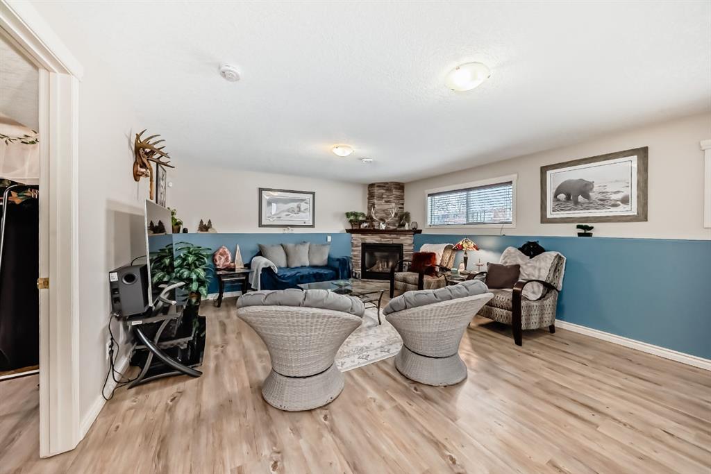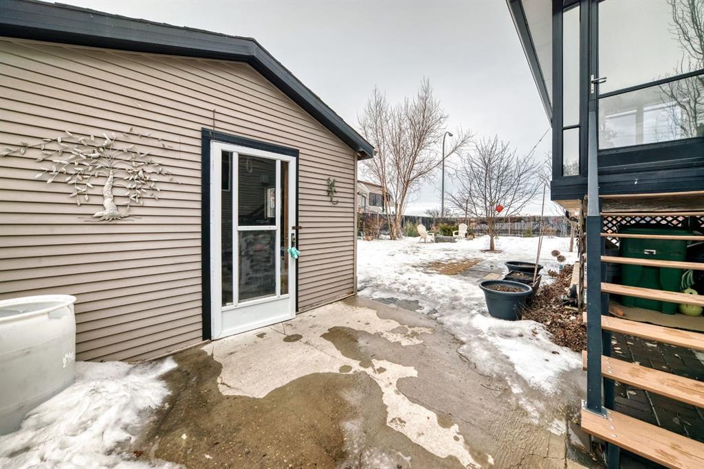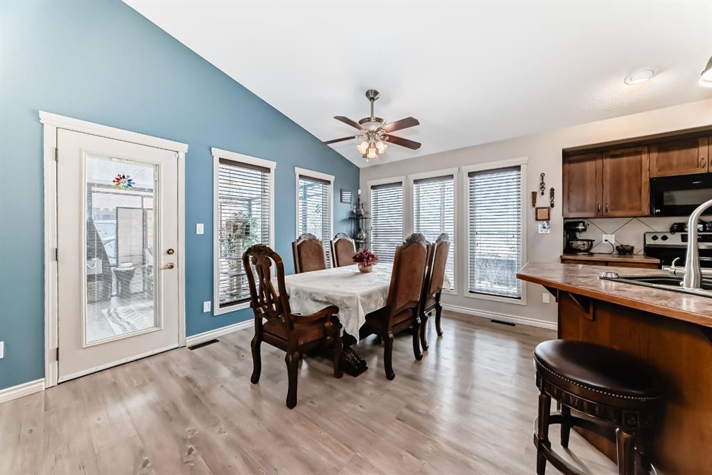 Welcome to this clean, well maintained 3 bed, 3 bath modified bi-level ideally located across from Dodds Lake in Innisfail on a large, fully fenced corner lot with a beautiful west-facing backyard view. You’re welcomed by a spacious tiled entry leading into a bright, open-concept main floor featuring vaulted ceilings, large windows, and an abundance of natural light. The kitchen is both functional and inviting with updated appliances (2022), a centre island with breakfast bar, corner pantry, and plenty of cabinetry. The cozy living room is anchored by a gas fireplace, creating a warm gathering space. Just off the dining area, enjoy the stunning 3-season sunroom, perfect for relaxing while taking in the surroundings. The main floor includes a second bedroom and a full 4-piece bath, while the upper level is dedicated to the spacious primary retreat. The large sized primary bedroom offers a walk-in closet and a generous 5-piece ensuite with dual sinks, a whirlpool tub, and separate shower. The fully finished lower level features a welcoming family/rec room with a second gas fireplace, a third bedroom, another full 4-piece bath, and a huge utility/storage room. The hot water tank was replaced in 2025. Vinyl flooring runs throughout the home for a modern, low-maintenance finish. Additional highlights include an attached heated double garage, plus an exceptional backyard complete with mature trees, raised garden beds, a firepit, and a large powered shed. All this in a prime location close to golf, ski hill, shopping, schools, and with lake views right across the street, a fantastic family home in a sought-after setting.