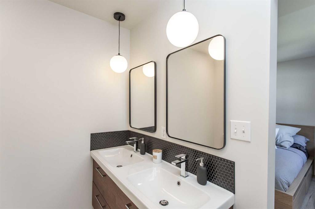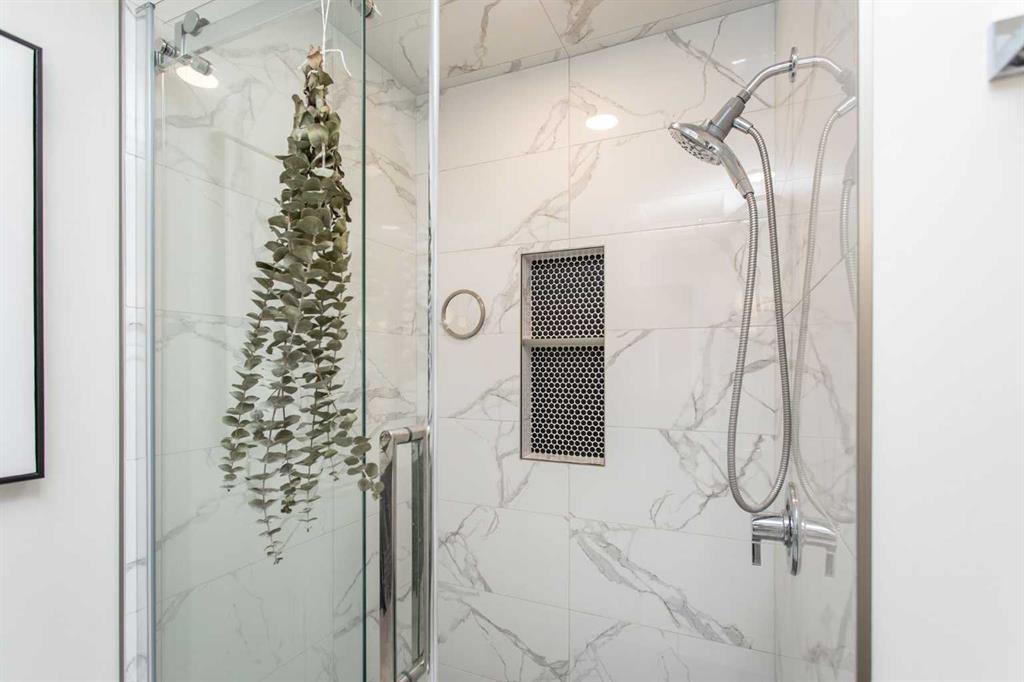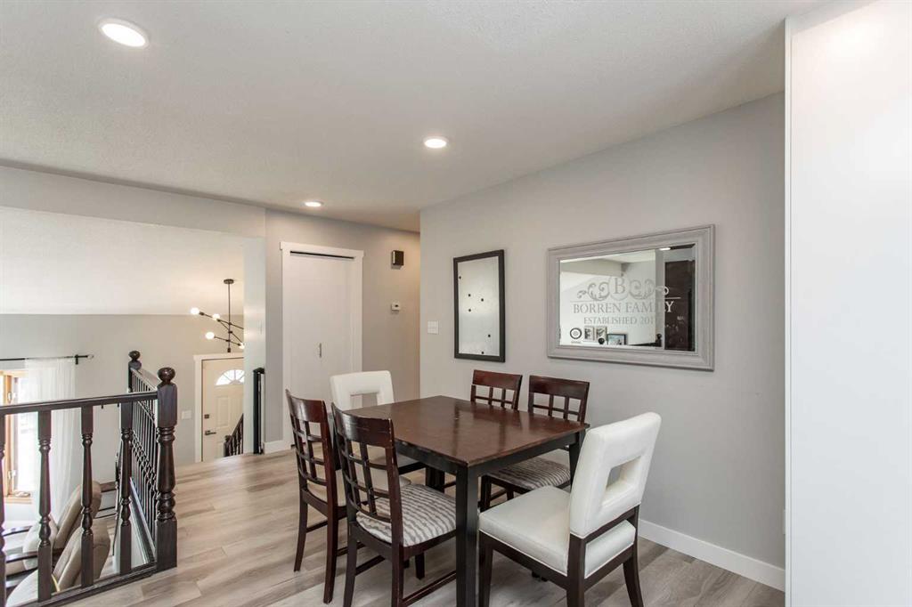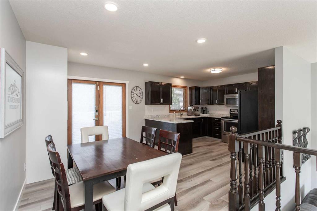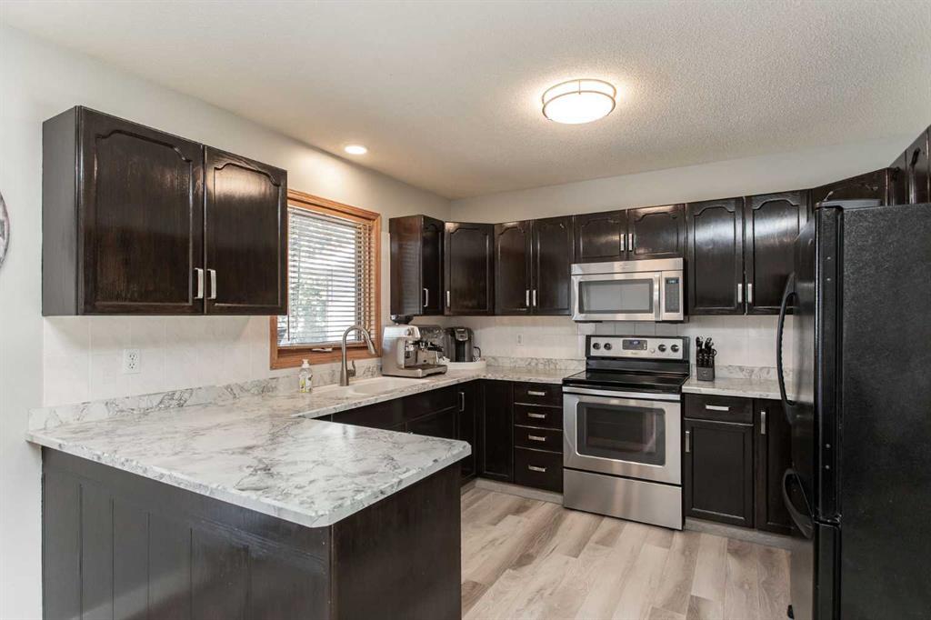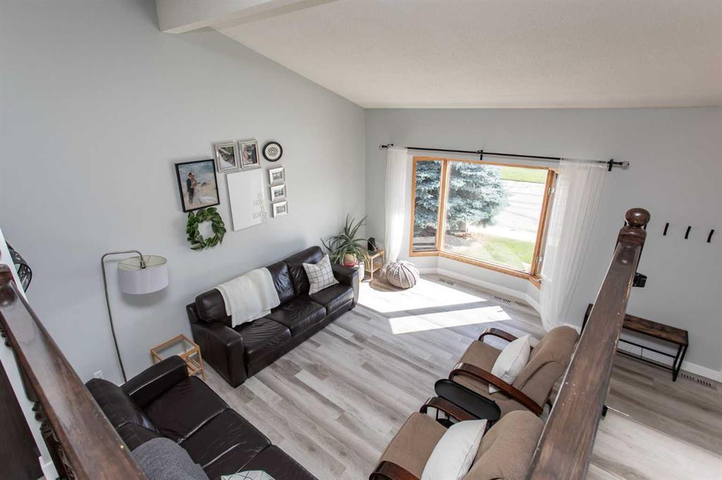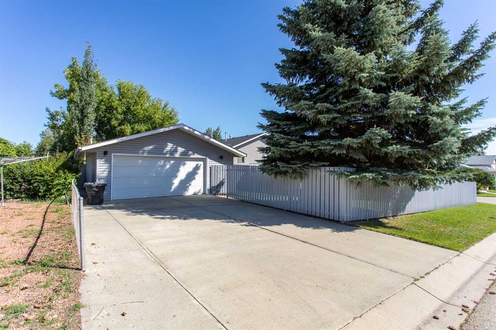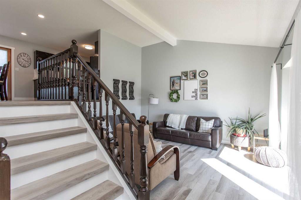 This beautifully updated modified bi-level home is ready to welcome its next family. Located in the centrally situated Bruns Park neighborhood, this property has been thoughtfully renovated by a professional home builder, with quality upgrades throughout that give it a fresh, modern feel. The well-designed floorplan greets you with a bright main-level living room, open to the upper level where you’ll find a spacious kitchen offering an abundance of cabinetry and counter space, along with a generous dining area. Garden doors lead out to the deck, overlooking the backyard—perfect for entertaining or relaxing outdoors. The main floor features three bedrooms, including a spacious primary suite complete with a stunning four-piece ensuite showcasing tile and glass shower details and double sinks. Two additional bedrooms and another four-piece bathroom complete this level. Downstairs, the basement offers a cozy family room with a gas fireplace, a fourth bedroom, a third bathroom, and an oversized storage/utility/laundry room. Additional highlights include a heated double detached garage and a large parking pad providing ample extra parking. Over recent years, the home has seen numerous updates including fresh paint, new laminate countertops, kitchen sink and tap, laminate flooring on the main levels, updated trim and lighting, a new deck and railing, electrical upgrades, air conditioning, and beautiful bathroom renovations. Shingles and siding were replaced in 2015, and Poly B plumbing has been removed. Bruns Park is a fantastic Lacombe location—within walking distance to schools, the multiplex, walking trail system, and downtown amenities.