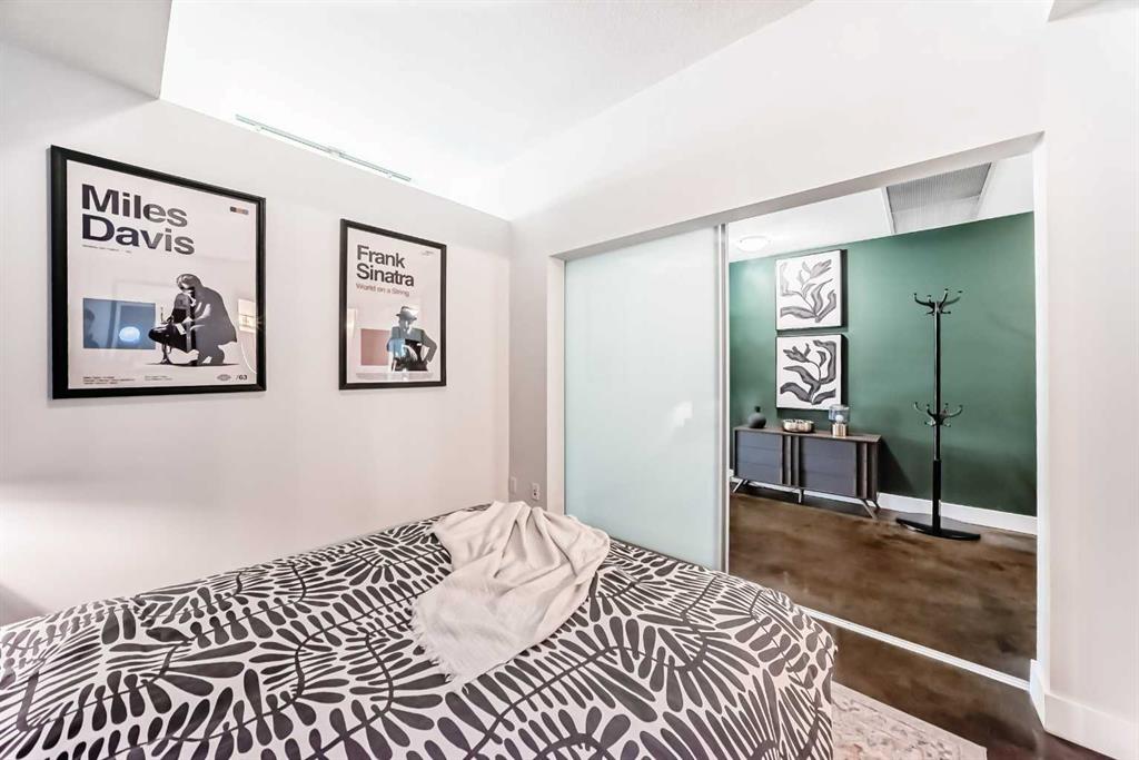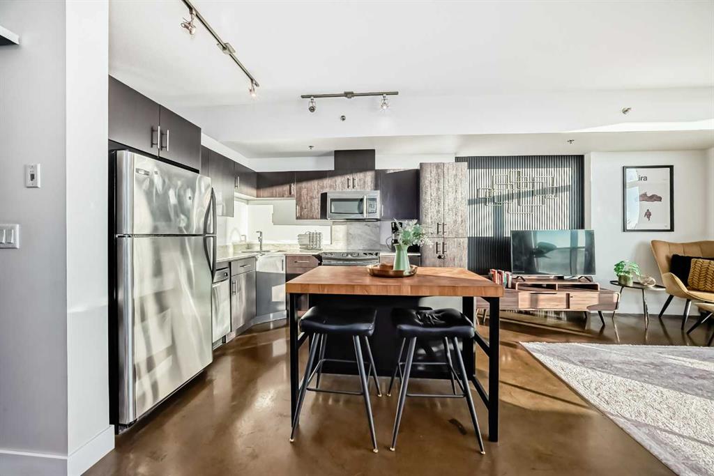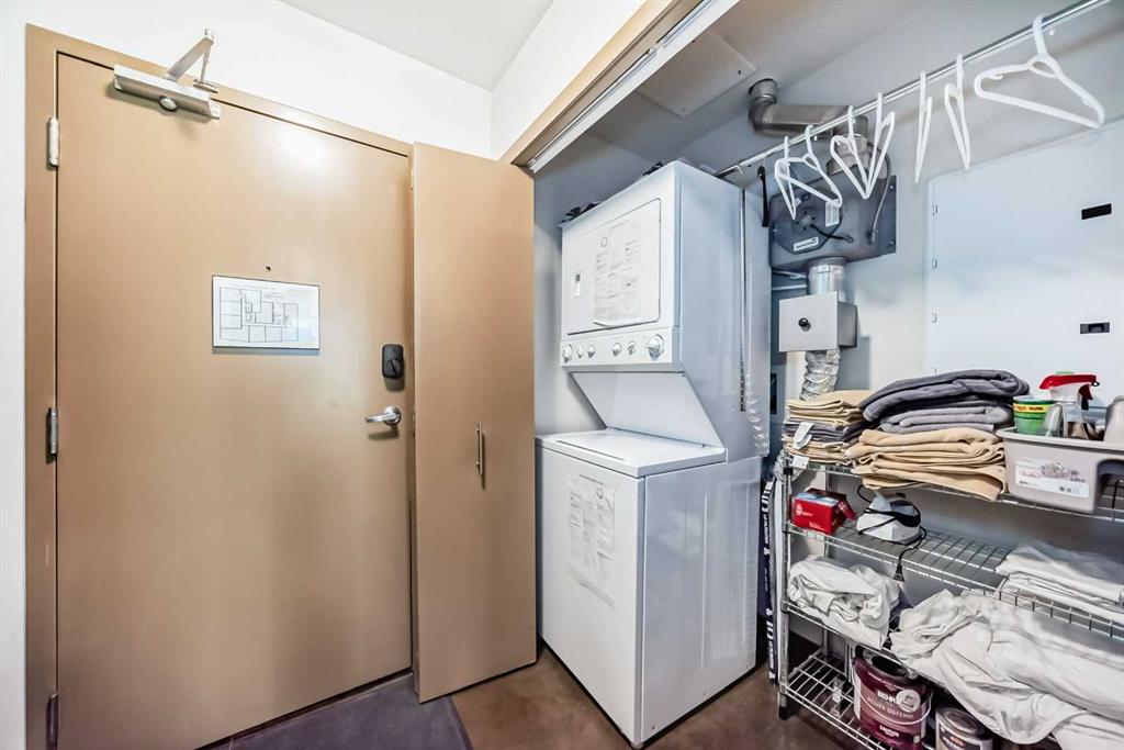 Location, location, location. Situated just one block from the LRT, this exceptional downtown condo offers quick access to the core and is only minutes from all the amenities along vibrant 17th Avenue. Steps from First Street Market and some of Calgary’s most celebrated restaurants including Pat and Betty, Ten Foot Henry, and Calcutta Cricket Club, this home is also within walking distance to the Stampede Grounds, the Saddledome, the upcoming Entertainment District, and everything the Beltline has to offer. Located in the sought-after Colours building, this fully furnished one-bedroom, one-bath residence is short-term rental friendly, making it an excellent investment opportunity. Two elevators welcome you through the trendy lobby and up to the 8th floor, where you’ll enjoy fantastic views from both the living room and private balcony. Polished concrete floors flow throughout the open-concept living, dining, and kitchen areas, while 9-foot ceilings and expansive windows flood the space with natural light, creating an airy and spacious feel. The kitchen offers ample cabinet and counter space, stainless steel appliances, and comes fully equipped for immediate move-in or rental use. If buyers doesn't want furniture, that is something that the seller can take out. A portable island with seating provides casual dining, with plenty of room for a table if desired. Step outside balcony, complete with a gas hookup for convenient BBQing. A large closet houses the washer and dryer and provides extra storage for coats, shoes, or seasonal items. The bedroom features sliding doors and easy access to a spacious four-piece bathroom with a tub and shower combination. Colours residents enjoy communal bike storage, rentable private storage lockers, and a shared outdoor space, with underground parking often available for rent if needed. This unit is ideal for young professionals, first-time buyers, empty nesters, and investors alike. With its unbeatable location and short-term rental flexibility, Colours offers incredible value and lifestyle convenience. What more could you ask for!