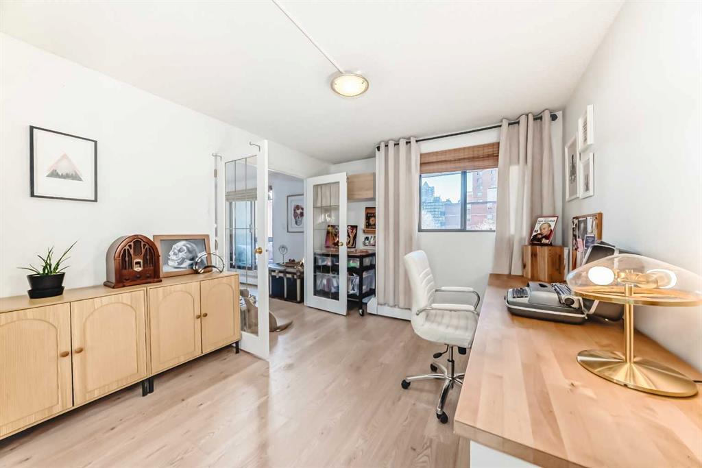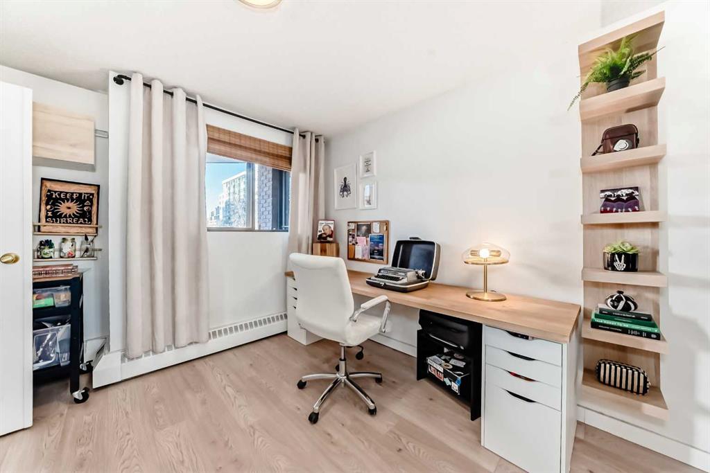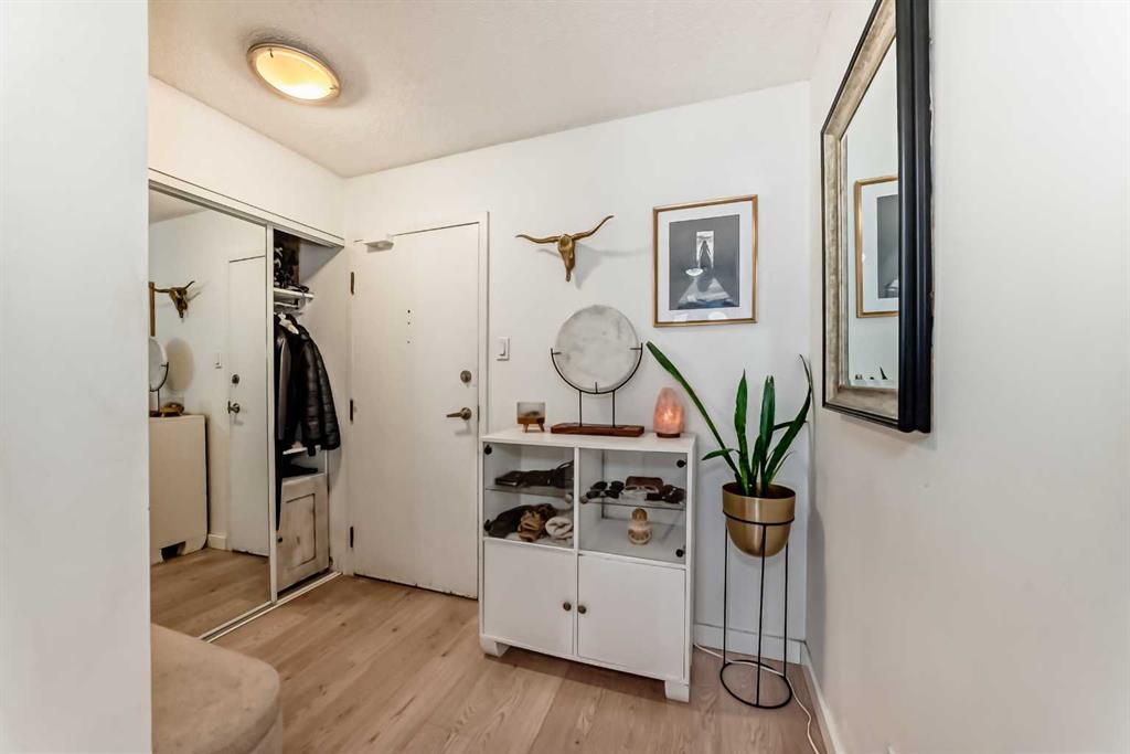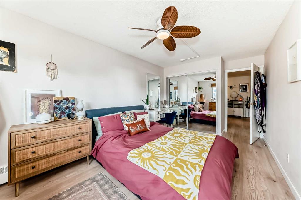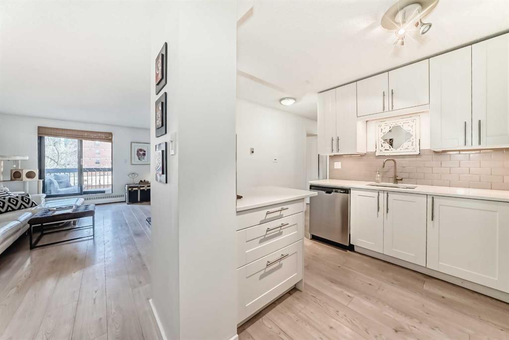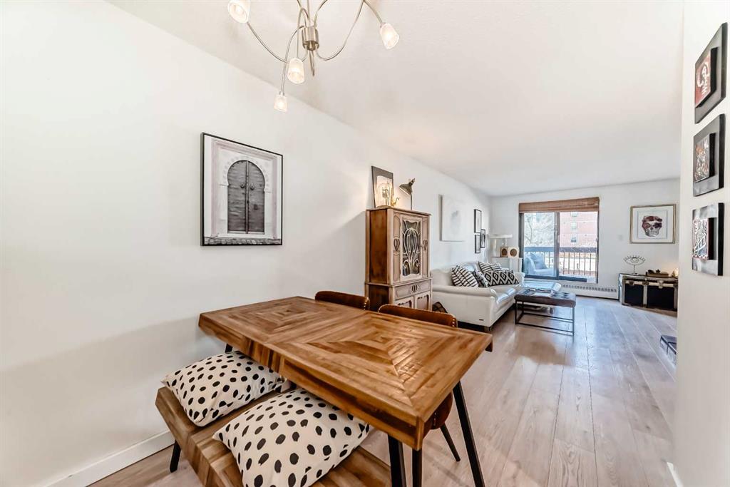 Welcome to this fabulously updated 2 bed/1 bath unit in the heart of the Beltline, just a skip the beautiful Lougheed House, and an easy walk to 17th Ave! Situated in a mature neighbourhood & well managed building, you'll appreciate the bright & airy space with newer luxury vinyl plank throughout. The kitchen features ample storage in the contemporary cabinetry, quartz counters and newer appliances, and loads of room for a good size table in the dining room. The large living area features a gorgeous gas fireplace with smooth facade, and wide slider doors to the huge balcony, flooding the room with light, and ideal for entertaining friends & family. The generous primary bedroom has plenty of room for a king size bed and a private door to access the balcony. The second bedroom is also good sized and features double French doors bring in loads of light. The updated 4 pc bath, with updated vanity & marble counter and in unit laundry/storage complete the tour. The roof top community patio is perfect for relaxing on warm summer evenings. Or enjoy a well deserved sauna in the building after a cold winter walk. The building is ideally situated in a residential area, with parks & playgrounds nearby, and is an easy walk to 17th Ave with fantastic restaurants, shops & grocery. Book your showing today!