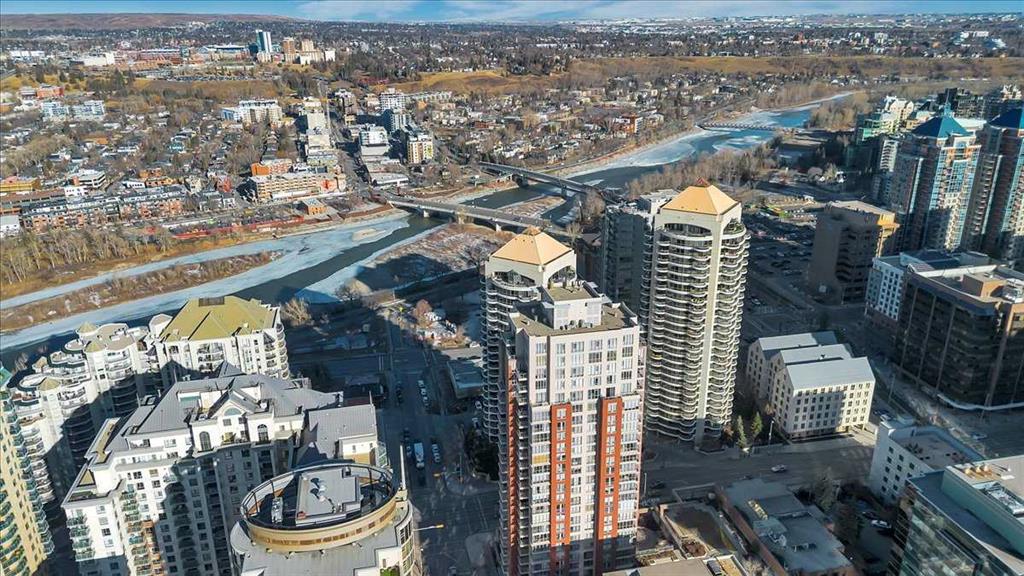 Just imagine working from home, meditating, painting, writing, or just relaxing in a glass enclosed space with an 8th floor river view that is drenched in natural light during the day, and offers a 'sky-scape' view of Calgary's West Downtown at night. At slightly under 775 square feet of living space, this one bedroom plus a den is an affordable starter in one of Calgary's most desirable Inner City neighbourhoods. Within walking distance to a scenic expanse of bike paths along the Bow River, coffee shops, and restaurants, this unit is ideally located for anyone wanting to be in the heart of the City, while at the same time, being just steps away from nature. The unit itself is bright and open with a large open dining and living area that features an expansive wall of windows and an inviting, corner tile-faced fireplace. From both this area and the primary bedroom you have access to the Den/Office/Sunroom. The extra space is unique and inviting, and the glass doors to access it from both sides let in loads of light. The flooring consists of a sandy coloured chestnut laminate for the entire living area, tiles in the front entrance, kitchen, and den, and carpet in the large bedroom. The unit also features in-suite laundry, 1 asssigned underground parking Stall and extra storage, that is completely enclosed to ensure privacy for your contents. The Axxis includes security, a generous amenity/ party room, a gym, a spacious outside living area, and a designated space for any deliveries you have coming. Rare and seldomly available at such a desirable price point, this is an exceptional opportunity for anyone who'd love to become a homeowner and stop paying somebody else's mortgage. Book your showing today!