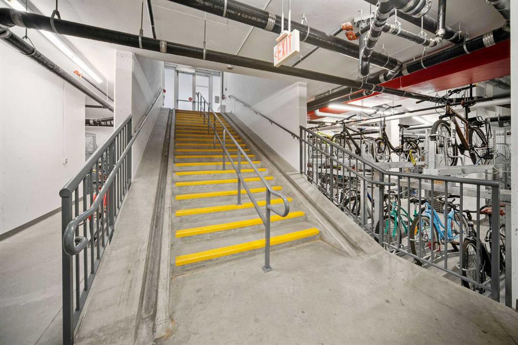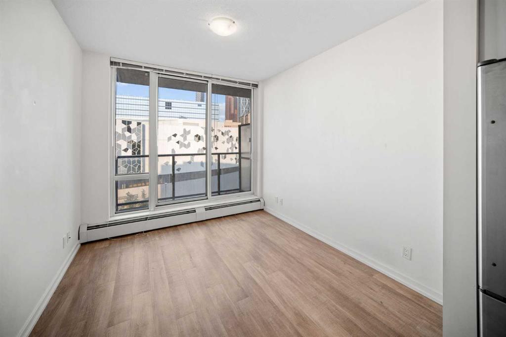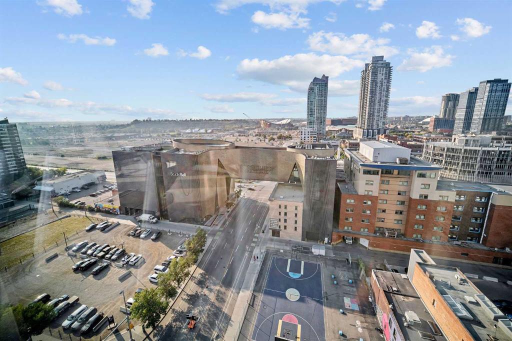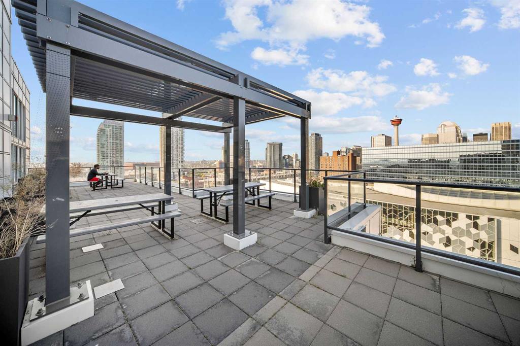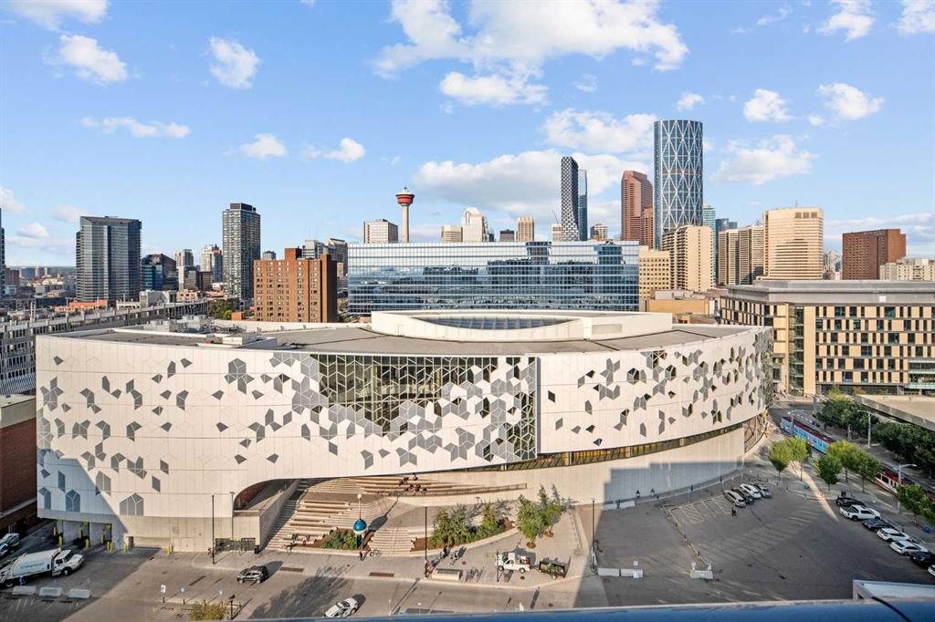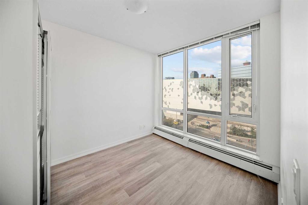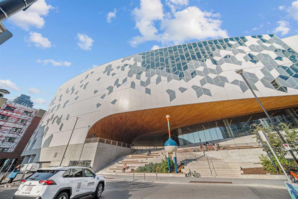 SUN-FILLED SOUTH-FACING 1 BEDROOM + DEN WITH GREAT VIEWS! Located in the heart of East Village, this modern condo offers the ultimate downtown lifestyle. The functional layout includes a spacious bedroom plus a versatile den that can easily serve as a second bedroom or home office. The kitchen features sleek stone counters, ample cabinetry, and a premium stainless steel built-in appliance package, while the combined washer/dryer adds everyday convenience. Enjoy a bright, open living space with floor-to-ceiling windows that showcase daytime sunlight and stunning nighttime skyline views. Step out onto your private balcony to take in the sights of the Central Library. The building is packed with amenities: a rooftop patio with BBQs and 360° city views, a fully equipped gym on the 16th floor, lounge, bike storage, and personal storage lockers. Just steps from the LRT, Studio Bell, restaurants, shopping, and the Central Library, this condo combines style, convenience, and location