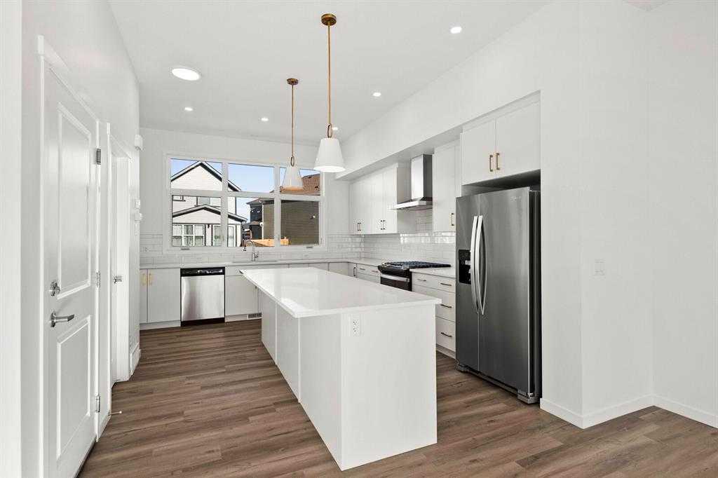 Experience lake-community living in the heart of Mahogany, where beach days, skating, parks, and endless amenities define your everyday lifestyle. This modern 2-storey home (built in 2022) offers 1775 sq ft above grade, elevated by 10 ft ceilings, hardwood flooring, and chic designer touches, including thoughtful customized wall panelling throughout. The bright, open-concept main floor showcases a kitchen with quartz countertops, stainless steel appliances including a gas stove, gold accents, and a spacious island that flows seamlessly into the dining and living areas, perfect for entertaining. Upstairs, you’ll find three generous bedrooms, including a stunning primary with a walk-in closet and a 5-piece ensuite featuring double vanities, a separate tub and standing shower. This home also features a fully developed 2-bedroom LEGAL SUITE with its own private entrance, ideal for multigenerational living, generating rental income, or offering unmatched flexibility. With a west-facing fenced backyard for those golden evening sunsets, a parking pad ready for double car garage development, modern finishes, and access to Calgary’s largest lake, this home truly checks every box. What an incredible opportunity to own a home where style and convenience are already taken care of. *All furniture in the renderings are available for custom order in the exact size, shape, and colour the buyer would like. If you purchase this home, you get access to a selection of furniture to fit your style.