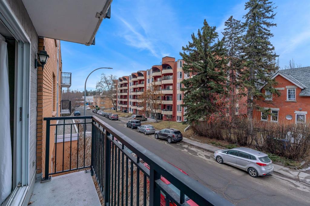 Welcome to this stylish, move-in-ready one-bedroom condo in the heart of Bankview—just steps from the buzz of Uptown 17th Avenue. Tucked into the southwest corner of a quiet, concrete building, this bright third-floor home is flooded with natural light and showcases a smart, modern layout. Durable laminate flooring runs throughout the main living space, where a sun-soaked, south-facing living room opens to a large private balcony—perfect for relaxing or entertaining. A dedicated dining area features a mirrored accent wall that amplifies light and space, while the sleek galley kitchen impresses with glossy white cabinetry, glass tile backsplash, granite countertops, and stainless steel appliances. The cozy bedroom offers plush carpeting and a generous, organizer-equipped closet, and the renovated bathroom is finished with tiled floors, a stylish vanity, and a low-flow dual-flush toilet. Additional perks include ample storage, an assigned outdoor parking stall, and an oversized storage locker conveniently located in the ground-floor laundry room with free access to two washers and dryers. Just minutes from boutique shops, cafés, the Sunalta LRT, and downtown Calgary, this is an exceptional opportunity to live in one of the Beltline’s most desirable communities.