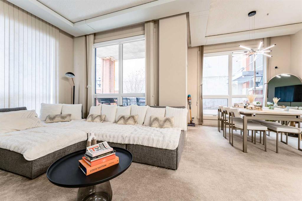Welcome, first-time home buyers, investors, and working professionals! This is your opportunity to own a beautifully appointed ground-floor luxury unit in the highly sought-after London at Heritage Station—one of SW Calgary’s premier high-rise communities. Step into your own private outdoor oasis: a massive, fenced-in patio with green space, perfect for relaxing, gardening, or hosting outdoor gatherings. With its quiet, tucked-away location and direct ground-level access, you’ll enjoy exceptional convenience—come and go without passing through the main entrance, ideal for busy lifestyles or pet owners. Inside, this bright and spacious home impresses at every turn. The expansive living room is flooded with natural light from multiple tall windows, while the 10-foot ceilings enhance the open, airy atmosphere. The home features fresh, professionally painted interior walls, giving the space a crisp and modern feel. The open-concept kitchen features white modern cabinetry, sleek granite countertops with breakfast bar seating, a tile backsplash, a brand-new (2024) electric stove and built-in microwave/hood fan - a wonderful upgrade for cooking enthusiasts. The home also includes newer contemporary light fixtures and remote-controlled window blinds, adding convenience and style throughout. Convenience continues with in-suite front-loading laundry. Both bedrooms are generously sized, offering tall windows, pot lights, and excellent privacy. The primary suite includes a stylish 4-piece ensuite, while the second bedroom is complemented by an additional modern 3-piece bathroom. This well-managed building offers full-time on-site security and comes with a secure underground parking stall. Residents enjoy exceptional amenities, including a 17th-floor rooftop patio with breathtaking downtown and mountain views, a common rooftop terrace and party room, heated indoor access to Save-On-Foods and the attached shopping plaza. Commuting is effortless as location is just steps to Heritage LRT station. Situated on Horton Road SW, you’re just minutes from schools, playgrounds, parks, shopping, restaurants, and walking paths—everything you need for a connected, walkable lifestyle. Whether you're seeking your first home, an investment property, or a stylish professional retreat, this unit offers the perfect blend of luxury, privacy, and convenience. Don’t miss your chance—book your private showing today!