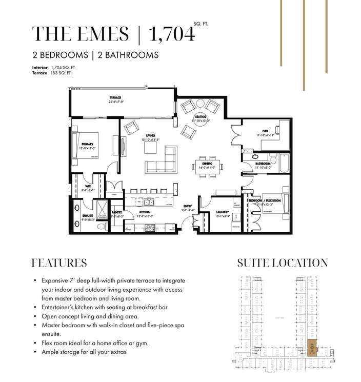 For more information, please click the "More Information" button. Step into a residence where thoughtful design meets modern luxury, offering a lifestyle of comfort, convenience, and sophistication. The spectacular 7-foot-deep private terrace seamlessly integrates the indoor and outdoor living experience. Enjoy direct access from both the primary bedroom and living room - ideal for relaxing mornings, evening gatherings, or entertaining guests in style. The entertainers kitchen is a chef's dream, featuring a spacious breakfast bar with seating. Perfect for hosting friends or enjoying casual family meals, this kitchen is the heart of the home. It's open-concept living area flows effortlessly into a separate dining space, creating a bright and inviting environment for gatherings, celebrations, or quiet evenings at home. Retreat to the primary bedroom, complete with a walk-in closet and four-piece ensuite. This private sanctuary offers comfort and elegance, providing the perfect escape at the end of the day. A versatile flex room adapts to needs - ideal as a hoe office gym, creative studio, or guest space. This suite provides ample storage solutions throughout, including a large walk-in pantry, ensuring there's a place for all the extras and essentials, keeping the home organized and clutter-free. Photos contain digitally rendered and/or sample images.
