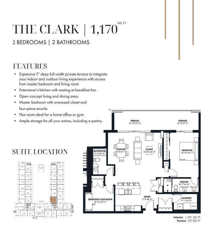 For more information, please click the "More Information" button. Step into a residence where thoughtful design meets modern luxury, offering a lifestyle of comfort, convenience, and sophistication. The spectacular 7-foot-deep private terrace seamlessly integrates the indoor and outdoor living experience. Enjoy direct access from both the primary bedroom and living room - ideal for relaxing mornings, evening gatherings, or entertaining guests in style. The entertainers kitchen is a chef's dream, featuring a spacious breakfast bar with seating. Perfect for hosting friends or enjoying casual family meals, this kitchen is the heart of the home. It's open-concept living area flows effortlessly into a separate dining space, creating a bright and inviting environment for gatherings, celebrations, or quiet evenings at home. Retreat to the primary bedroom, complete with a walk-in closet and four-piece ensuite. This private sanctuary offers comfort and elegance, providing the perfect escape at the end of the day. A versatile flex room adapts to needs - ideal as a hoe office gym, creative studio, or guest space. This suite provides ample storage solutions throughout, including a large walk-in pantry, ensuring there's a place for all the extras and essentials, keeping the home organized and clutter-free. Experience the perfect harmony of style, comfort, and functionality in this beautifully appointed condo home, thoughtfully designed for today's lifestyle. It's expansive 7-foot-deep, full width private terrace seamlessly integrates an indoor and outdoor living experience. Enjoy direct access from the primary bedroom and living room - ideal for morning coffee, evening relaxation, or entertaining guests in a tranquil setting. The kitchen is a culinary centerpiece, featuring a spacious breakfast bar with seating. Whether hosting friends or preparing family meals, this kitchen inspires connection and creativity. The open-concept living and dining area offers a bright inviting space for gatherings, celebrations, or quiet nights at home. Large windows fill the area with natural light, enhancing the sense of openness and warmth. Hideaway in the primary bedroom, complete with an oversized closet and four-piece ensuite. This private sanctuary provides comfort and elegance, perfect for unwinding at the end of a day. A versatile flex room adapts to needs - ideal as a home office, gym, creative studio, or guest space. This suite offers ample storage solutions throughout, including a convenient pantry, providing ample space for belongings and necessities, so the home stays tidy and well-organized. Photos contain digitally rendered and/or sample images.