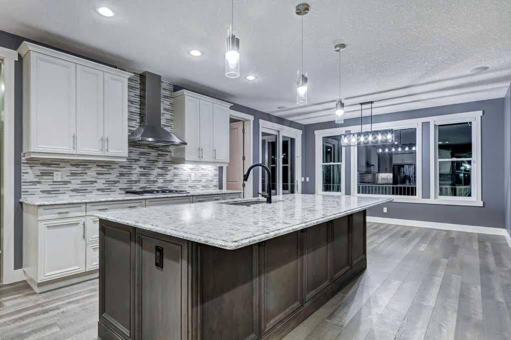 Welcome to this exceptional detached estate home located in the highly sought-after community of Springbank Hill. Built by Avi Homes, this impressive 3,081 sq. ft. residence is situated on a generous 10,000 sq. ft. south-facing walkout lot, offering abundant natural light and breathtaking mountain views. The main level is designed to impress, featuring soaring 20 foot ceilings in the great room, oversized windows, rich hardwood flooring, and a striking floor-to-ceiling stone fireplace with custom mantels. The gourmet kitchen is ideal for both everyday living and entertaining, complete with elegant cabinetry, granite countertops, stainless steel appliances, a walk-in pantry, and ample workspace. A dedicated home office with built-in desk and storage, formal dining room, and a spacious mudroom with lockers and storage complete the thoughtfully designed main floor. Upstairs, you’ll find four generously sized bedrooms, all with walk-in closets. The luxurious primary suite faces southwest and captures stunning Rocky Mountain views. It features a spa-inspired 5-piece ensuite and an expansive custom walk-in closet, with direct access to the conveniently located upper-floor laundry room. The professionally finished walkout basement, completed by award-winning Calgary builder Ultimate Renovations, offers an incredible extension of living space. Highlights include a custom fitness room, large recreation room with a built-in gas fireplace and floor-to-ceiling stone surround, a wet bar with wine storage and a tucked-away 5th bedroom and 4-piece bathroom, perfect for guests. Car enthusiasts and hobbyists will appreciate the massive oversized triple heated garage, equipped with 240V power, floor drains, and an additional overhead door providing backyard access. The sunny south-facing backyard is truly special, featuring a built-in playground with rubberized base, concrete firepit pad, and a covered hot tub area, ideal for family living and entertaining. This home is packed with premium upgrades including permanent Gem Style exterior lighting, central air conditioning, Hardie Board siding, exposed aggregate driveway, paths and patio, custom motorized window coverings and a centralized sound system. Located on a quiet cul-de-sac with quick access to the mountains, top-rated schools, shopping, restaurants, and an easy downtown commute, this is a rare opportunity to own a truly remarkable estate home in Springbank Hill.